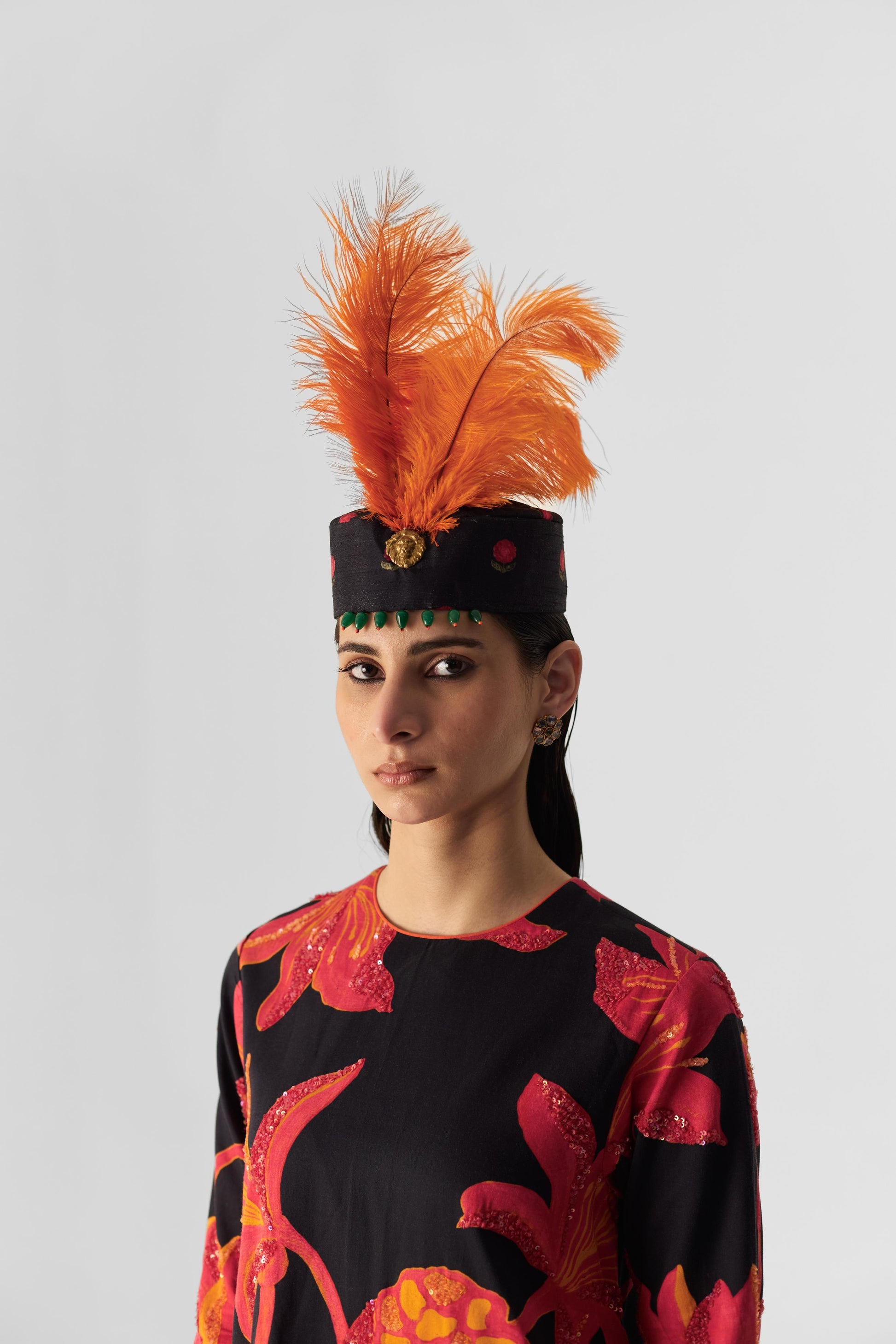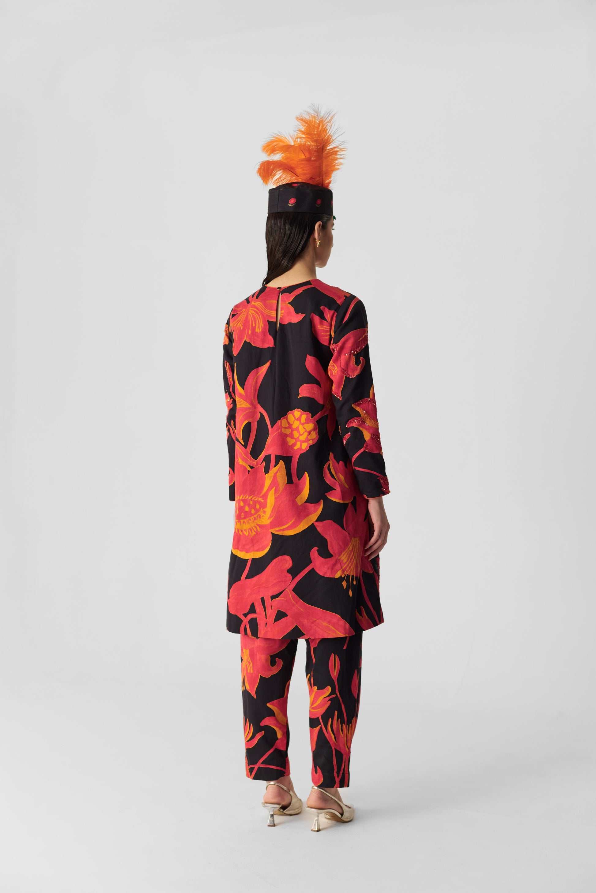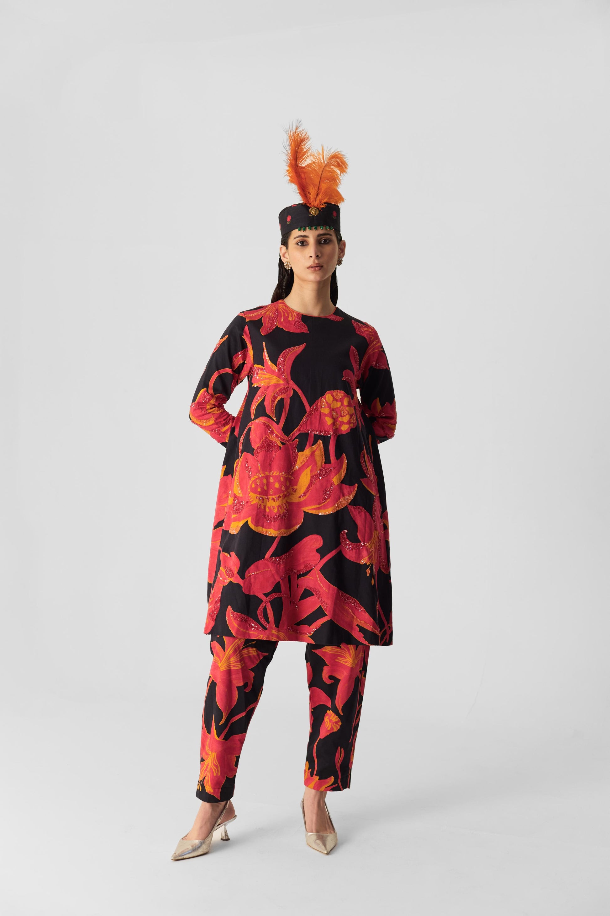 The exquisite Lian Kurta Set, featuring a stunning hand-painted floral print against a bold black backdrop. Crafted from luxurious cotton satin, this ensemble combines style and comfort seamlessly. The kurta showcases intricate sequin hand embroidery on the front and sleeves, adding a touch of elegance. With a round neck and a charming keyhole back finished with fine dori piping, this piece offers a perfect blend of sophistication and comfort. Paired with matching pants, designed with convenient side pockets and a secure zipper and hook closure, this set ensures a flattering fit. Inside, a soft mulmul lining enhances your comfort, making it an ideal choice for any occasion.