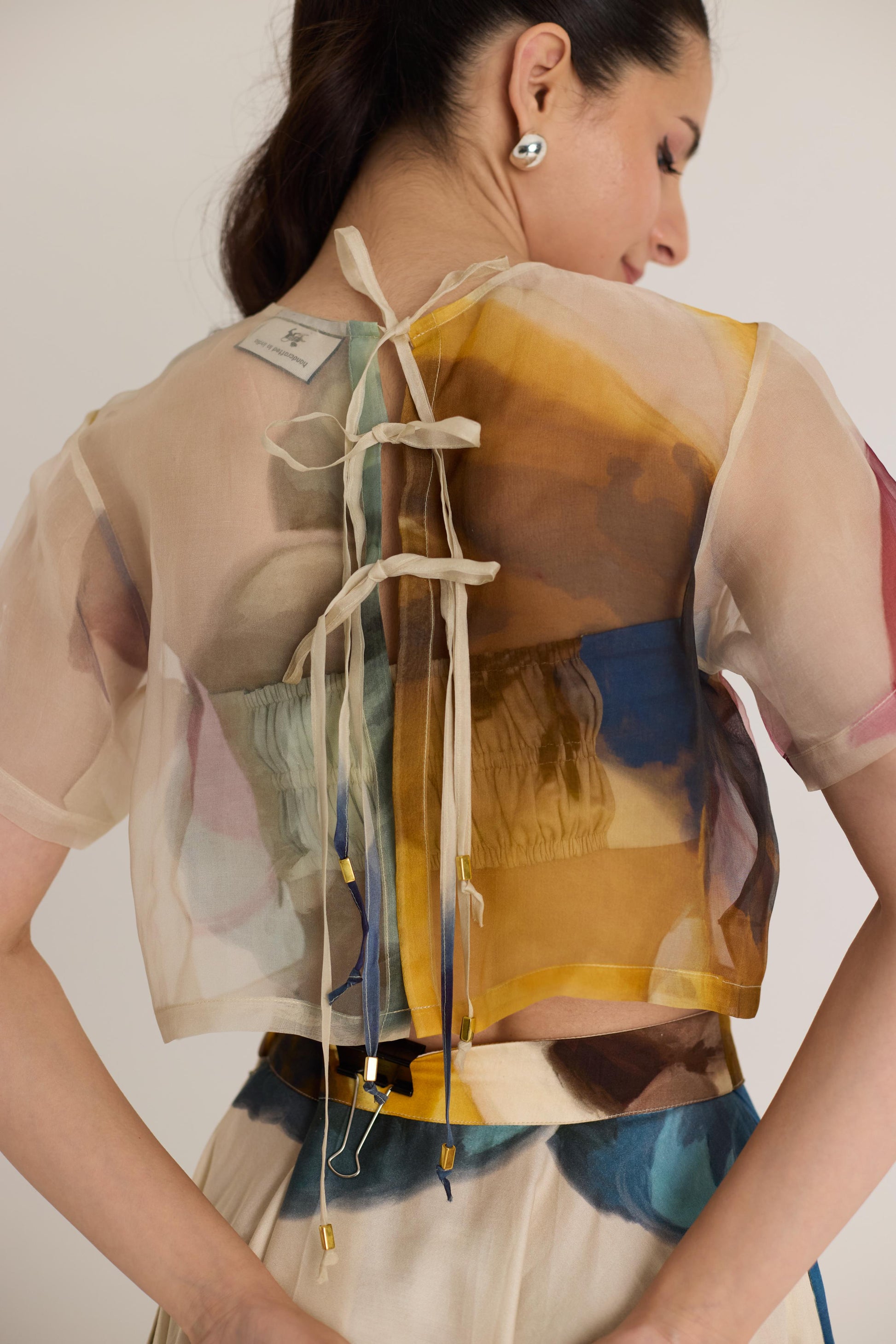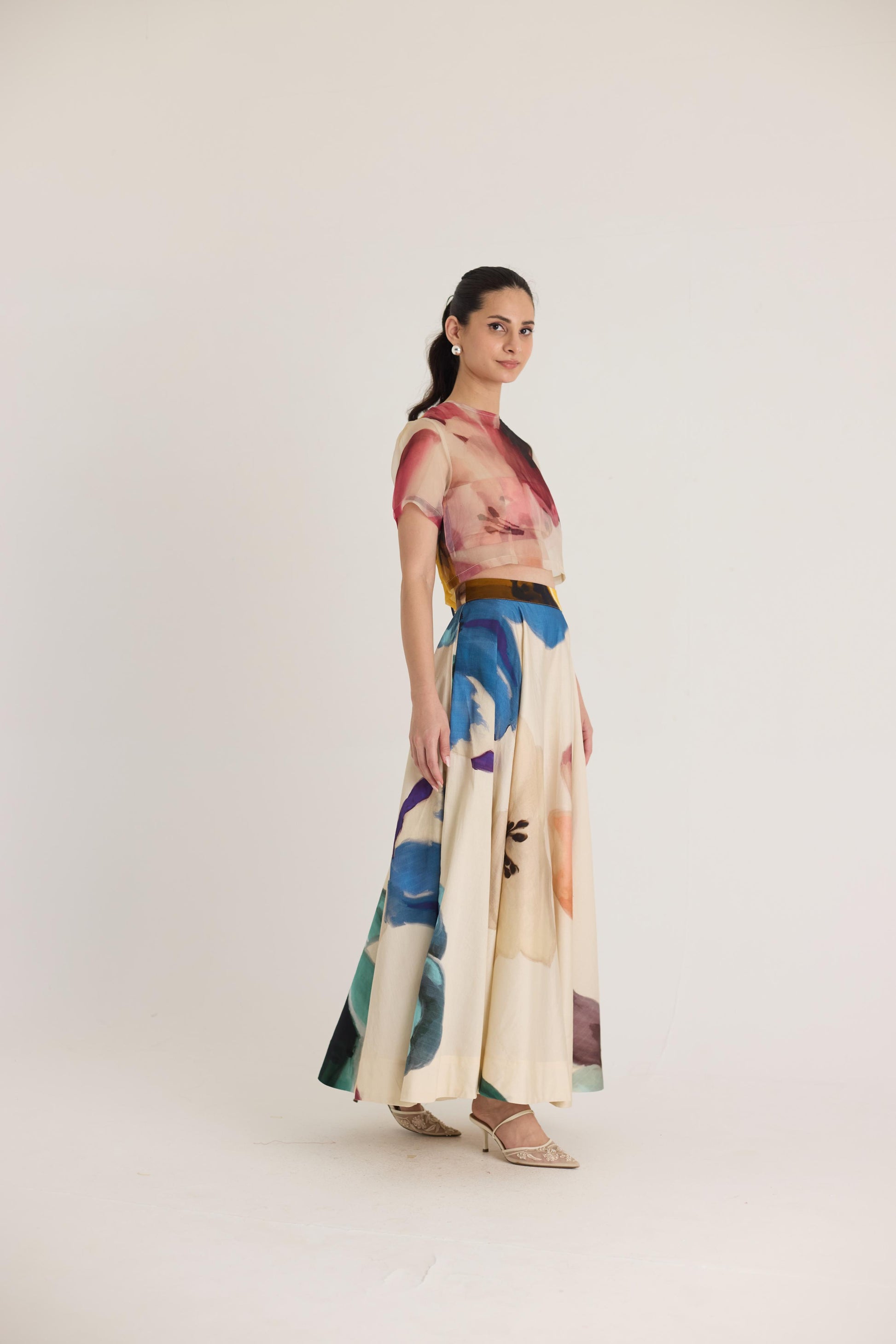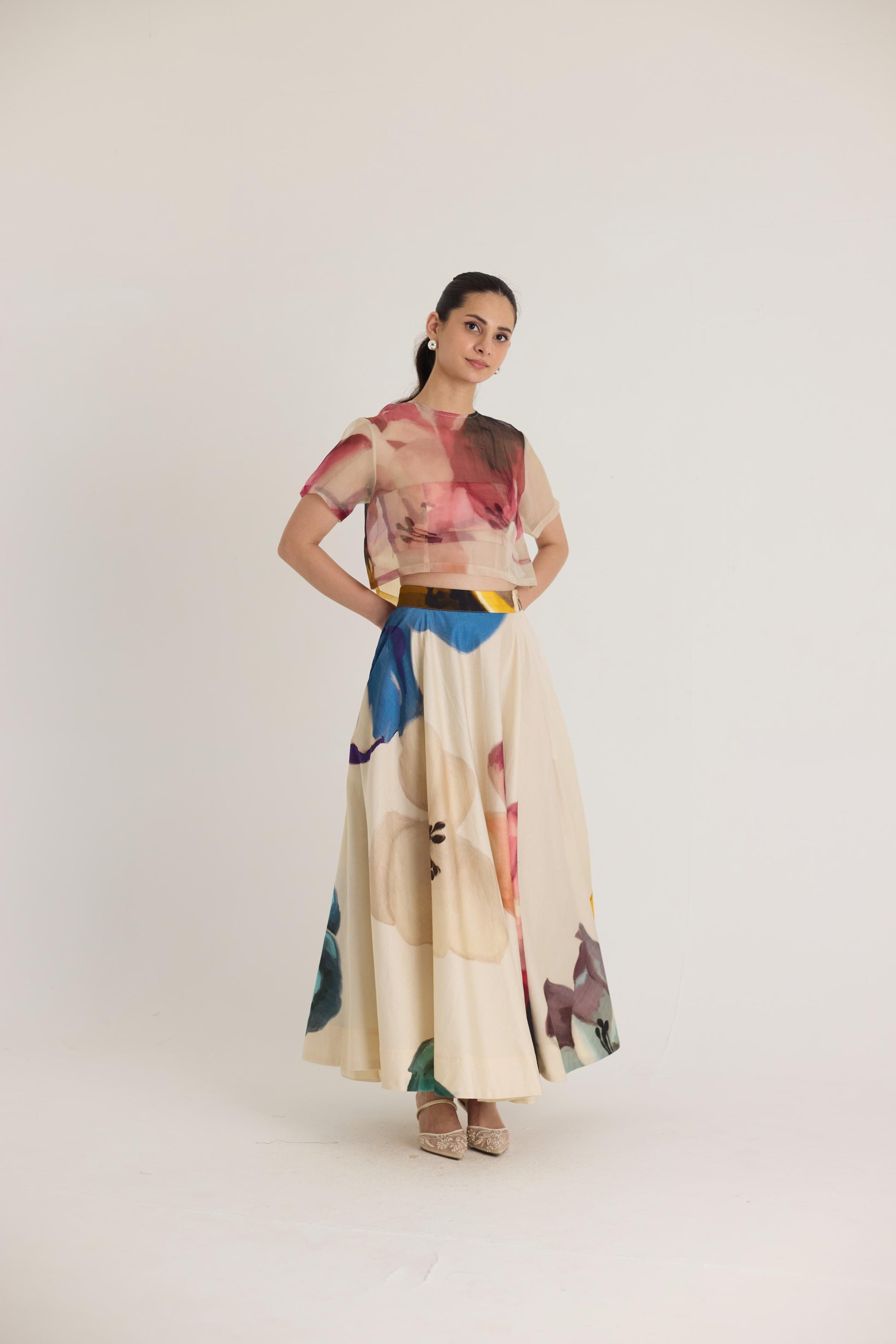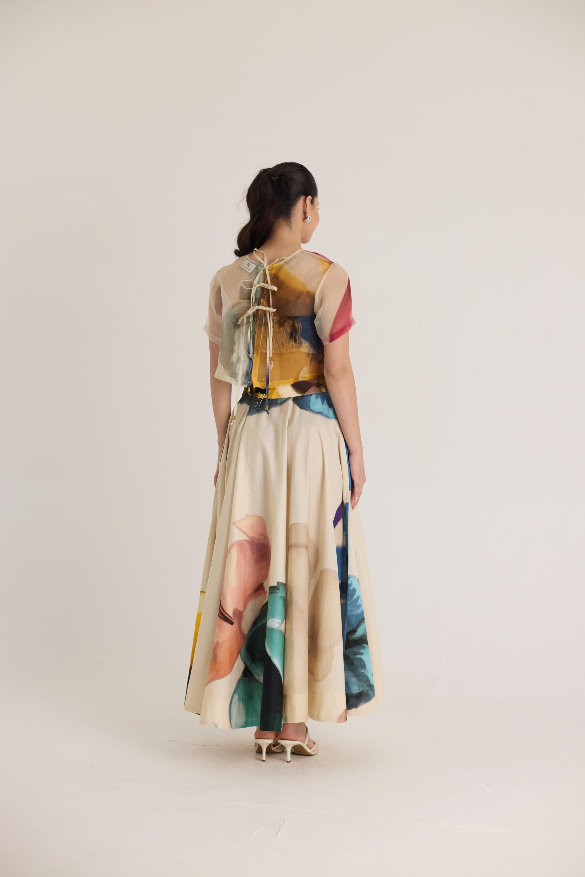 A dreamy co-ord set featuring a sheer crop top layered over a structured bustier and a flowing high-waisted maxi skirt. The delicate organza top adds a modern touch to the classic silhouette, while the abstract watercolor-inspired print brings a bold yet elegant aesthetic.