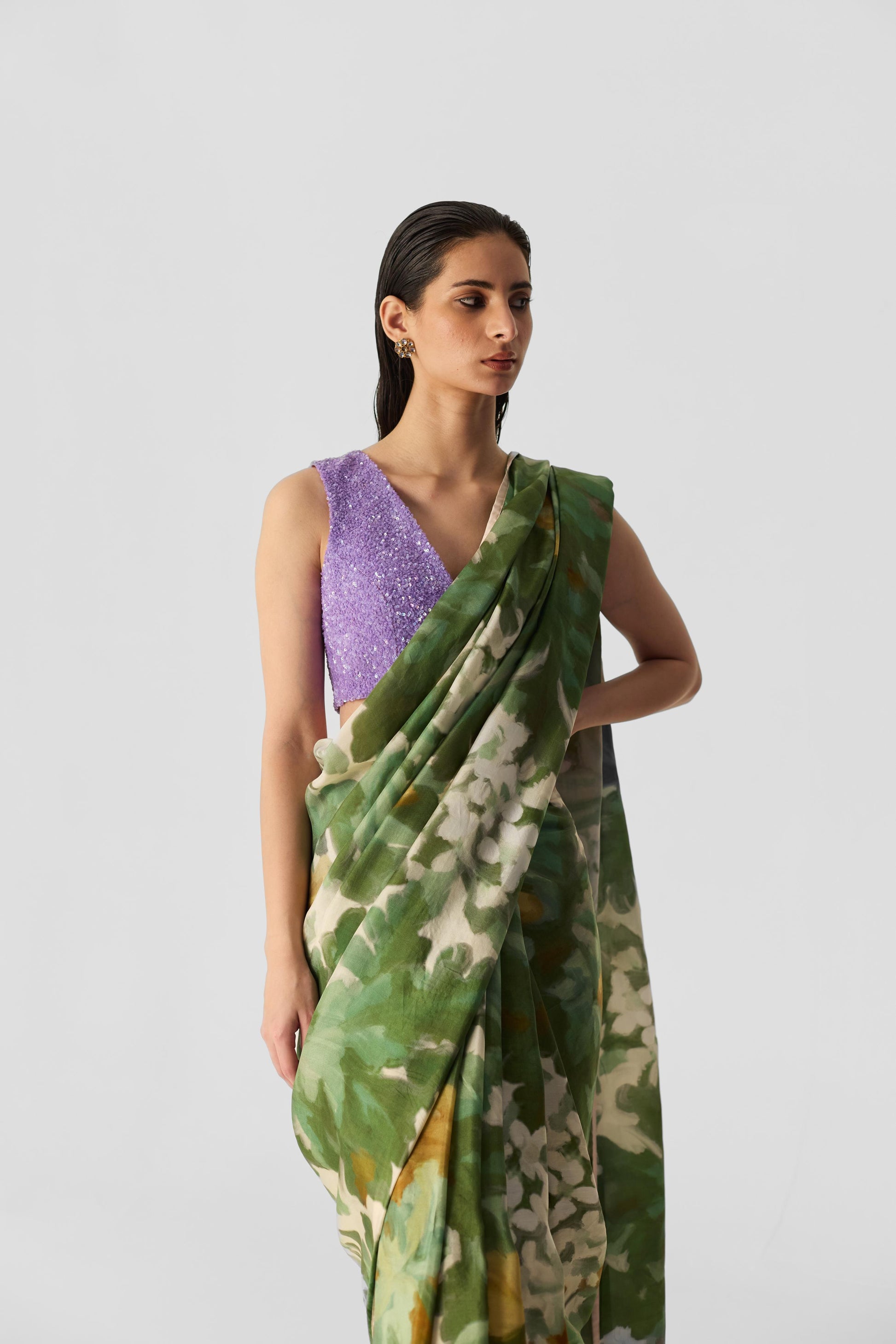 he V-Neck Blouse, beautifully crafted from luxurious crepe fabric. This stunning piece features full hand embroidery adorned with vibrant lilac shade of sequins, evoking a timeless vintage charm perfect for special occasions. Designed with a flattering V-neckline and a convenient front opening secured with hooks and eyes, this blouse seamlessly blends elegance and practicality.