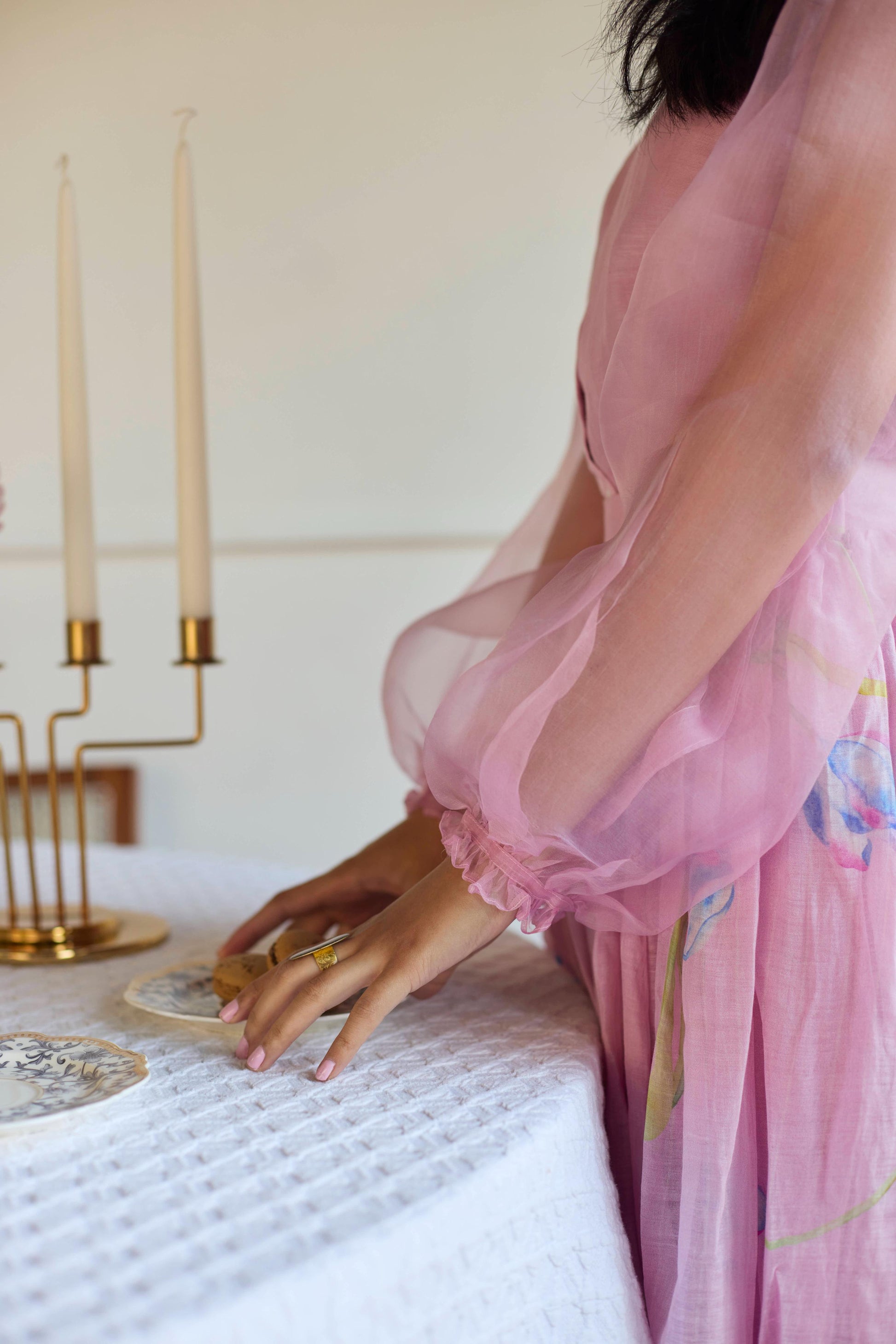 Whispers of sheer sophistication unfold, With organza silk sleeves, light and bold, A blend of texture, charm, and grace, Where timeless craft meets a modern embrace.