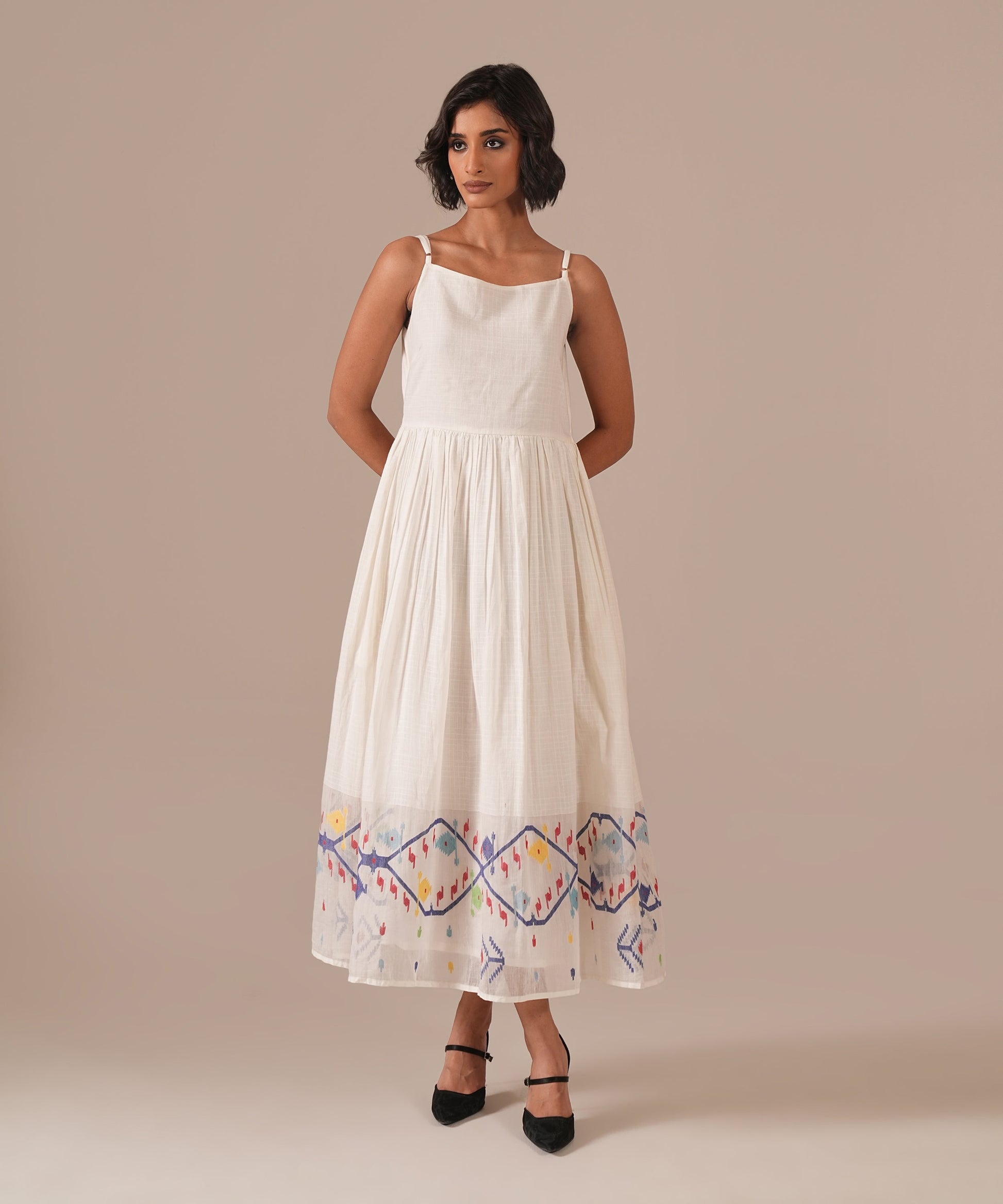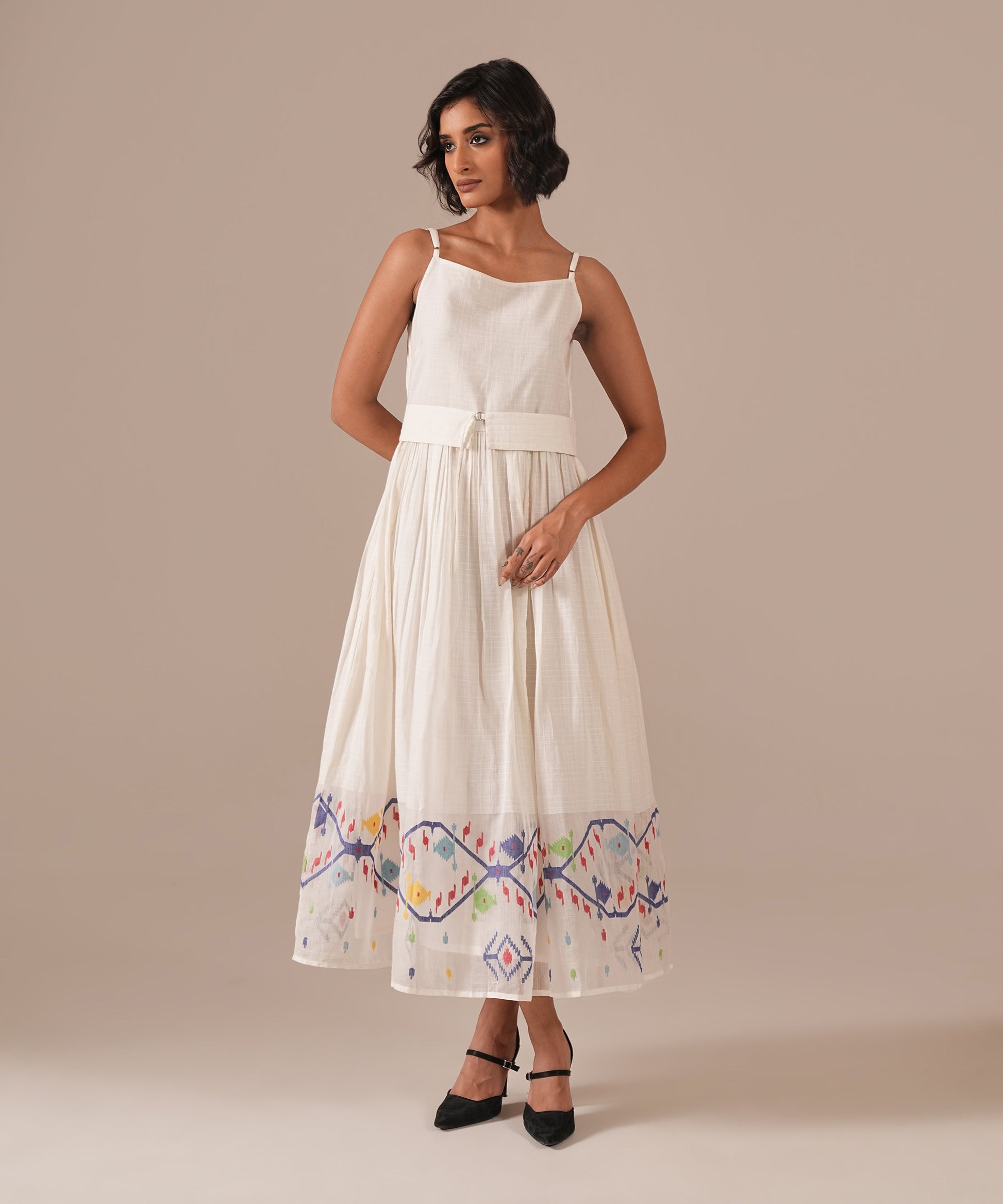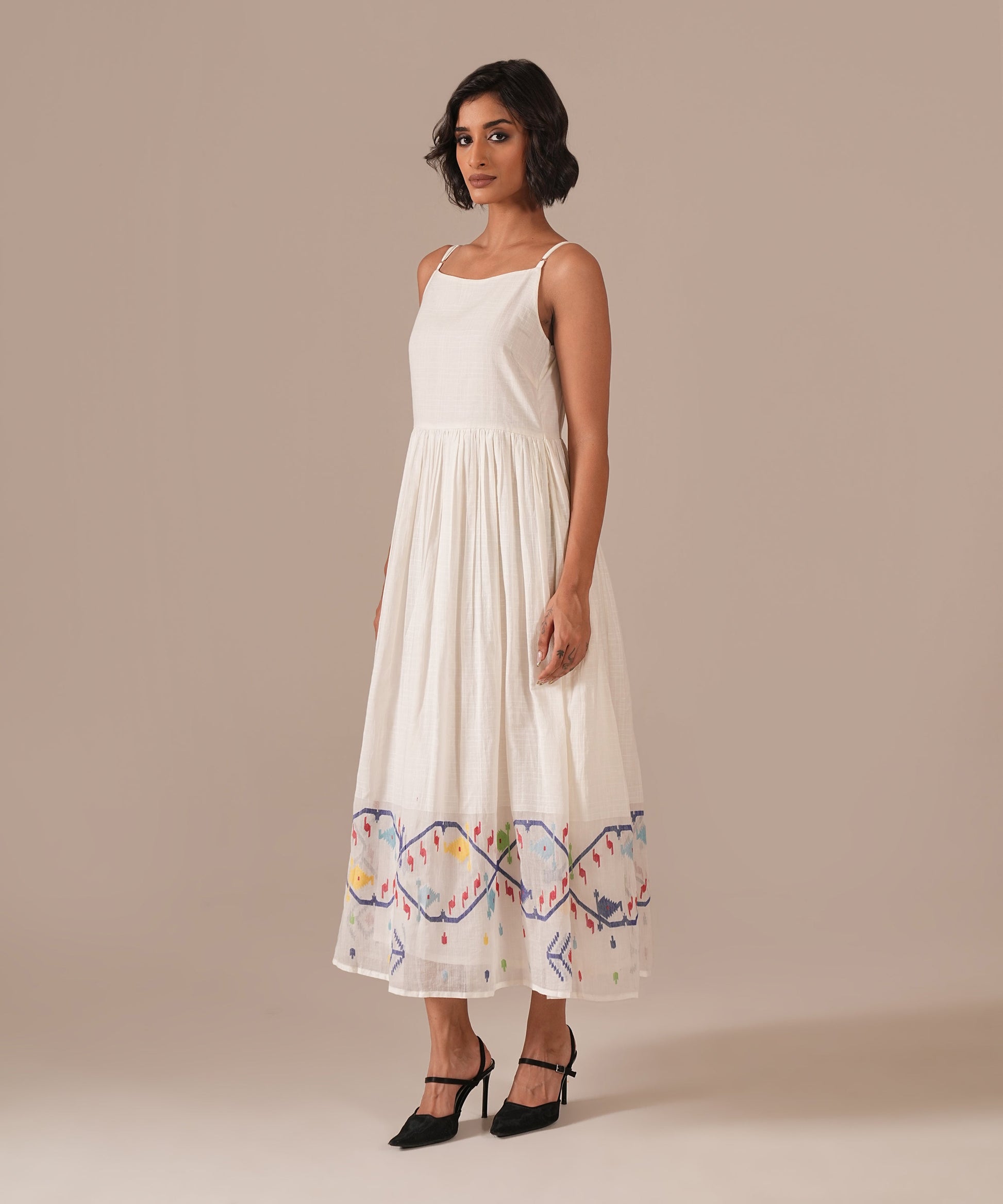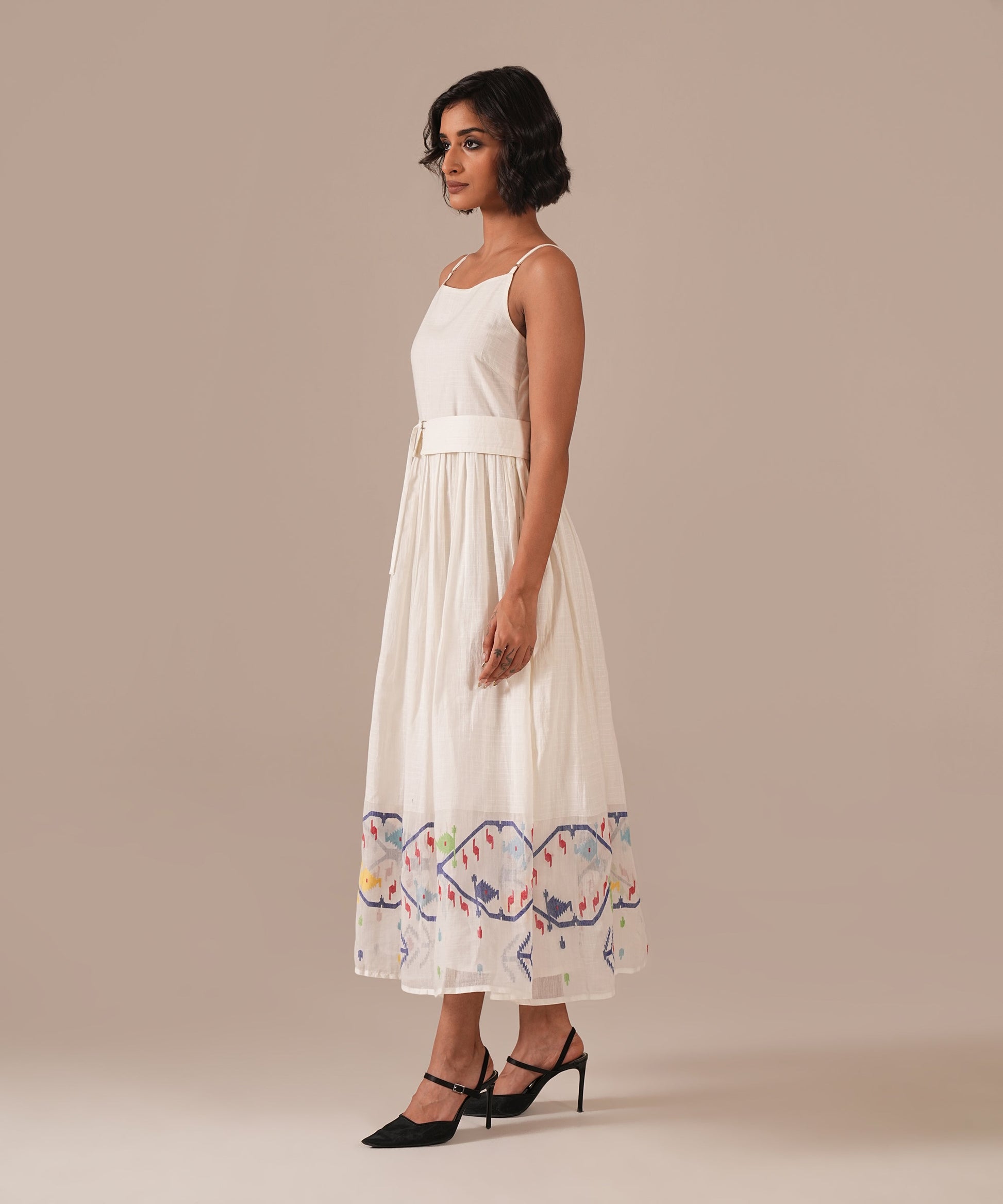 A classic Jamdani dress with a fit-and-flare silhouette, adjustable straps, and back zipper fastening, a timeless addition to a sustainable wardrobe. Handwoven by Indian artisans, it features a signature fabric belt and functional side pockets, blending artisanal craftsmanship with effortless elegance.