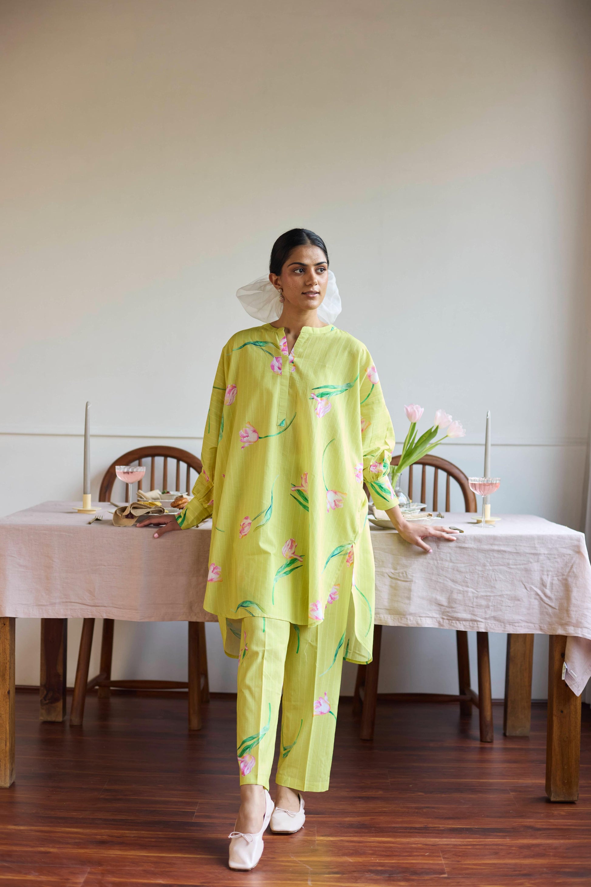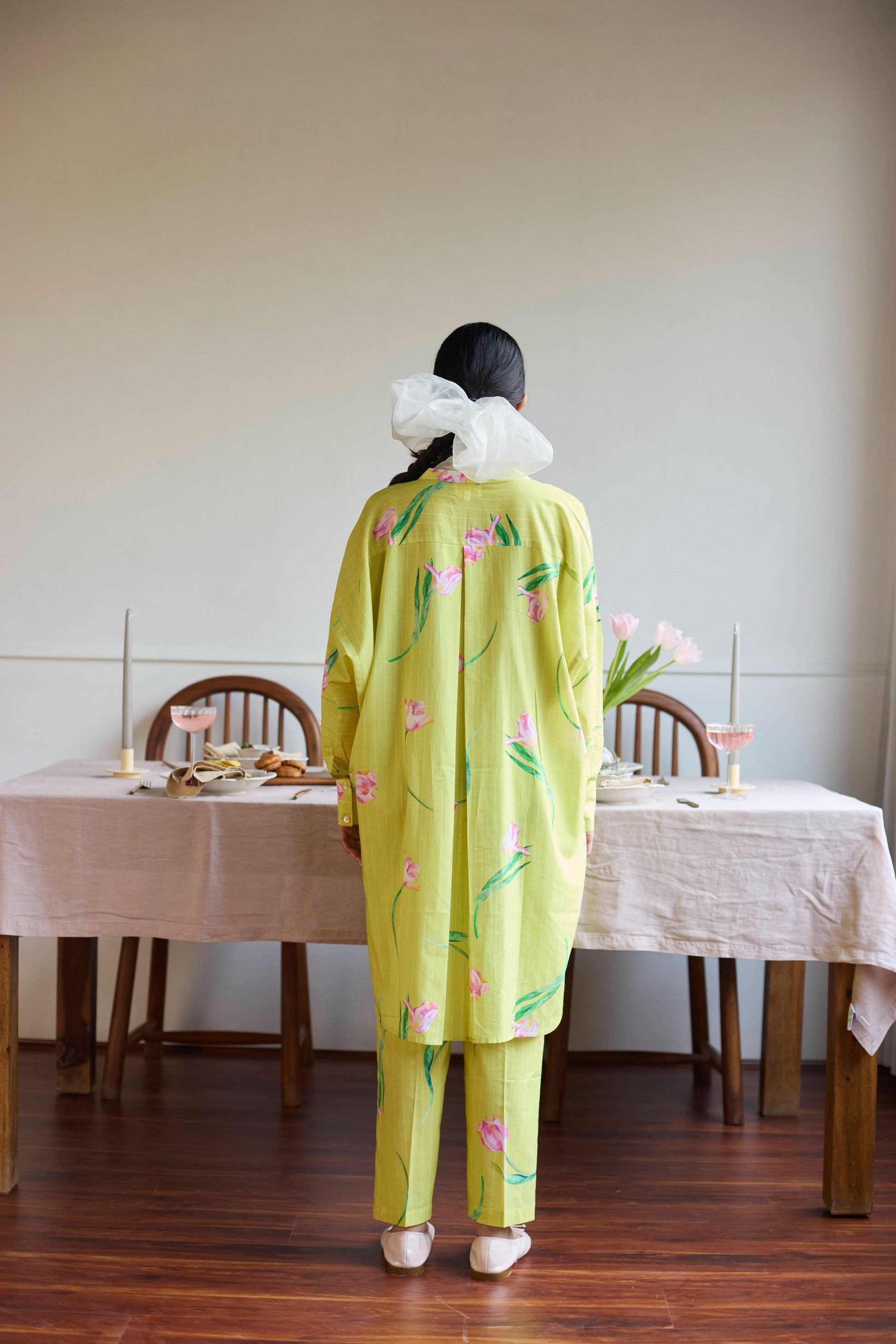 Introducing Our Cotton Anti-fit Co-ord Set, A Single Size That Flows With Ease, Adorned With Tulip Prints, Vibrant And True, A Bloom Of Beauty, Carried By The Breeze.