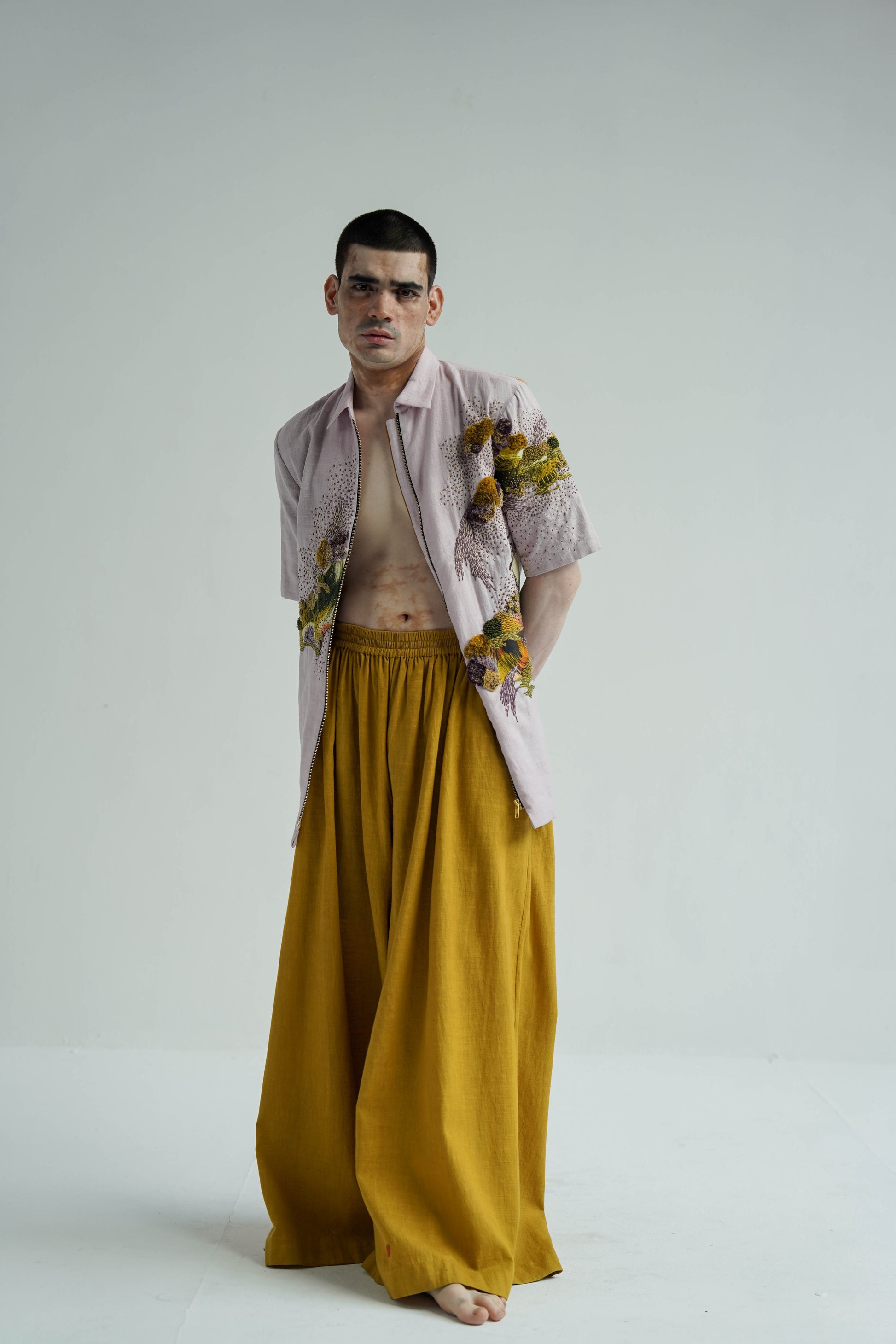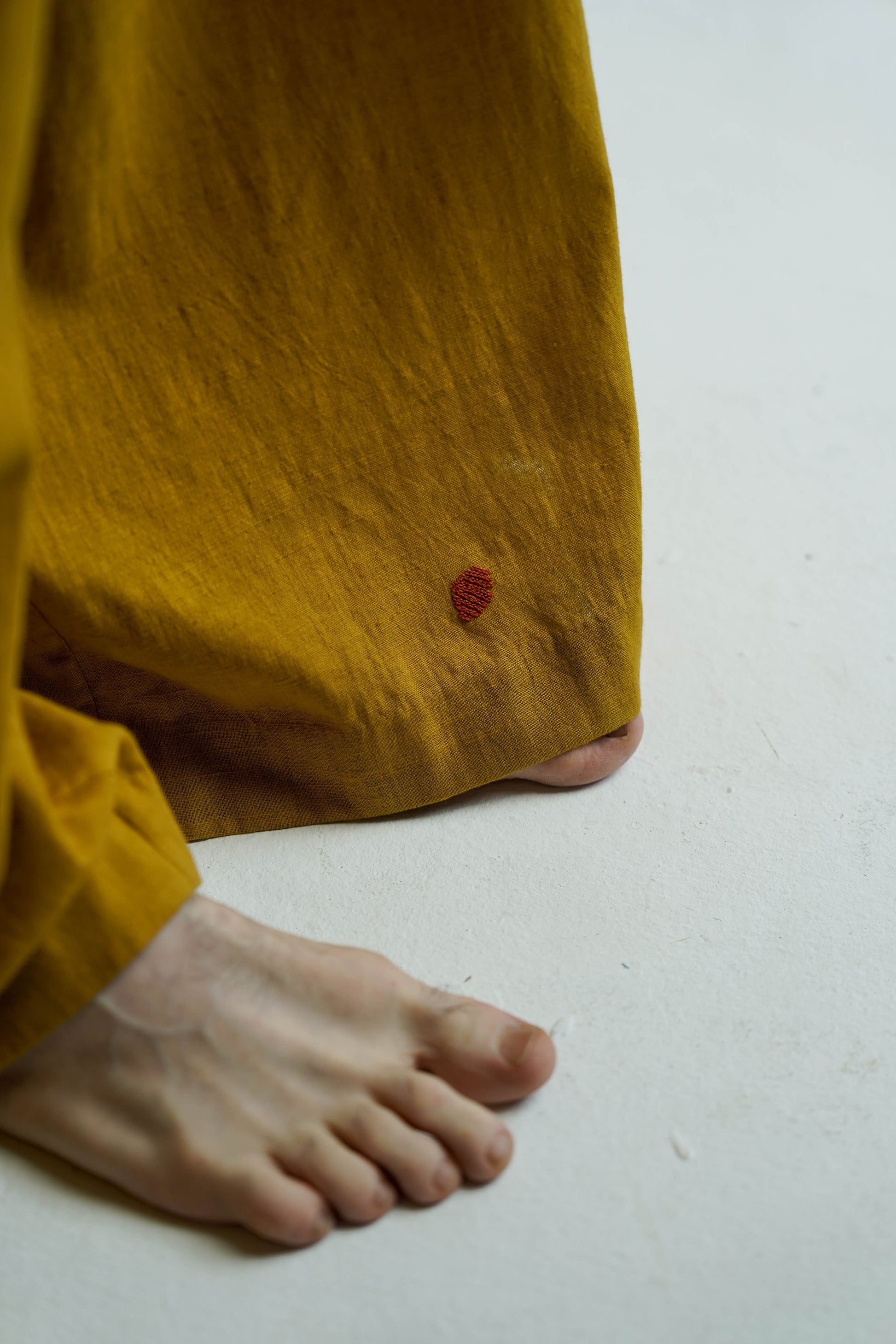 This Lime yellow trouser, crafted from cotton , showcases a hand-dyed lime hue. It's elasticated at the waist and is relaxed fit suitable for all genders.