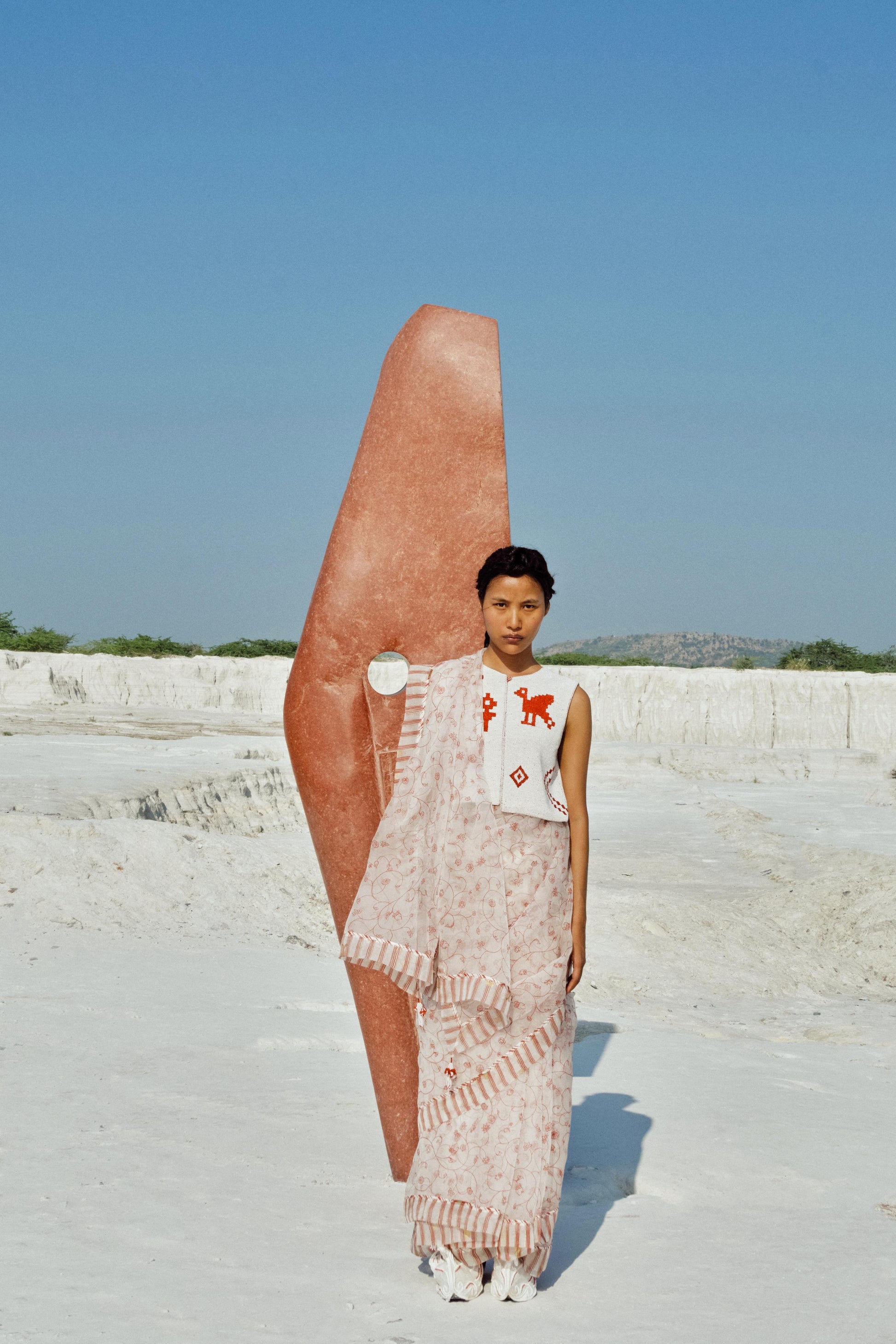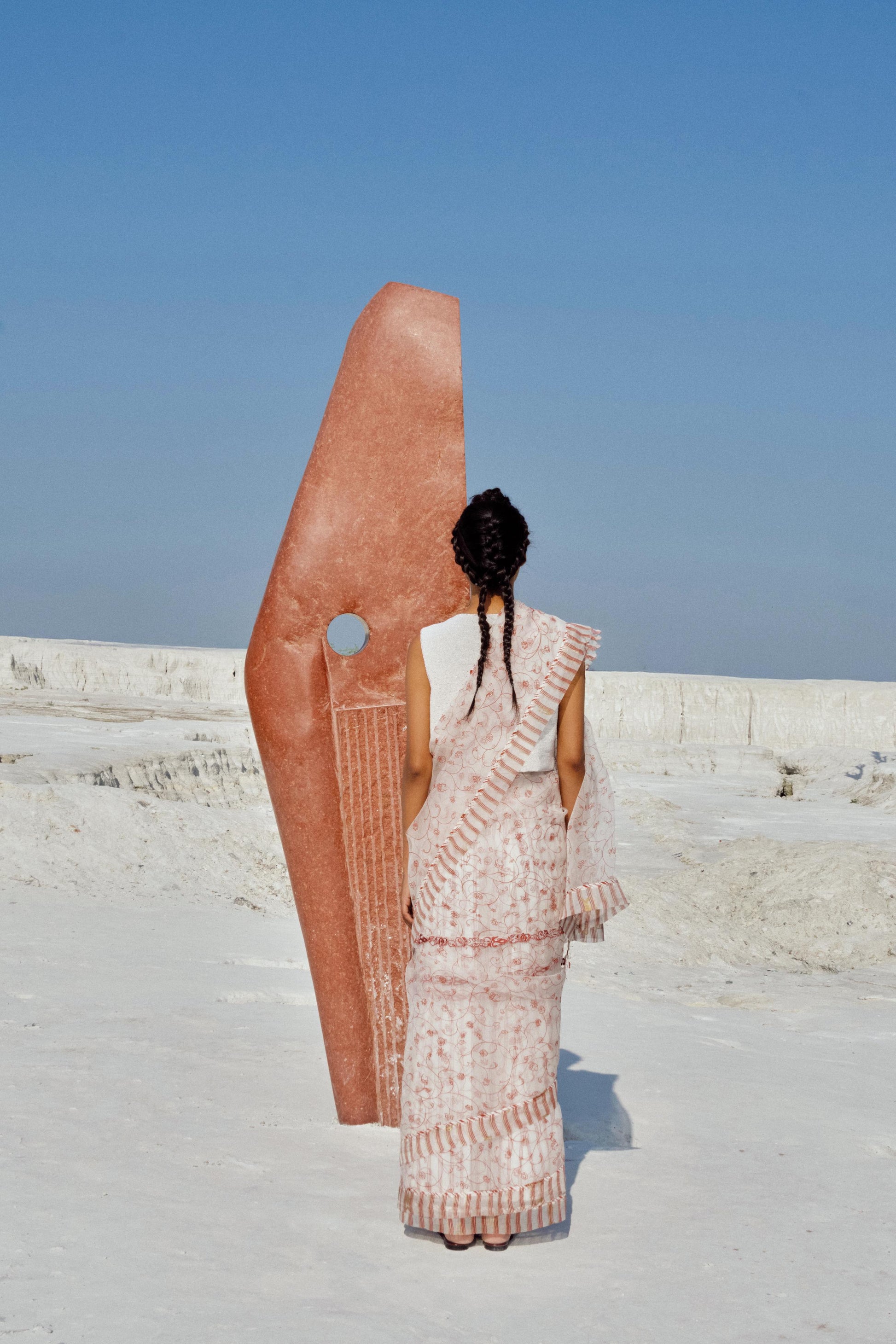 The Liz Organza Saree, crafted from hand-screen-printed silk organza, is a study in lightness and refined artistry. Intricate lace runs throughout its length, while handmade beaded tassels lend delicate, shimmering accents. Binding details trace the borders, adding subtle structure to the flowing fabric. Each lace motif, stitch, and tassel has been executed with hours of careful labour, making this saree a timeless embodiment of sophistication, grace, and artisanal mastery.