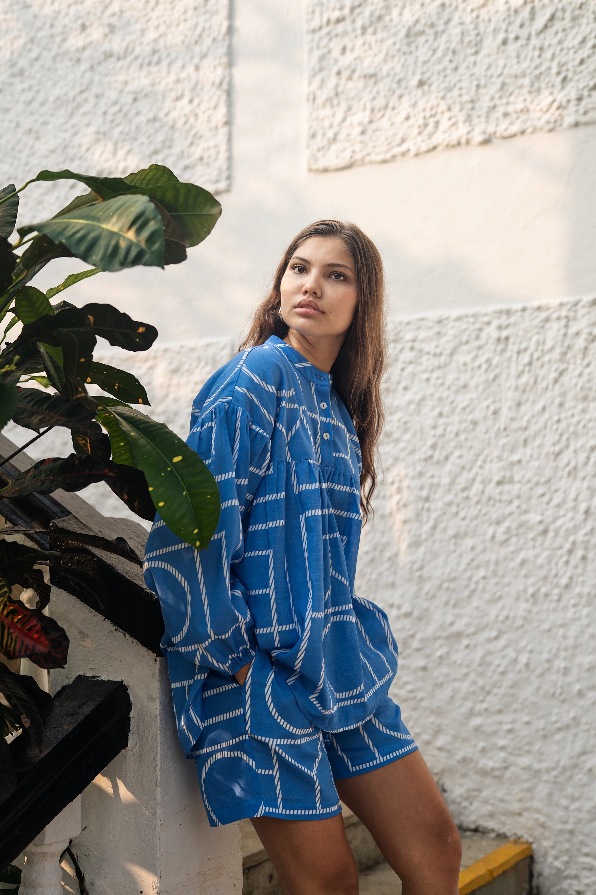 Lolo set is made from our cotton linen fabrication in geometric print. It has a relaxed fit gathered top paired with shorts.