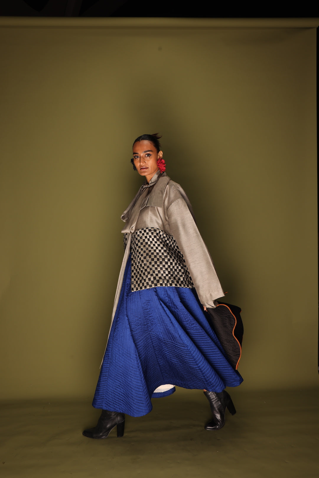 As if stitched with memory. A sculptural silk skirt, delicately quilted in-house with intricate detail — almost like felt, but softer, lighter, and entirely handmade.