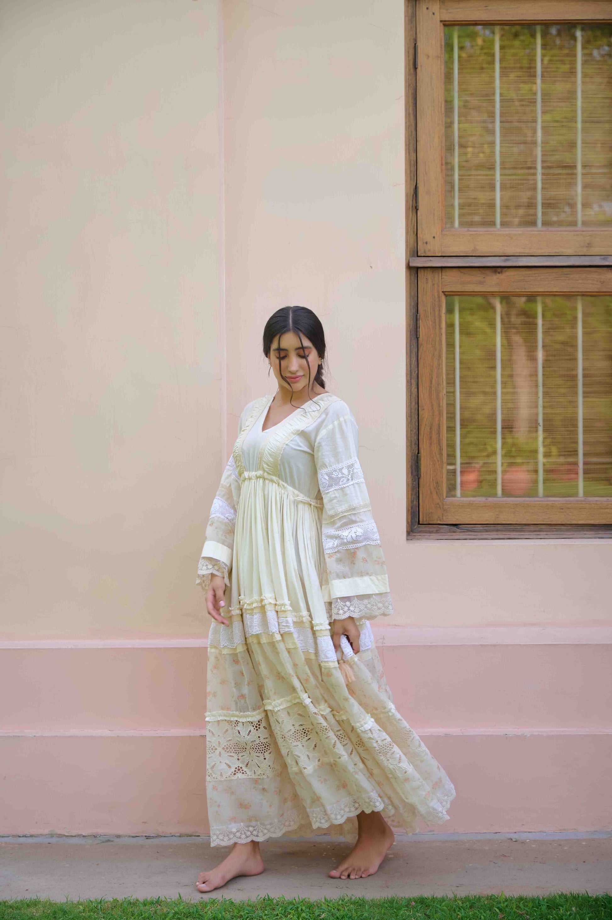 Introducing our Dress, a masterpiece of elegance and craftsmanship, designed to enchant with its intricate details. This dress features beautiful laces and cutwork fabrics, showcasing a harmonious blend of printed Chanderi and solid fabrics that create a captivating contrast. Scallop lace adorns the hem and sleeves, adding a touch of femininity and grace. Knots on the neckline provide a charming accent, enhancing its delicate allure. For adjustable waist definition, heart-shaped tassels are attached to a string, allowing for a personalized fit and adding whimsical charm.