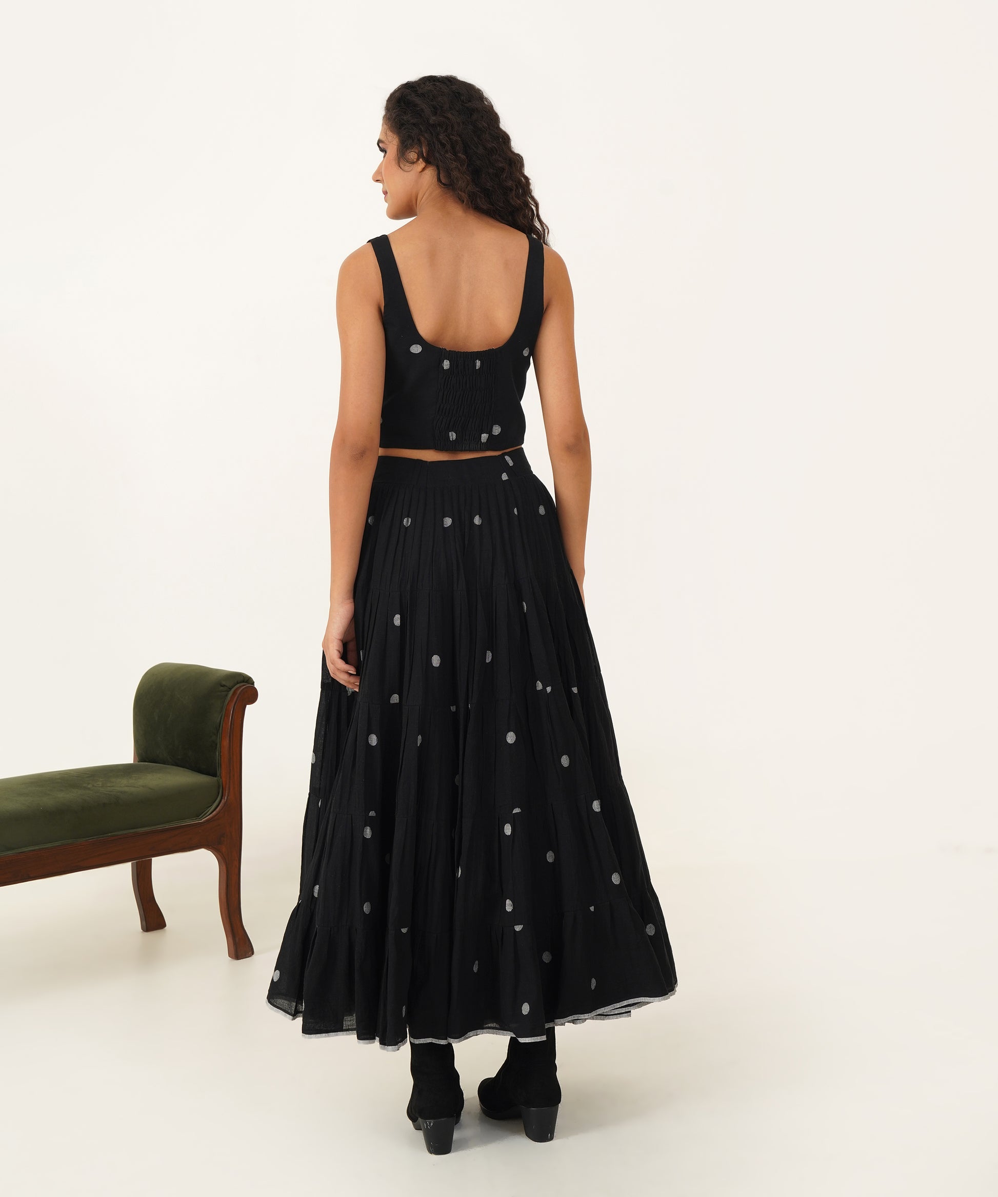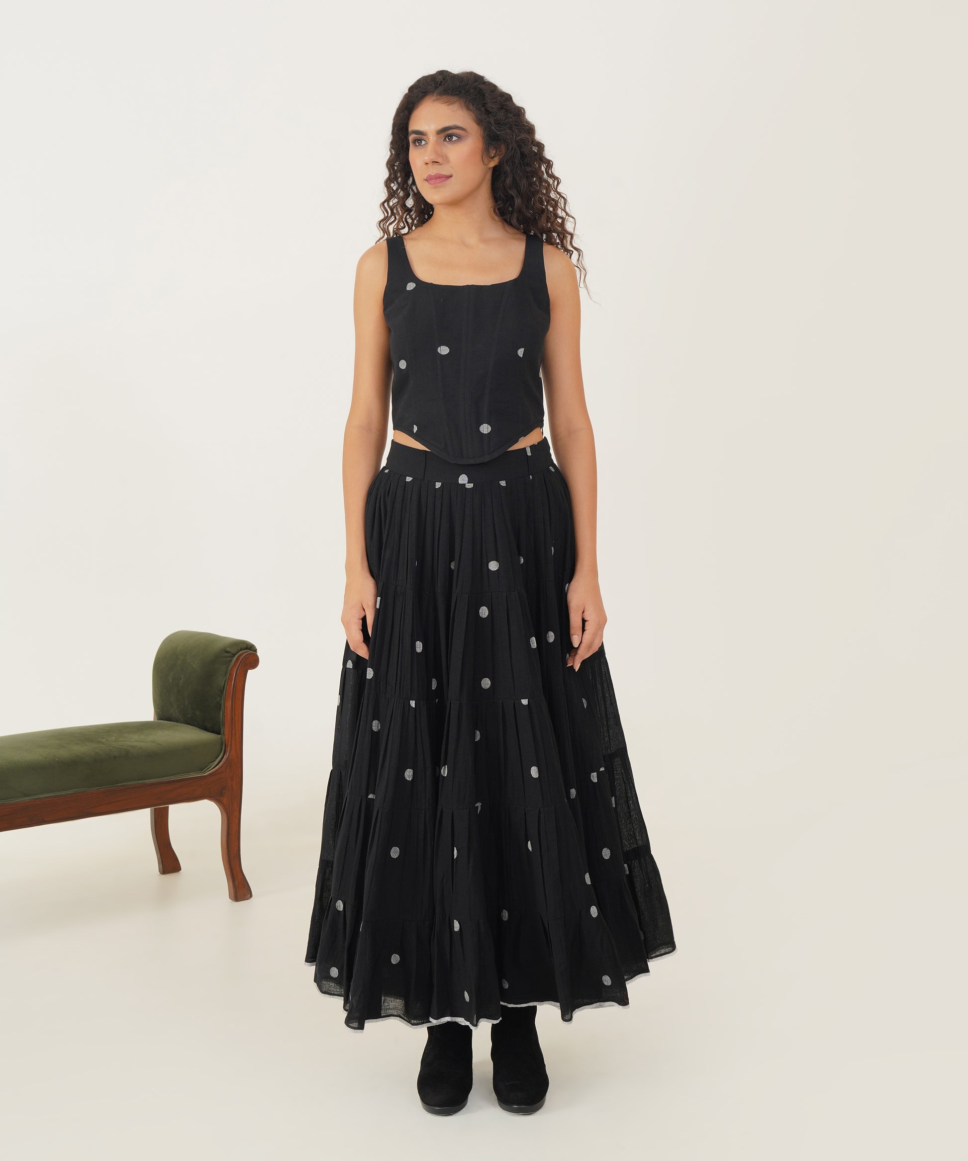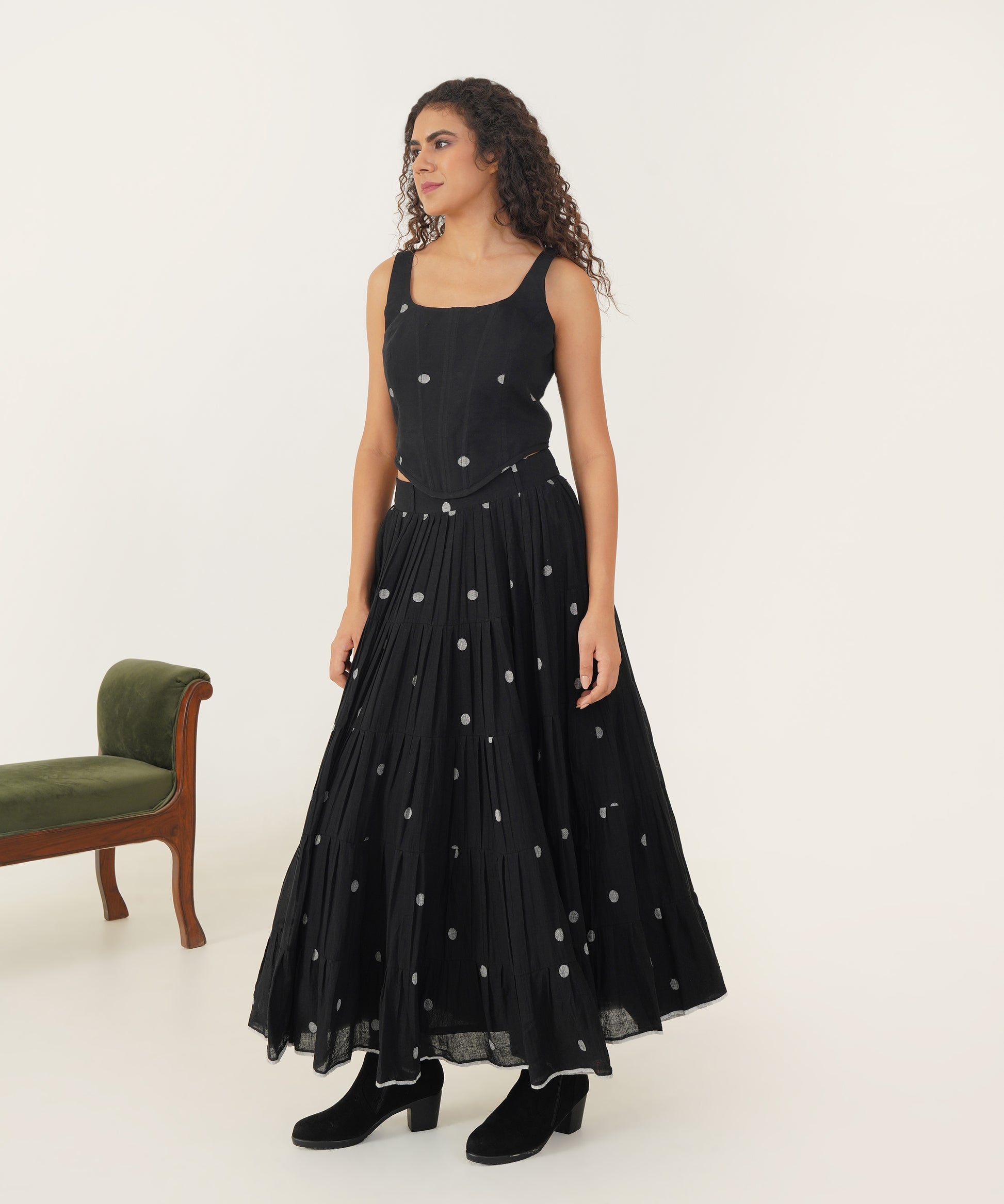 This exquisite ensemble combines elegance and practicality with a voluminous tiered skirt that sways beautifully and includes convenient side pockets. The corset top, with its dramatic deep square neckline, is both striking and sophisticated. Designed for a flawless fit, it features an elasticated back and a side zipper fastening. Together, these elements create a flattering silhouette that seamlessly merges style and comfort for any special occasion.