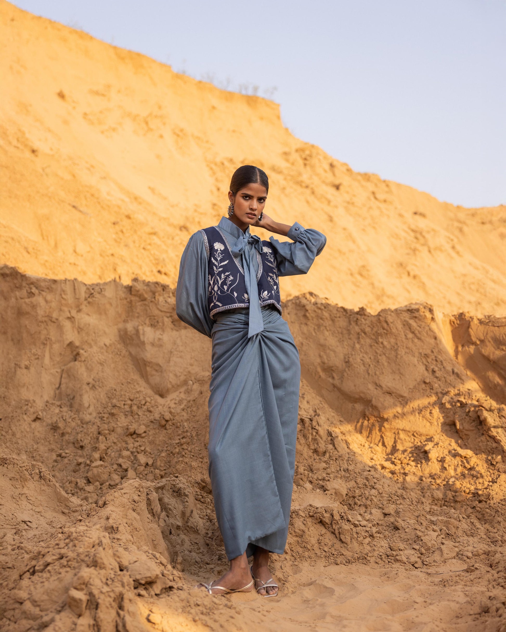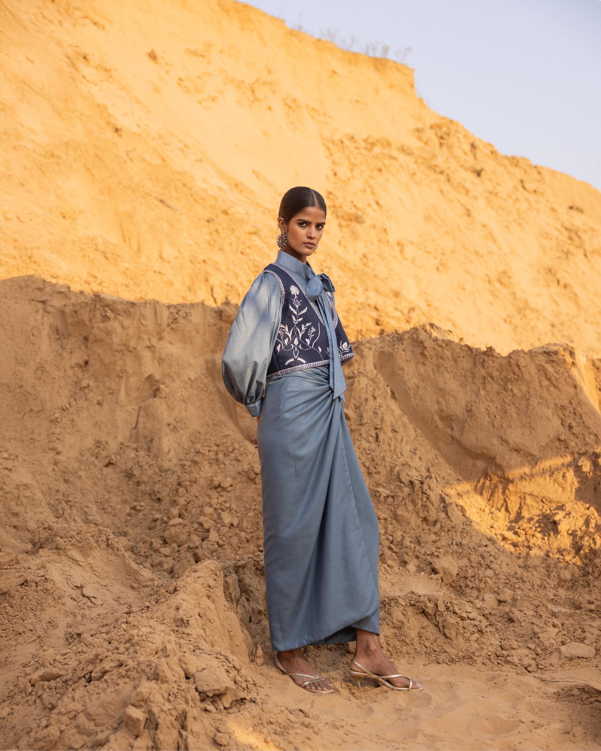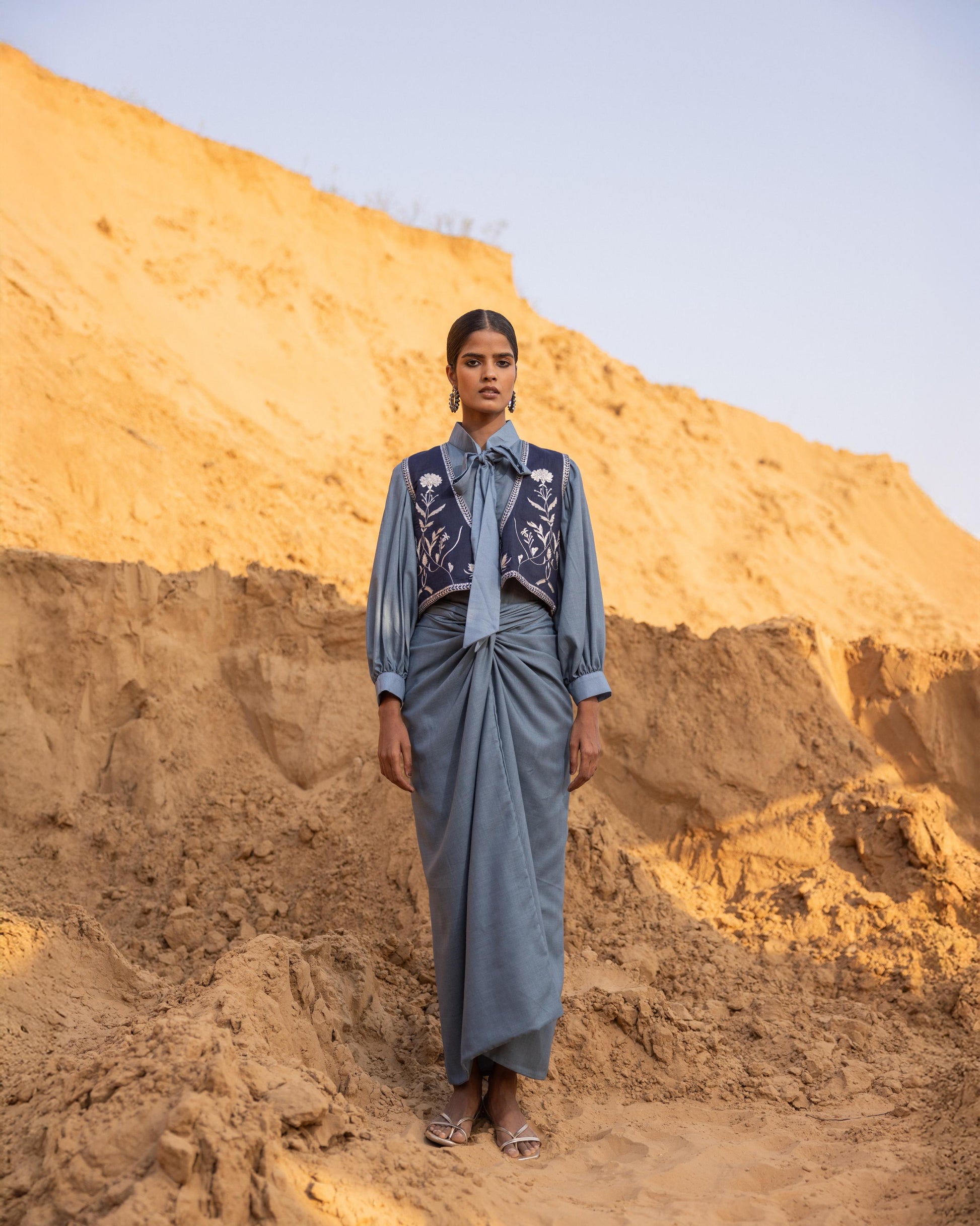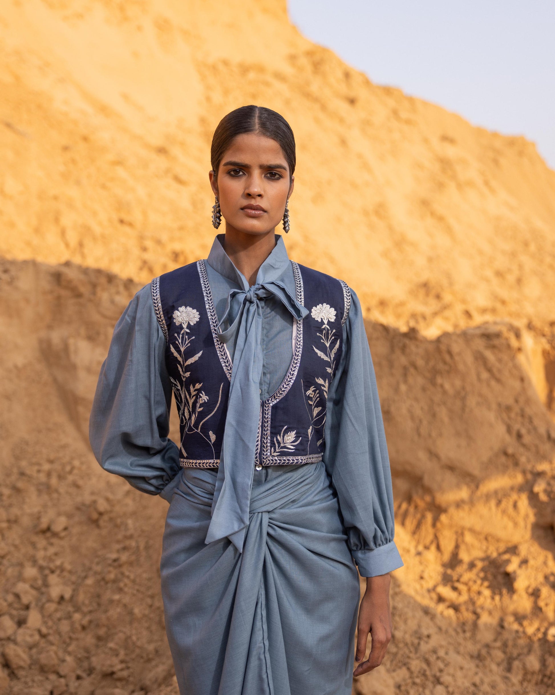 A chic tie-neck top paired with a short waistcoat featuring intricate embroidery, enhanced with sequins and delicate metalwork. A stylish ensemble that blends contemporary silhouettes with artisanal detailing for a sophisticated, standout look.