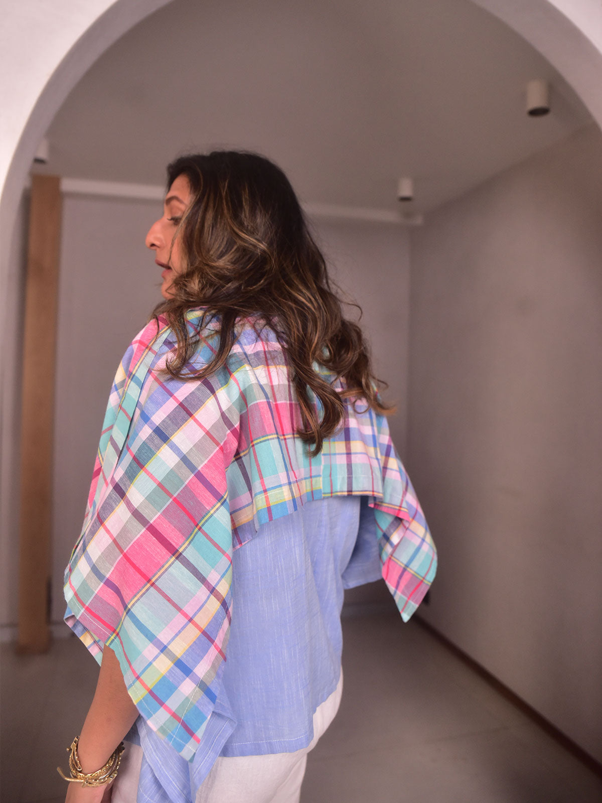 Crafted in our exclusive multicoloured checks printed cotton and light blue cotton chambray, this patchwork oversized shirt stands out with its relaxed fit, button-down front, and flared back yoke. Perfect for travel days or exploring new destinations, it offers both comfort and personality. Style it with white trousers or denim shorts for an effortlessly chic, on-the-go look.