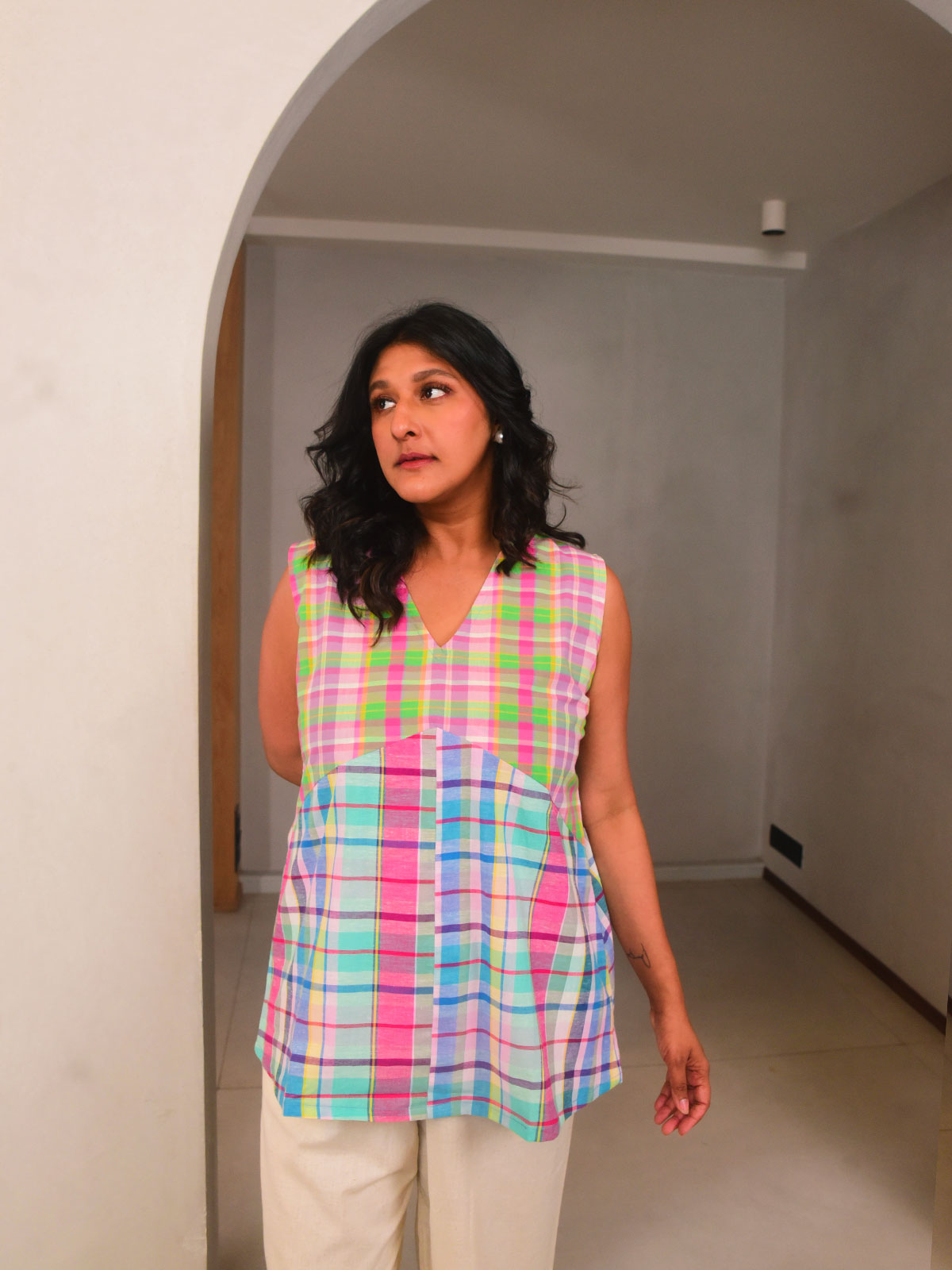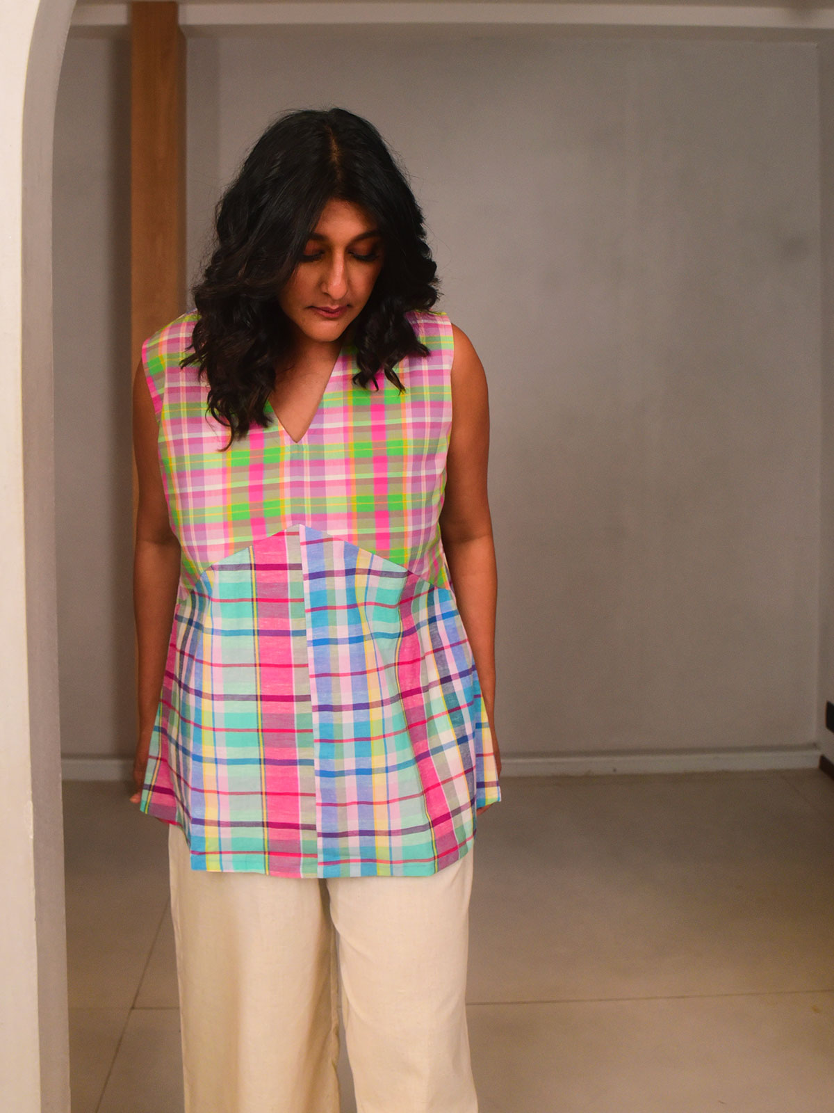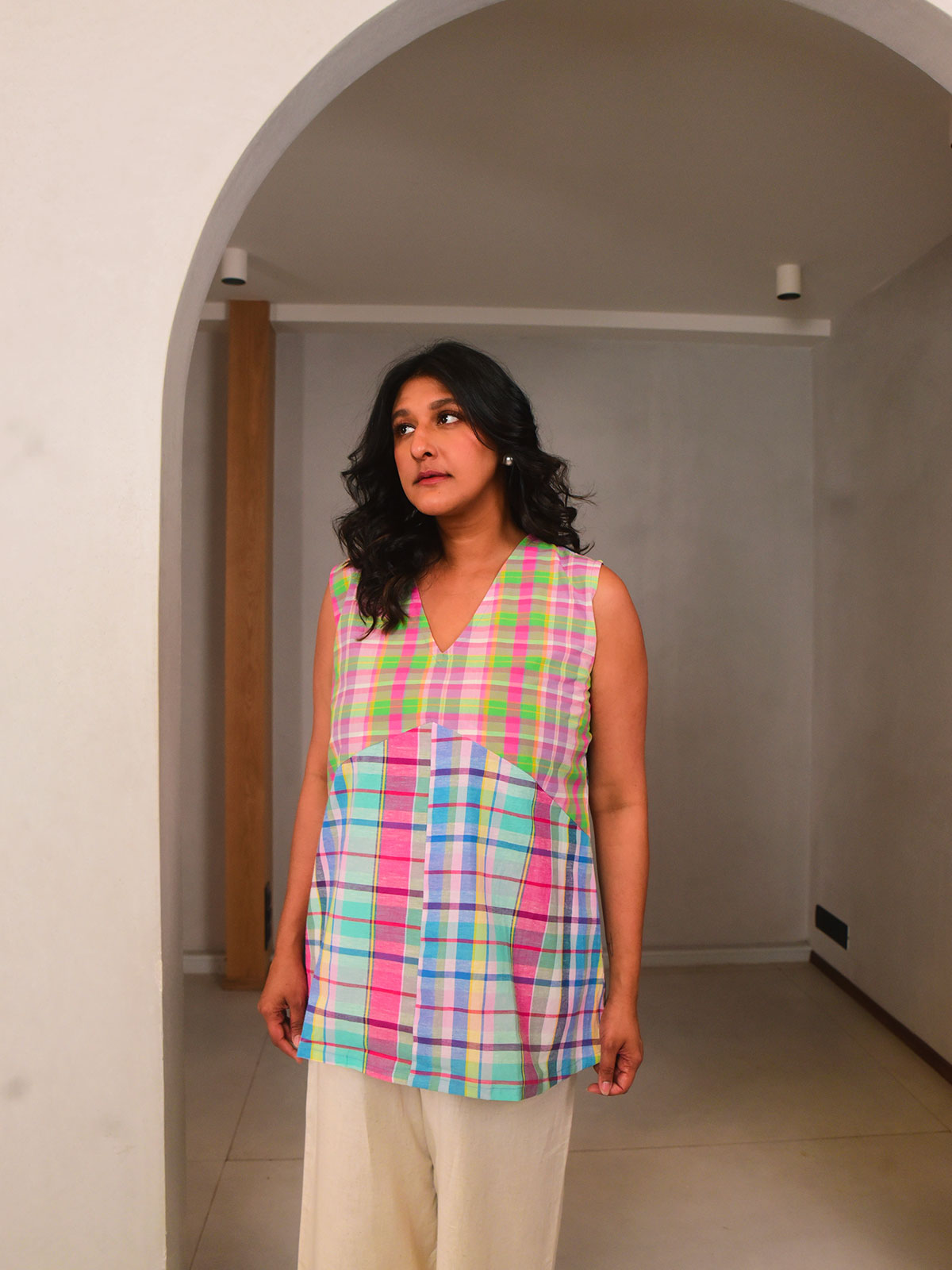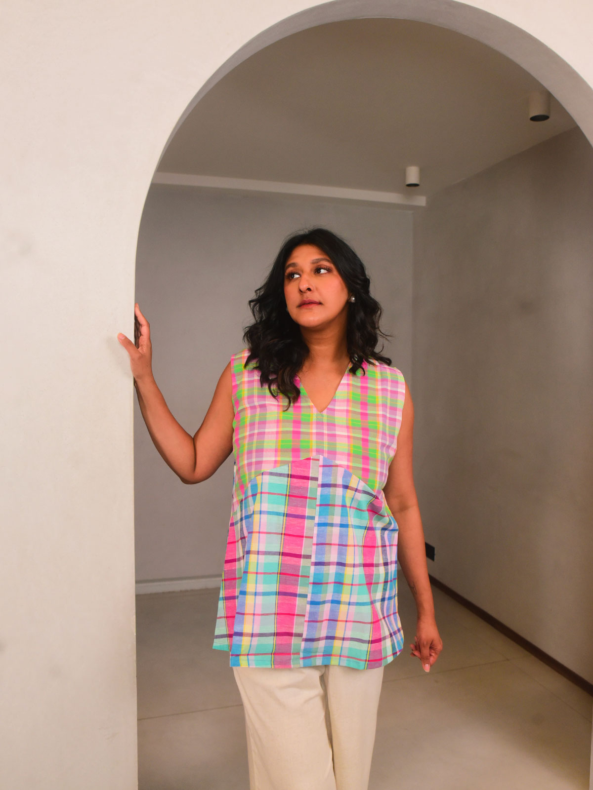 An easygoing summer staple, this sleeveless top features a playful mix of our exclusive pink and blue checkered cottons. Designed with subtle paneling for shape and ease, its relaxed silhouette makes it endlessly versatile. Pair it with trousers, denims, or shorts for a cheerful, laid-back look.