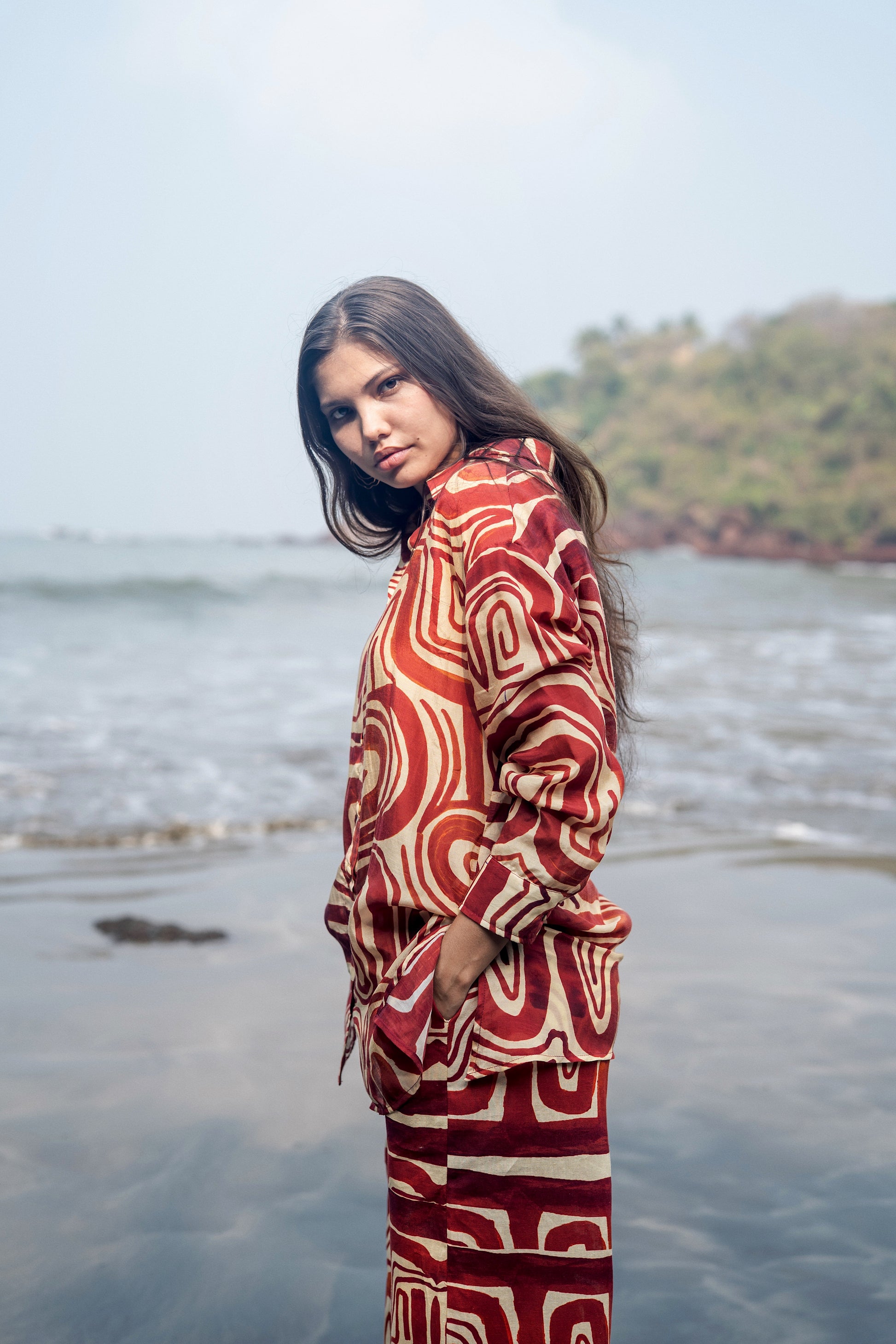 The Maria coord set is made from our cotton silk fabrication for shirt and linen cotton fabrication for pants which is printed in our zombie print. It is the most comfortable lounge wear set one can have for the season.
