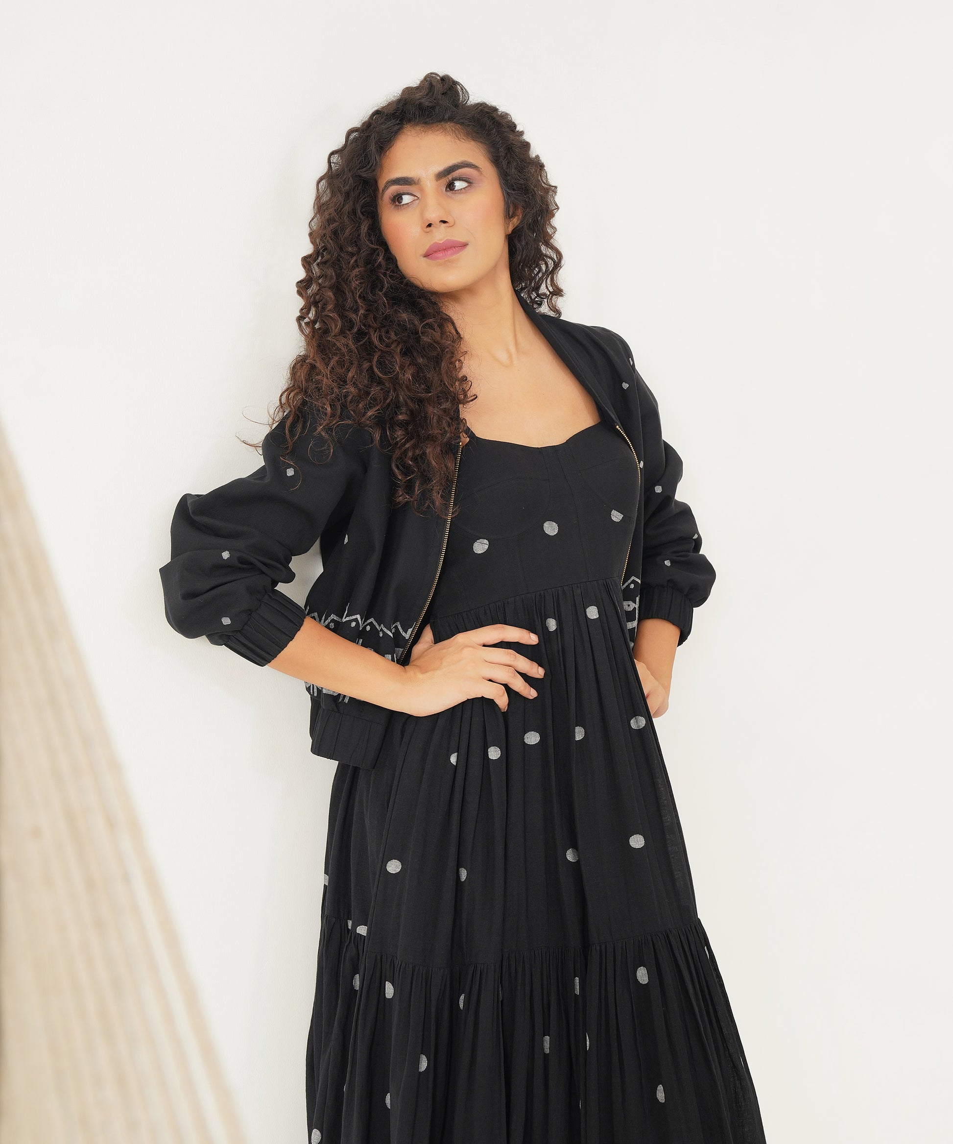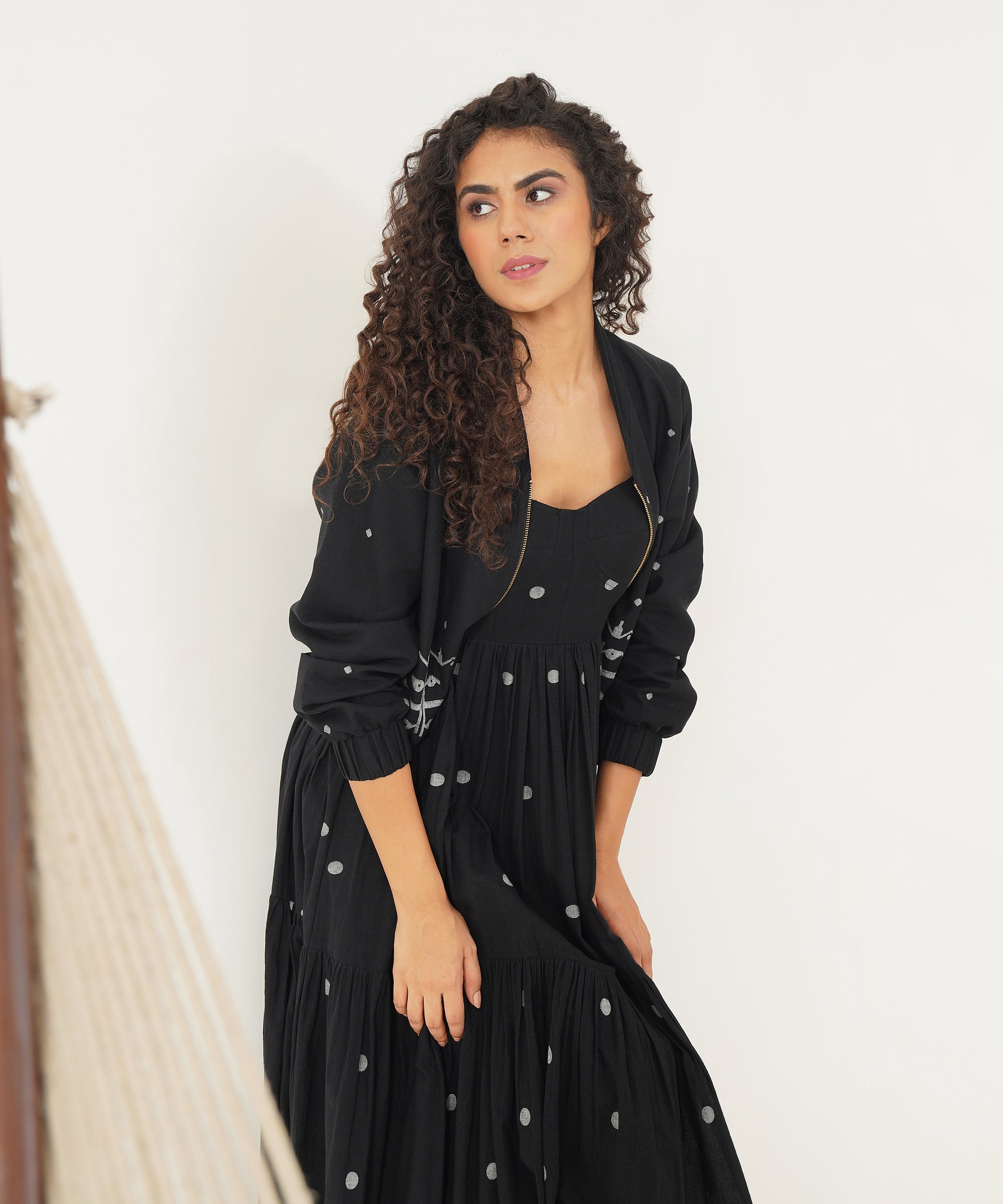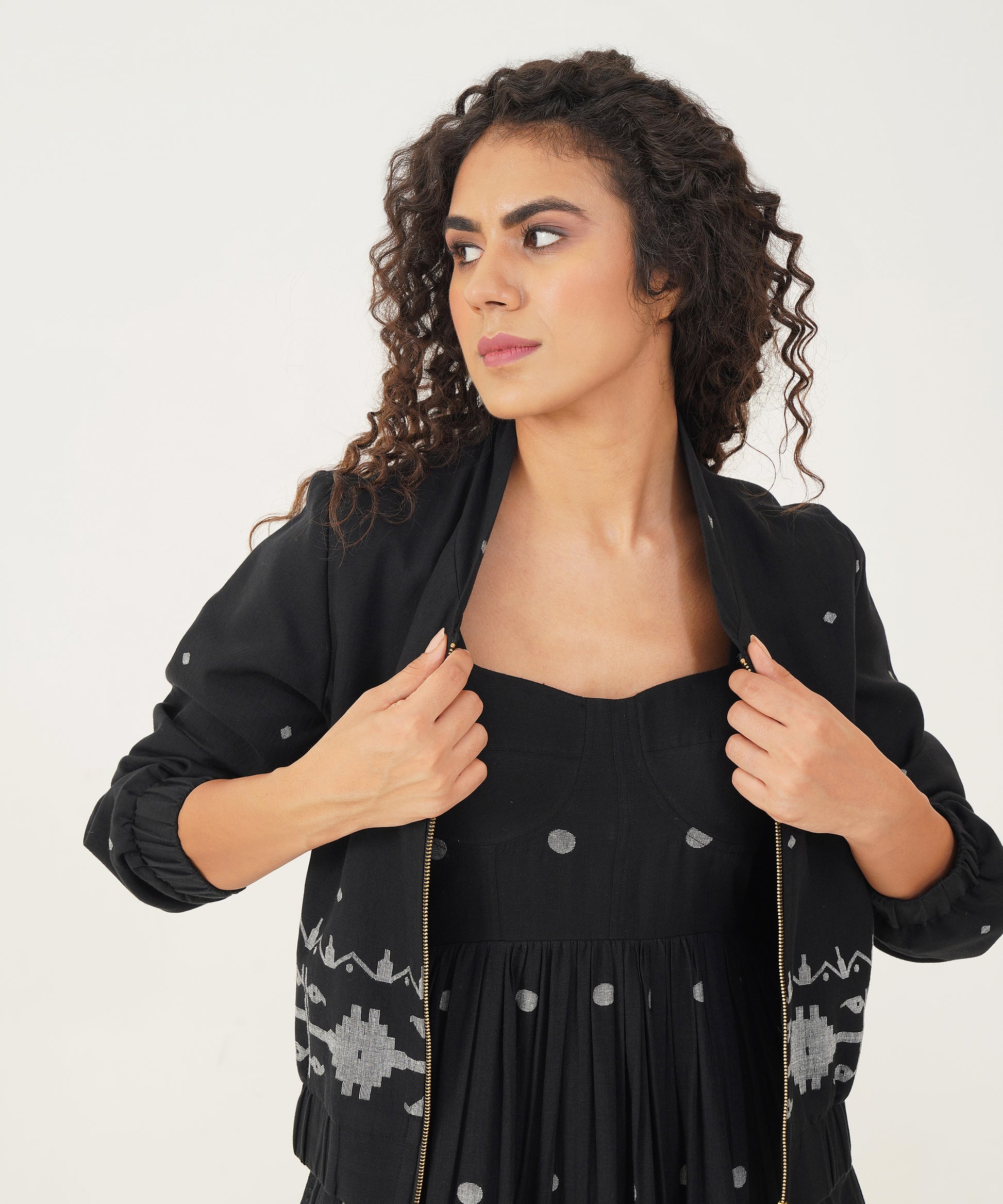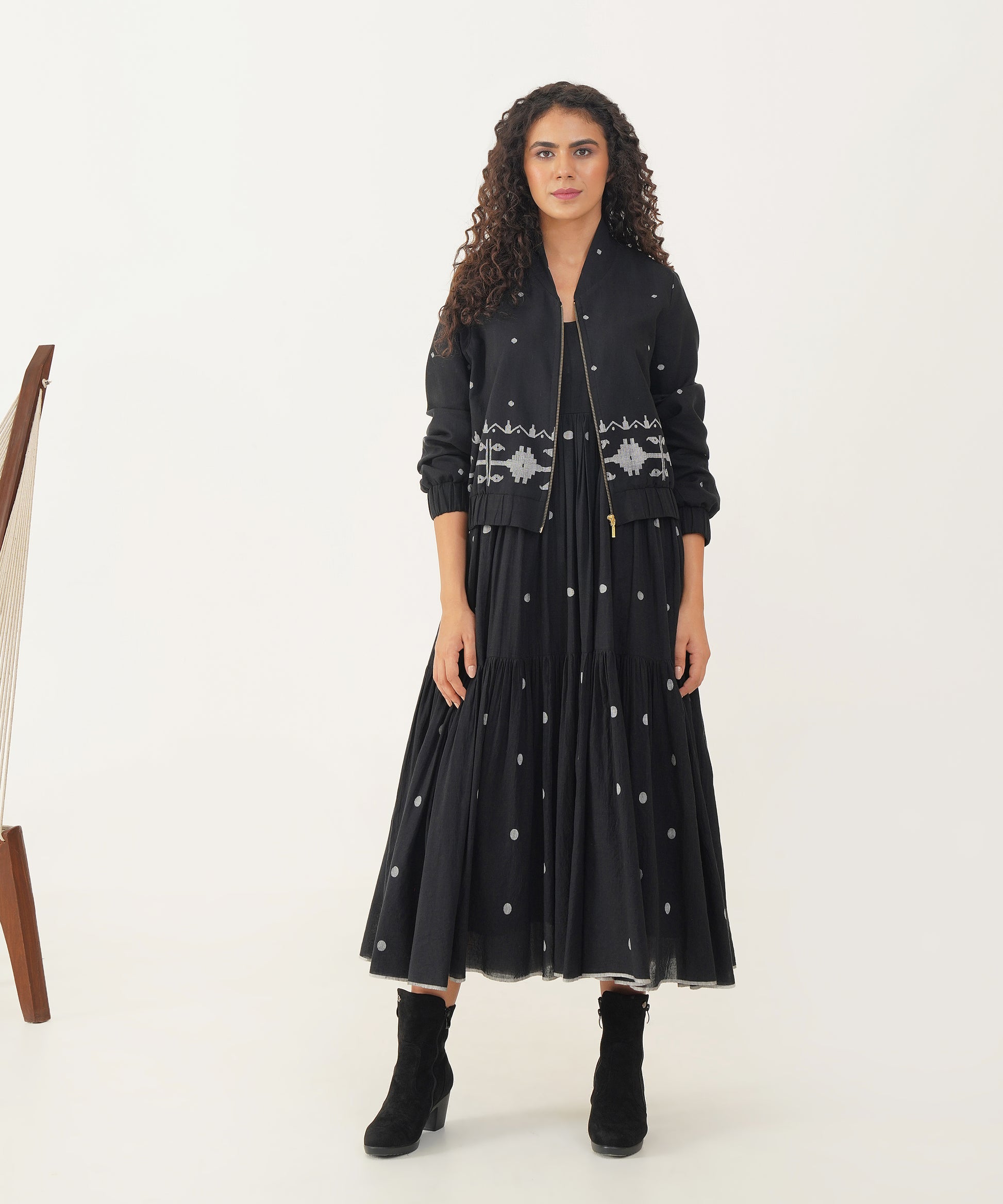 Unveil timeless elegance with our classic Jamdani ensemble. This refined set includes a bralette dress with delicate noodle straps and gentle gathers that accentuate a graceful silhouette. Designed for both style and convenience, the dress features a back zipper fastening and side pockets for effortless functionality. Complementing the dress is an intricately woven Jamdani bomber jacket, adding a touch of artisanal craftsmanship and sophistication. Together, this ensemble blends tradition with contemporary flair, perfect for any occasion where elegance and detail are paramount.