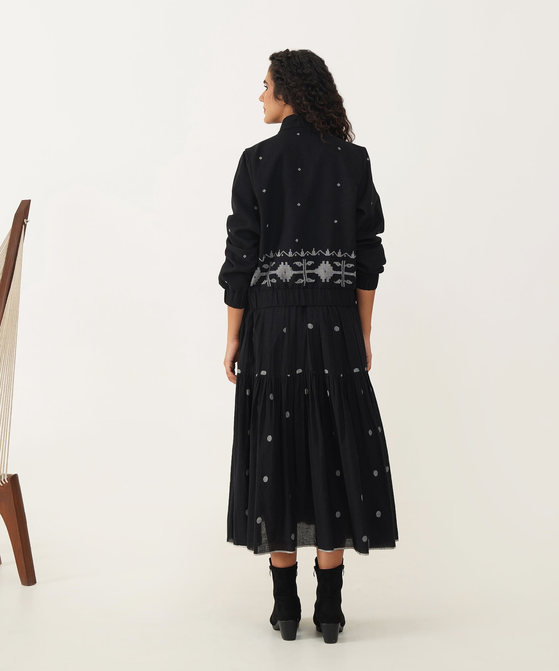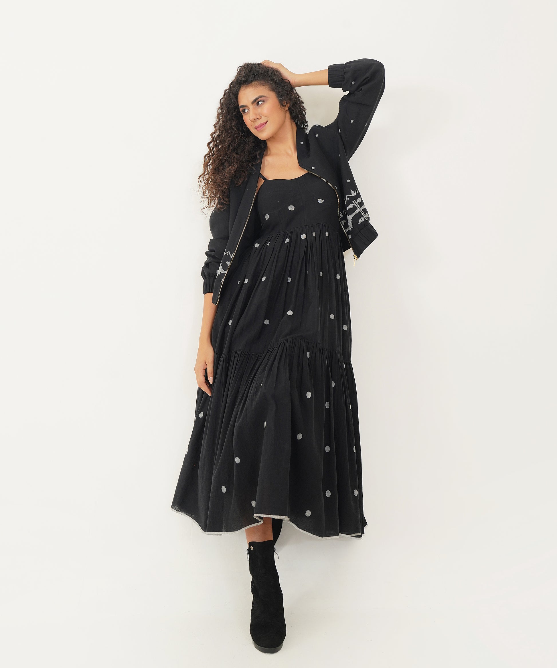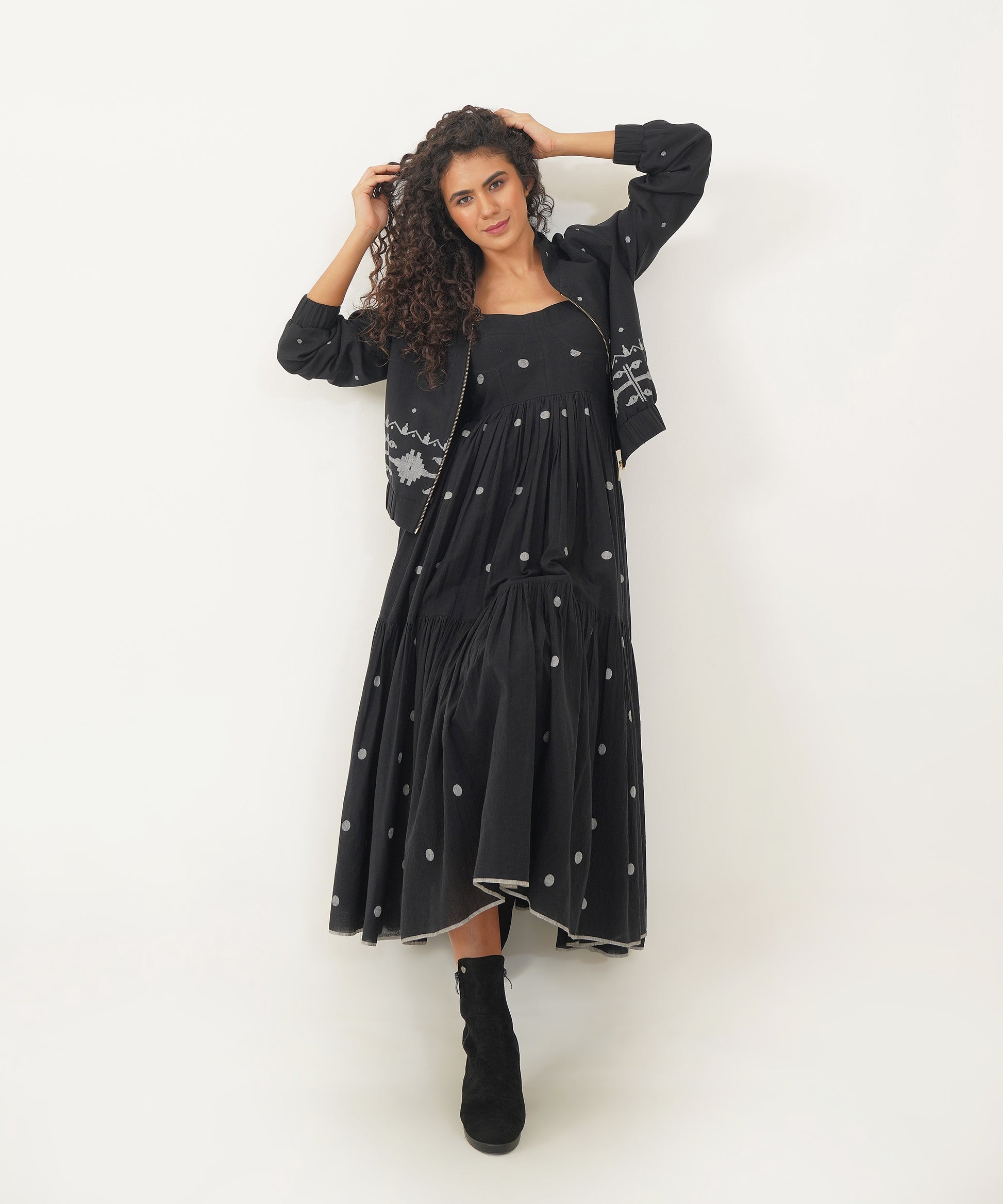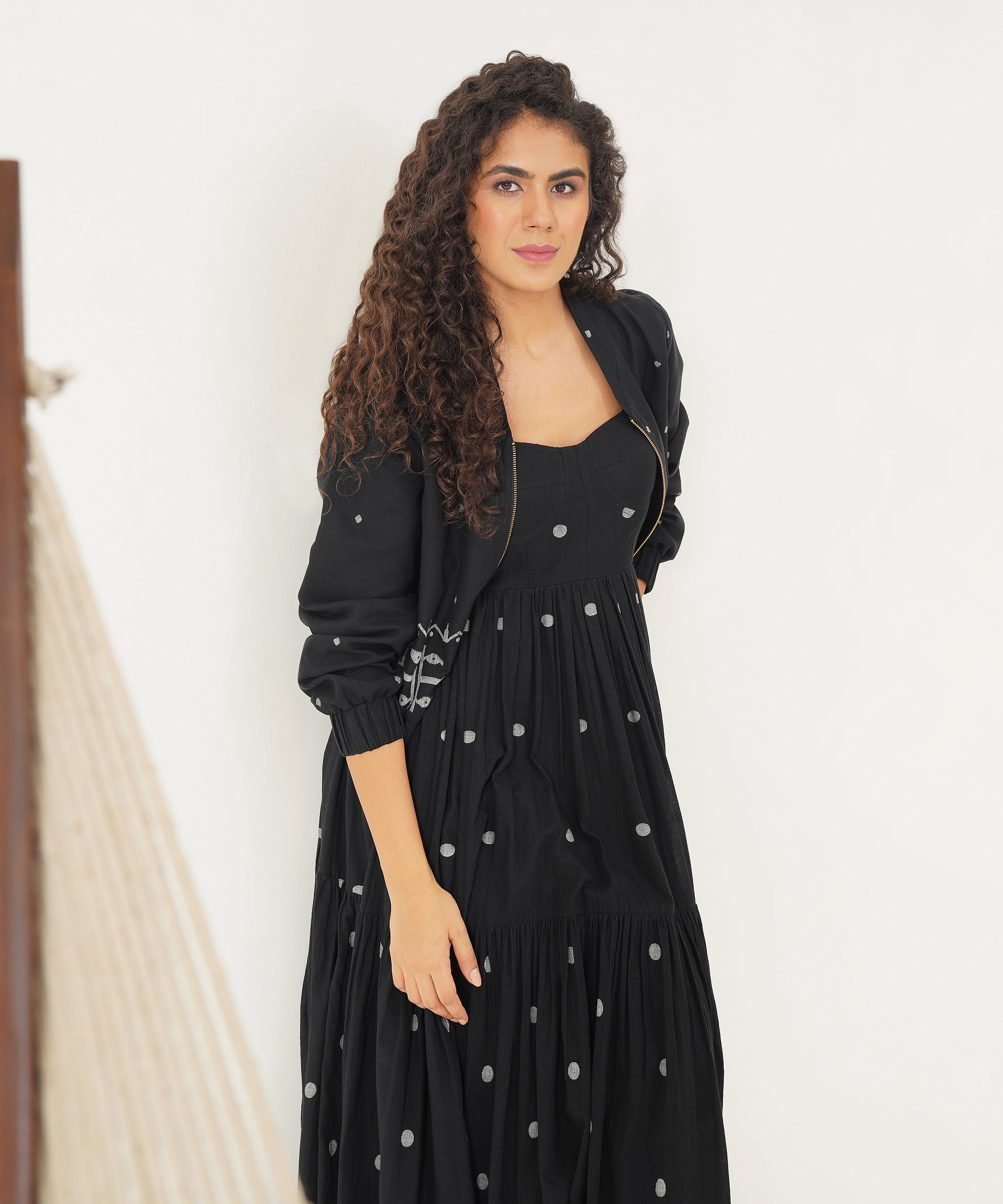 Unveil timeless elegance with our classic Jamdani ensemble. This refined set includes a bralette dress with delicate noodle straps and gentle gathers that accentuate a graceful silhouette. Designed for both style and convenience, the dress features a back zipper fastening and side pockets for effortless functionality. Complementing the dress is an intricately woven Jamdani bomber jacket, adding a touch of artisanal craftsmanship and sophistication. Together, this ensemble blends tradition with contemporary flair, perfect for any occasion where elegance and detail are paramount.