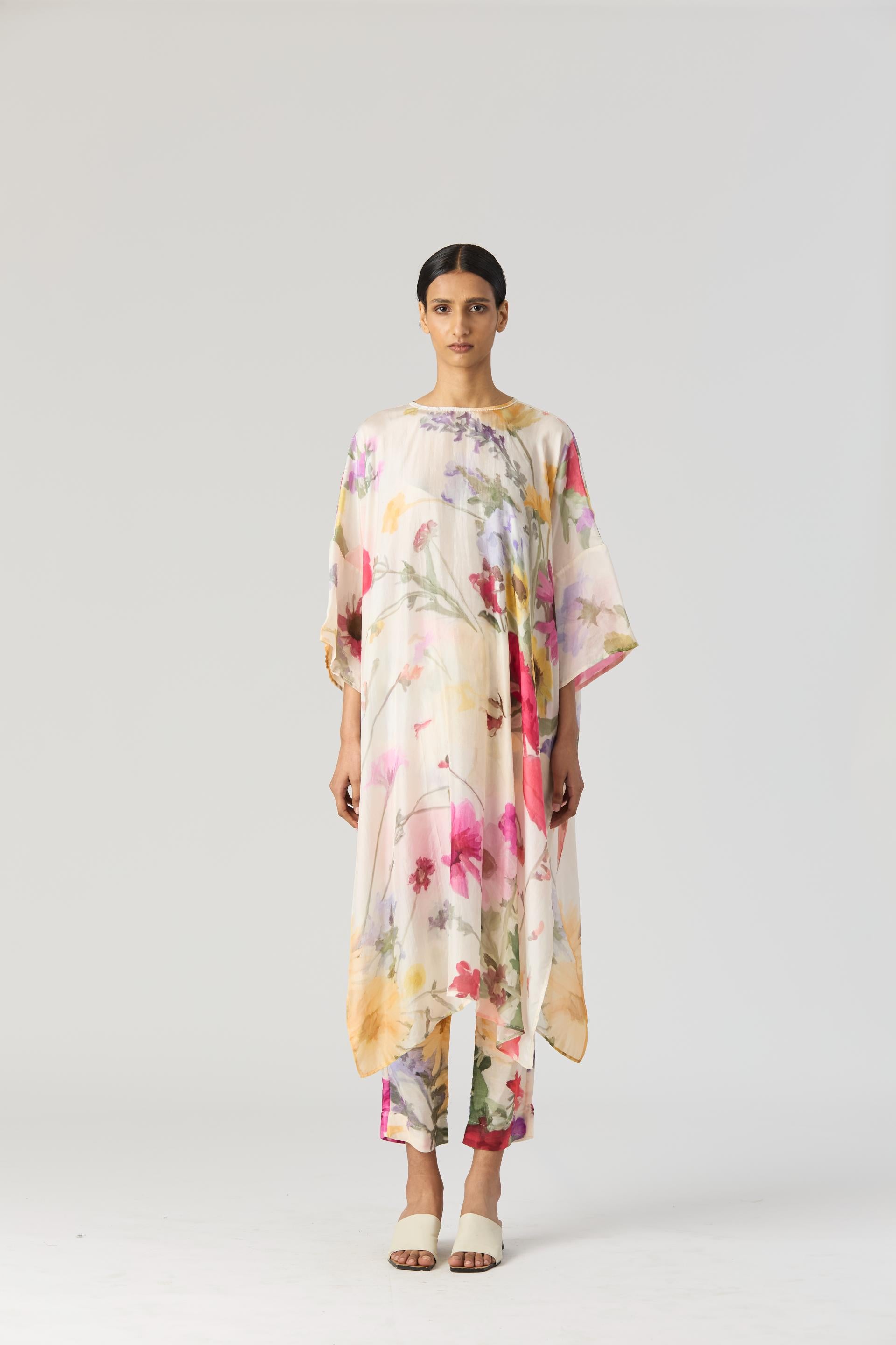 The set includes a Kaftan and pants with drawstring front and back elastic. The kaftan kurta set is crafted in the Veronica print carefully printed on Crepe featuring white pearls on the neck.