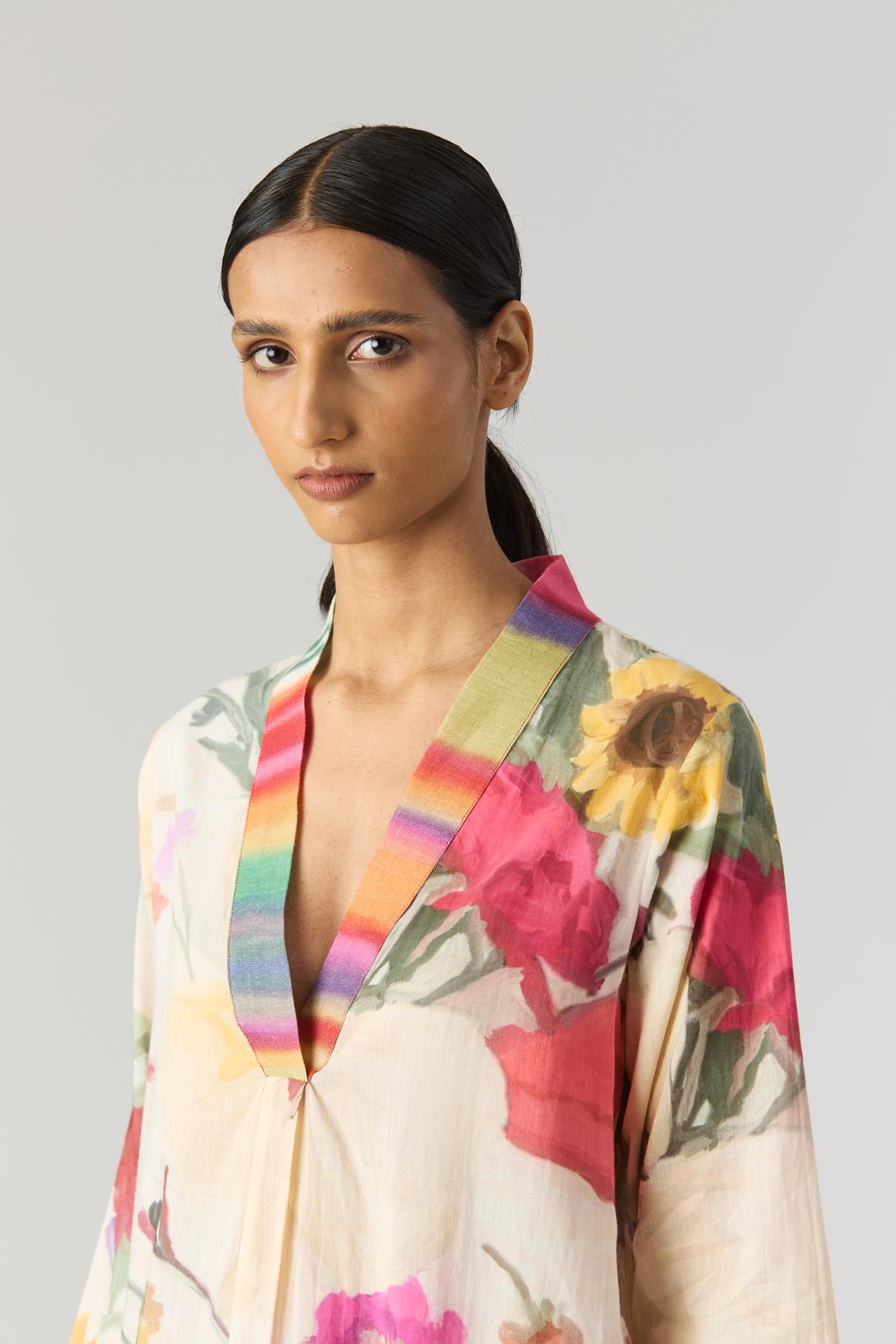 The set is crafted in the Maria print carefully printed on Cotton Cambric. The Kurta has stripes Collar patti detailing on the neckline
