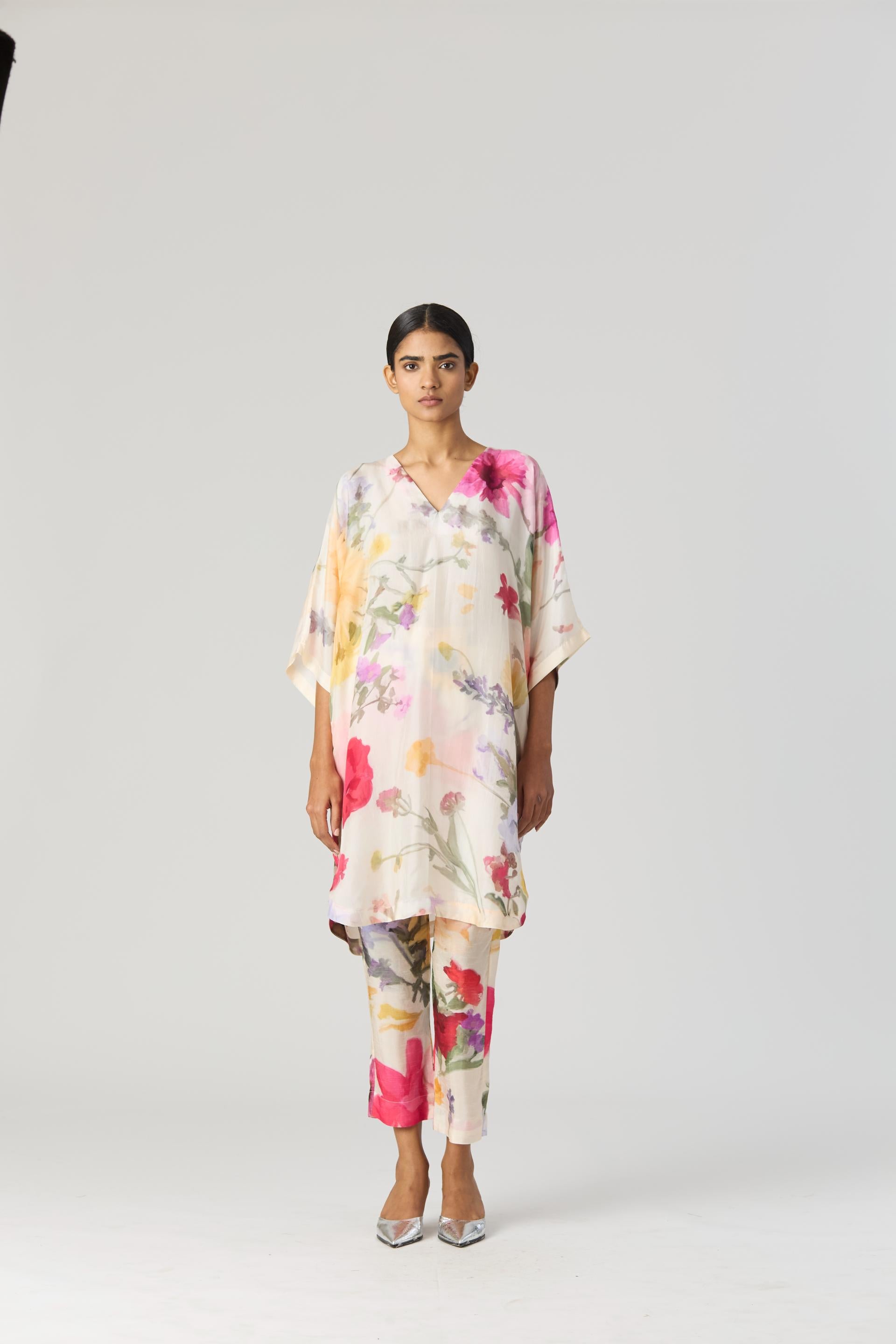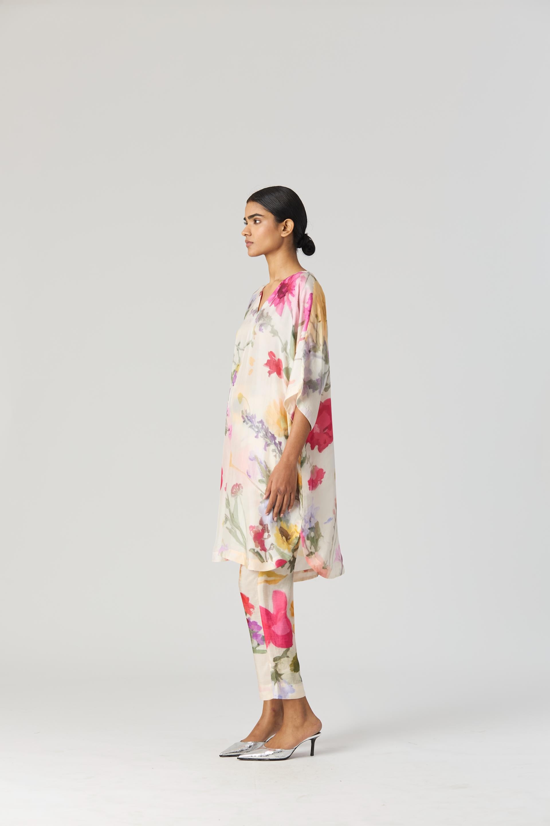 The V neck short kaftan kurta is crafted in pure habutai silk. The kurta has side pockets. The pants have a drawstring front and back elastic.
