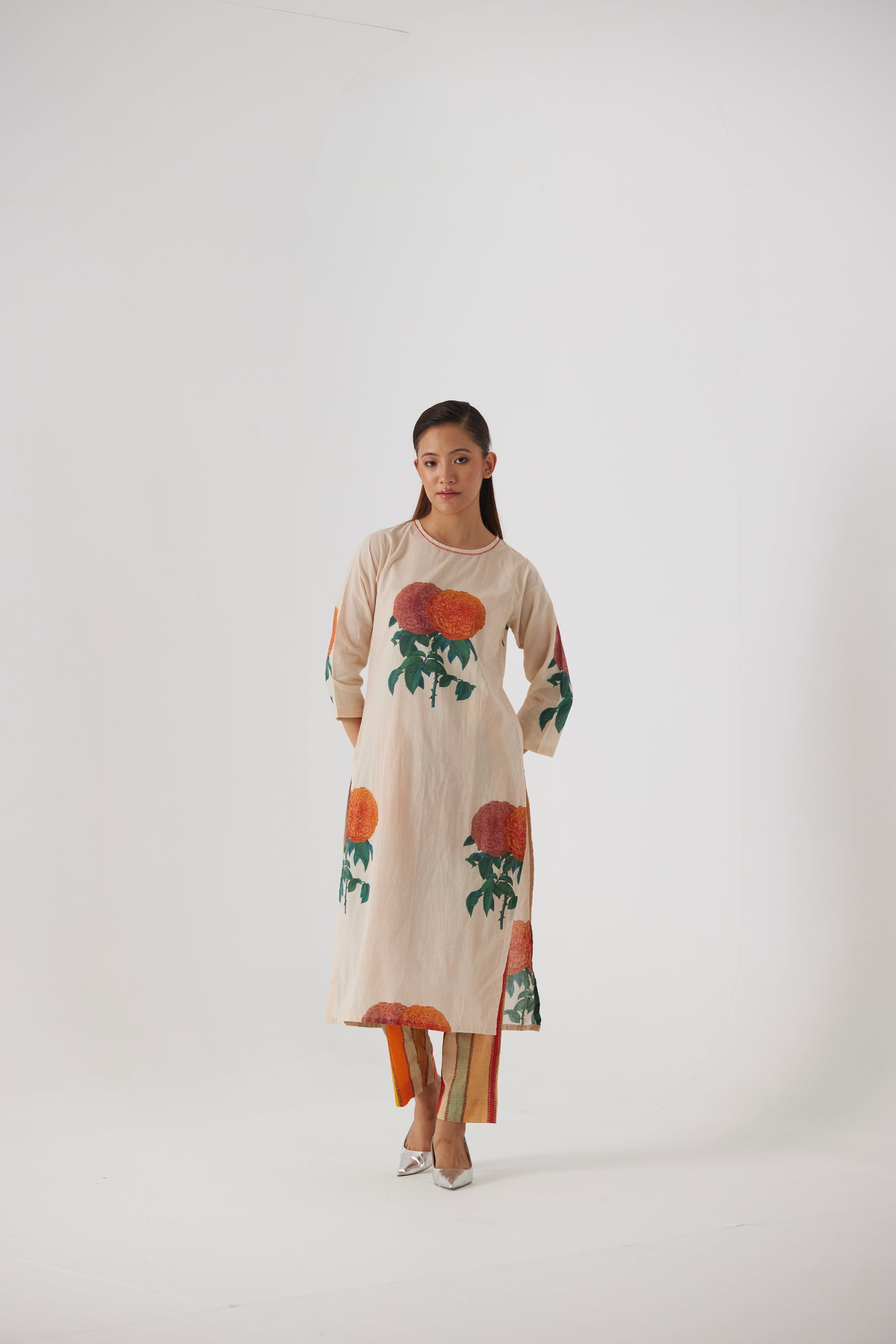 Discover timeless charm in our Cotton Kurta, adorned with hand-drawn Marigold flower motifs. Complemented by striped pants featuring intricate block print details, this ensemble exudes effortless sophistication.