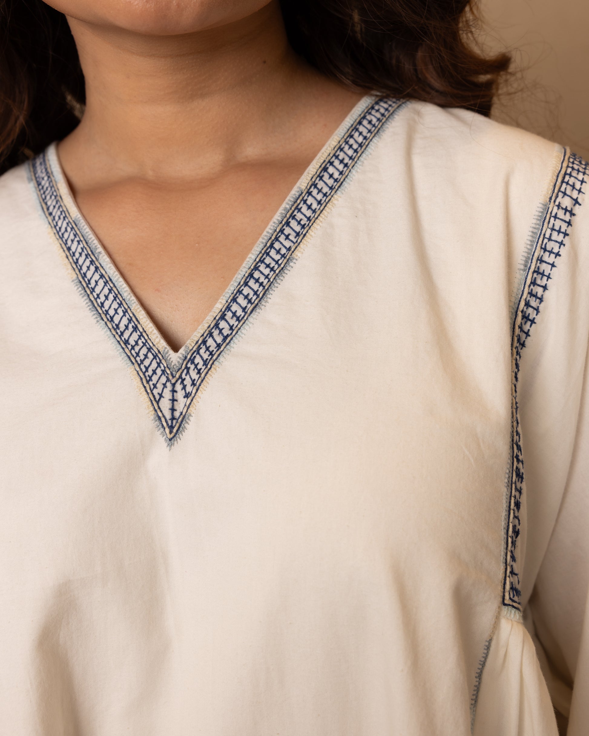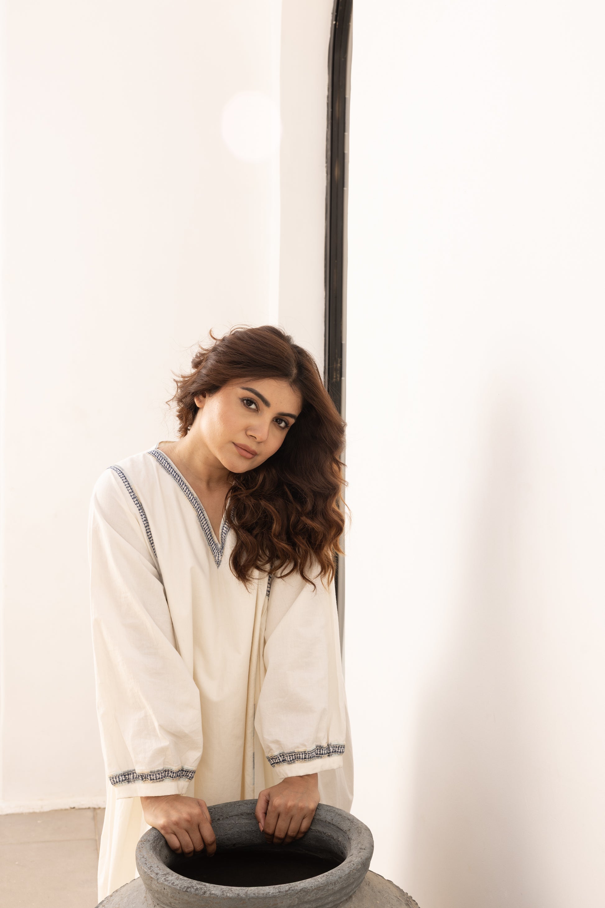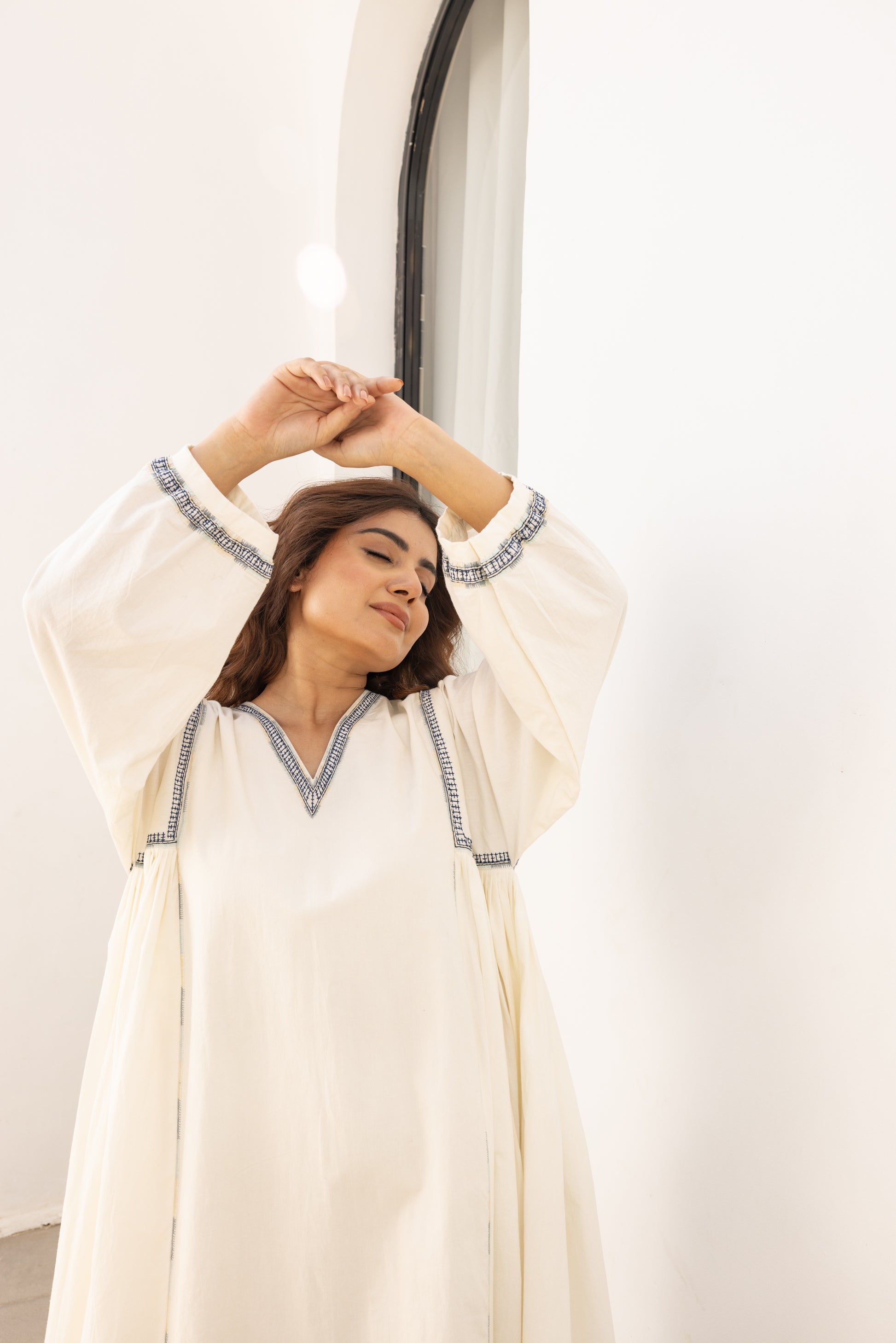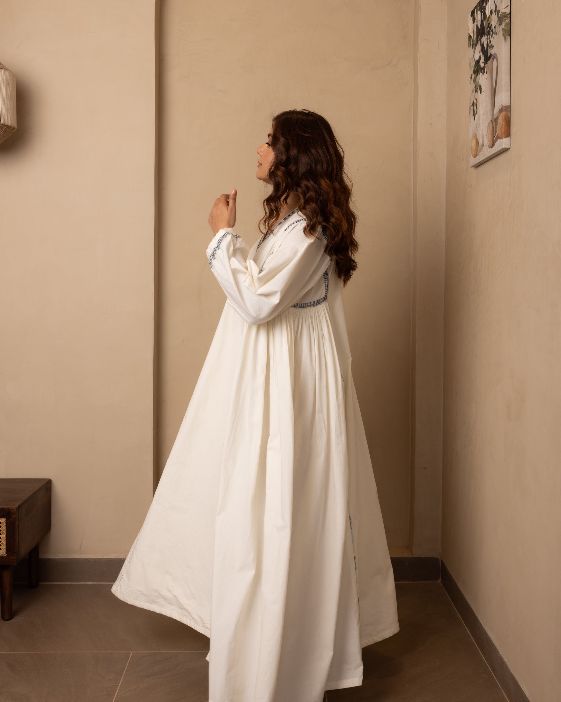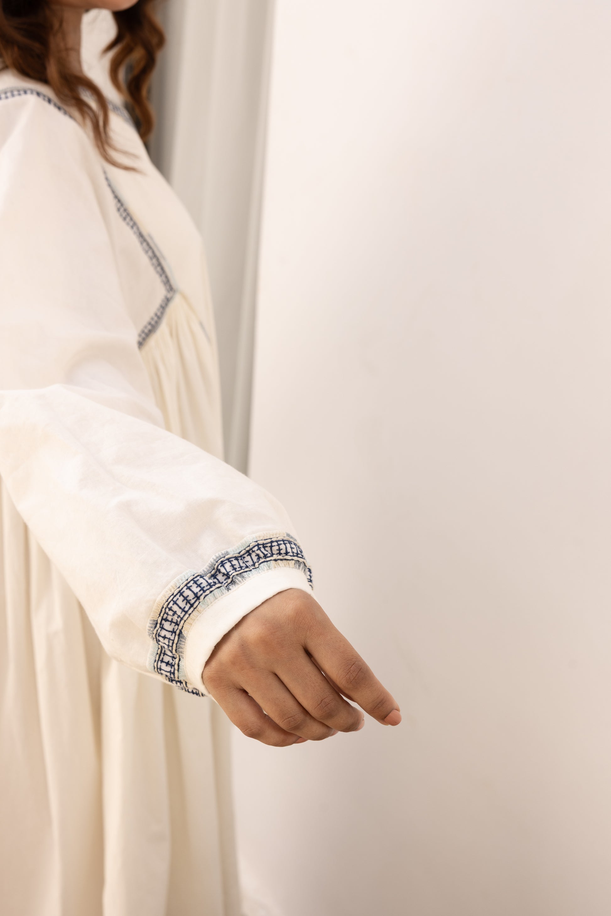 Intricate shoulder-to-sleeve lace detailing adds a touch of femininity and grace, while embroidered buttons along the neckline offer a polished finish. A standout feature of this dress is the tassel detailing on the back yoke line, adding whimsical charm and a unique focal point to the ensemble