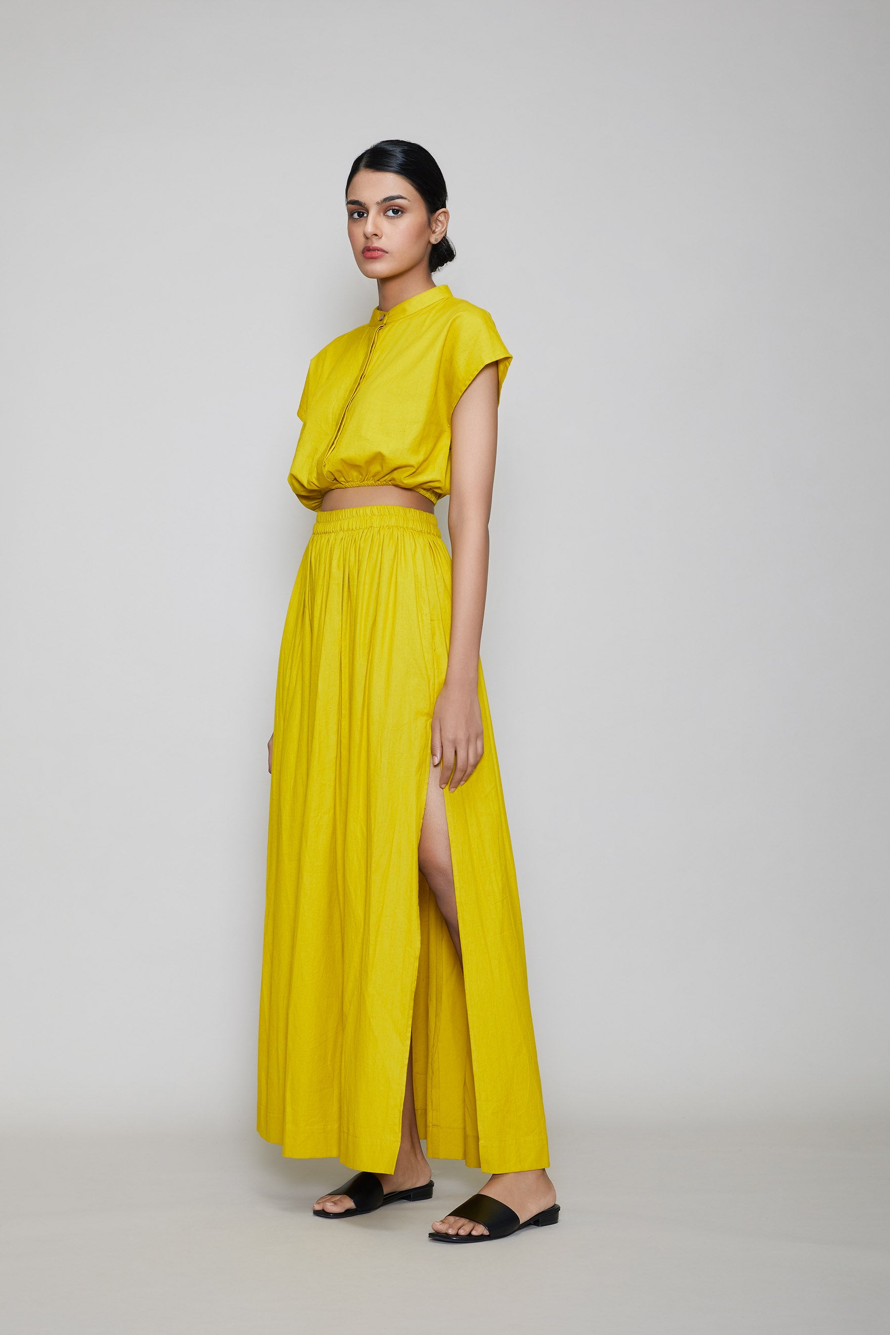 A cute crop top with extended balloon sleeves. Comes in four beautiful colours with front button open and collar. Style it with our skirt and complete the look.