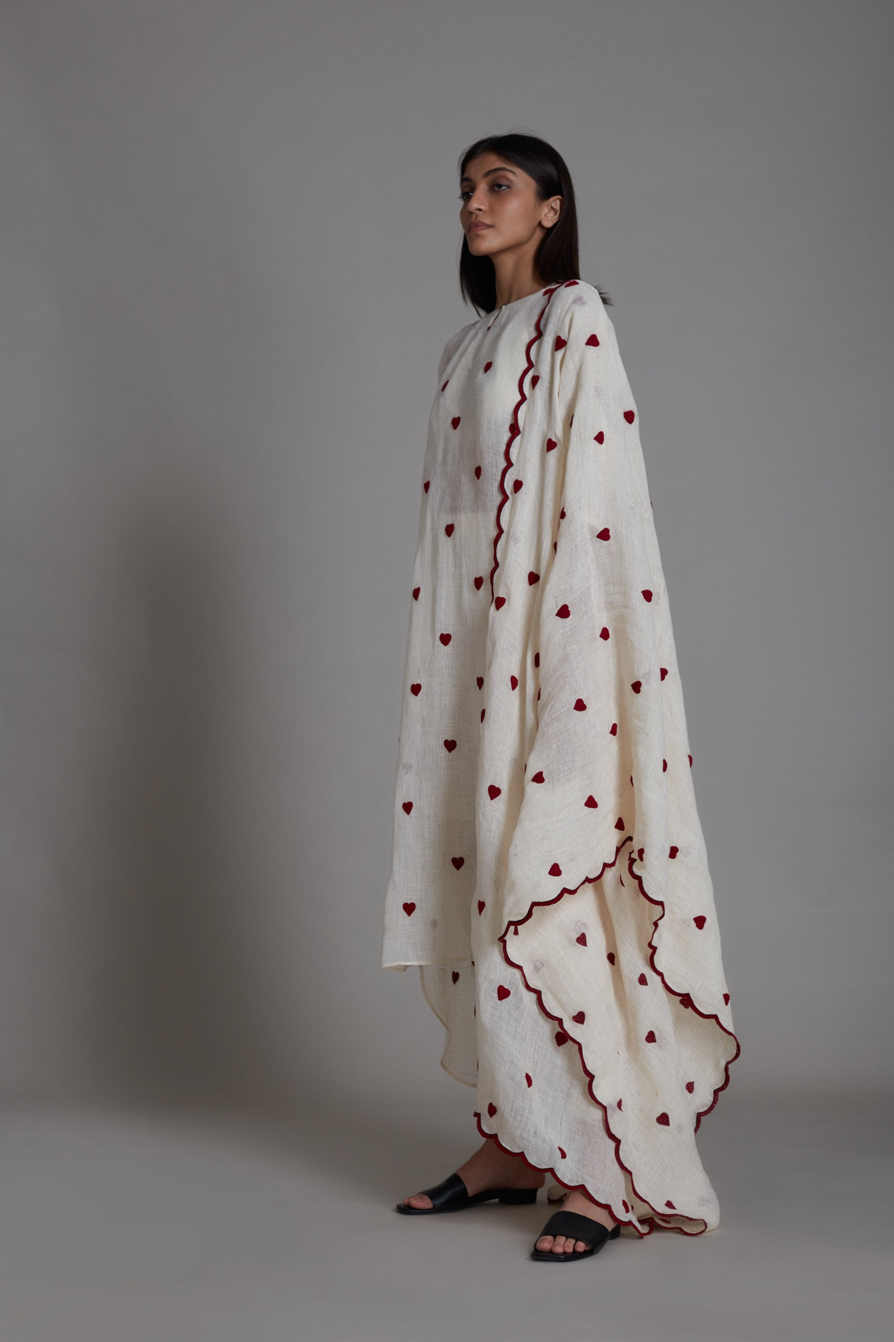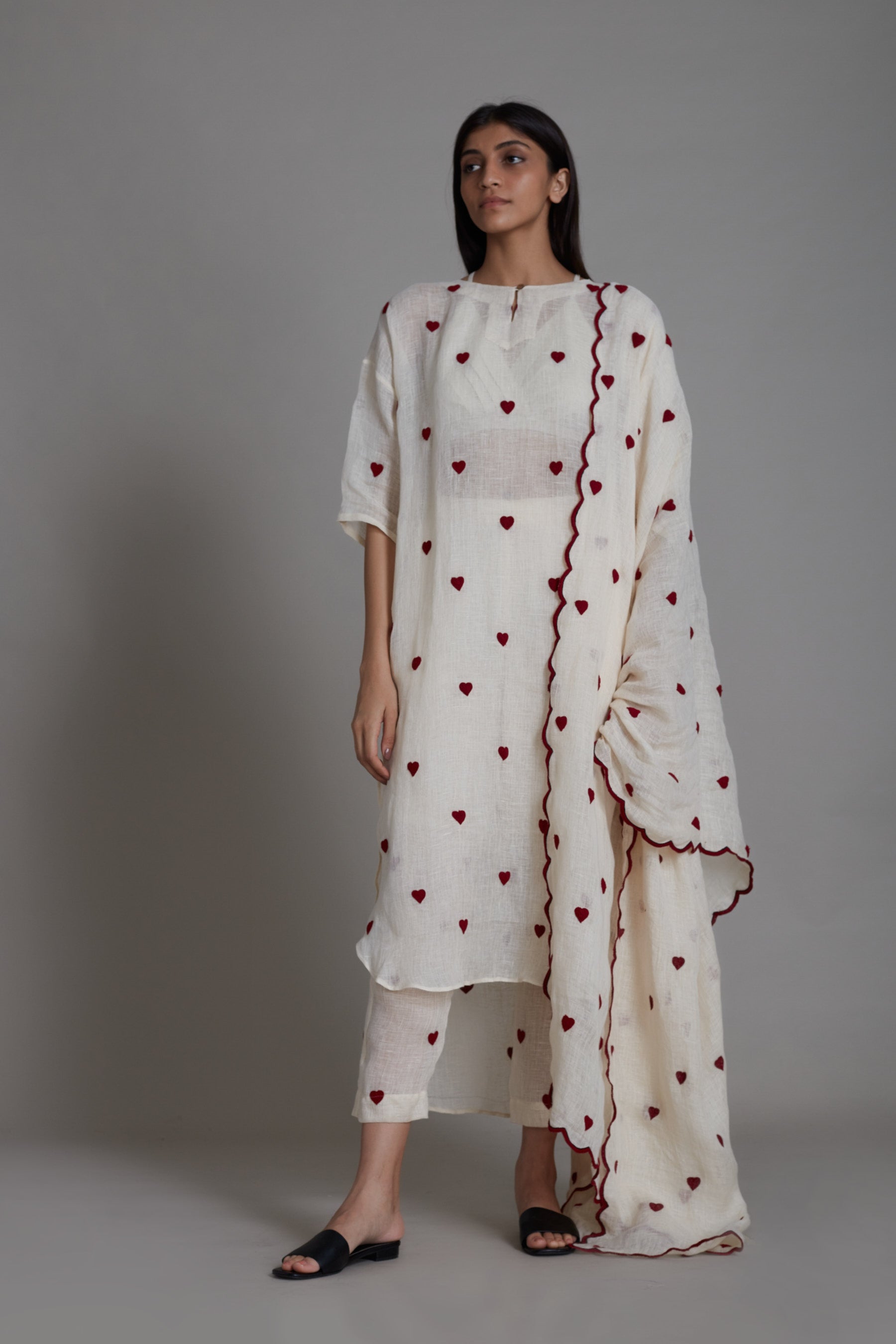This beautiful set is all that you need for daytime festivities. The pure linen all-over embroidered apple cut set with detailing on the kurta and scallop embroidery on the stole brings elegance and class to the outfit. Pair this set with statement earrings and potli bag to complete the look.(SET OF 3, TUNIC, STOLE and PANTS, handwoven cotton bralette inner comes with the set)