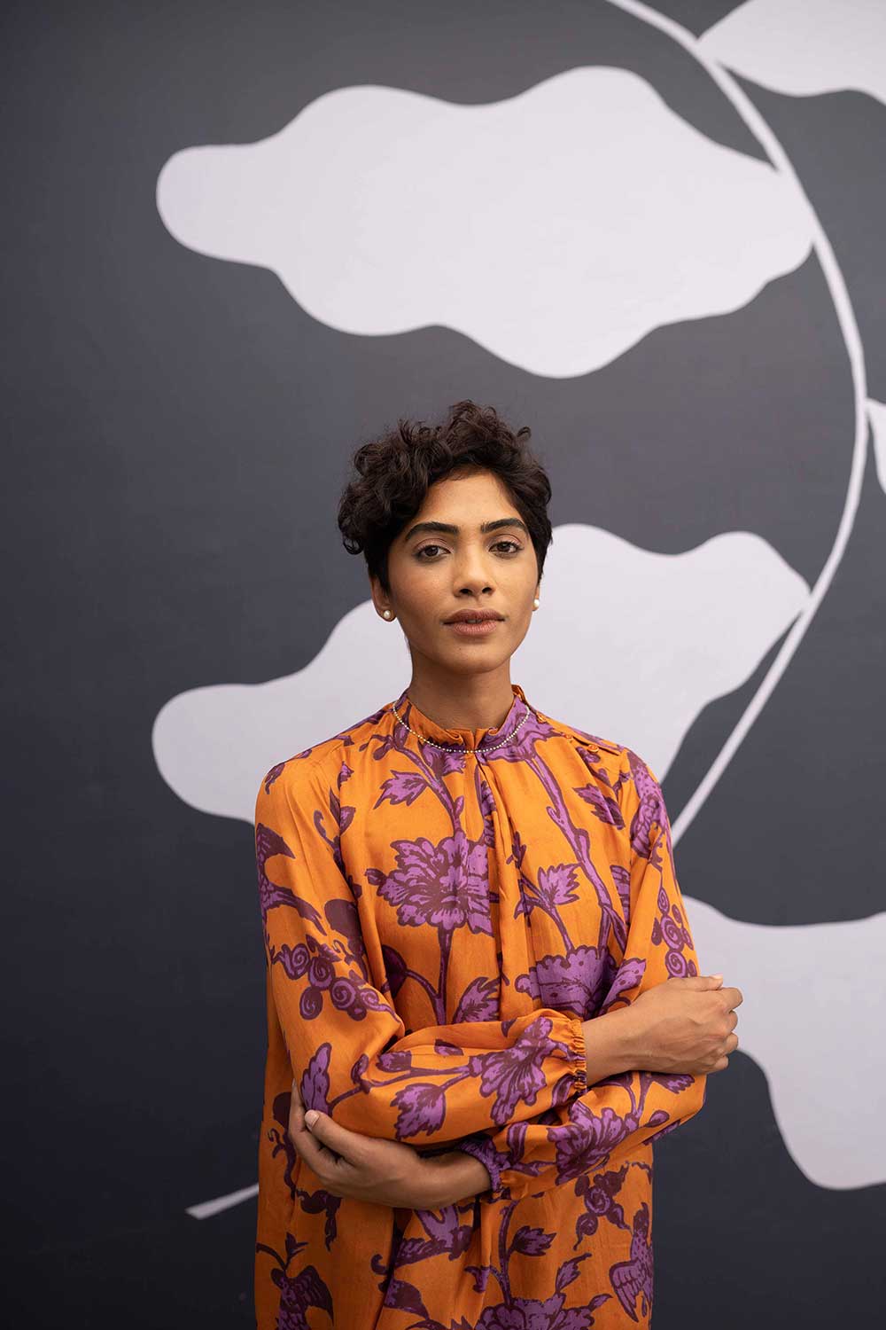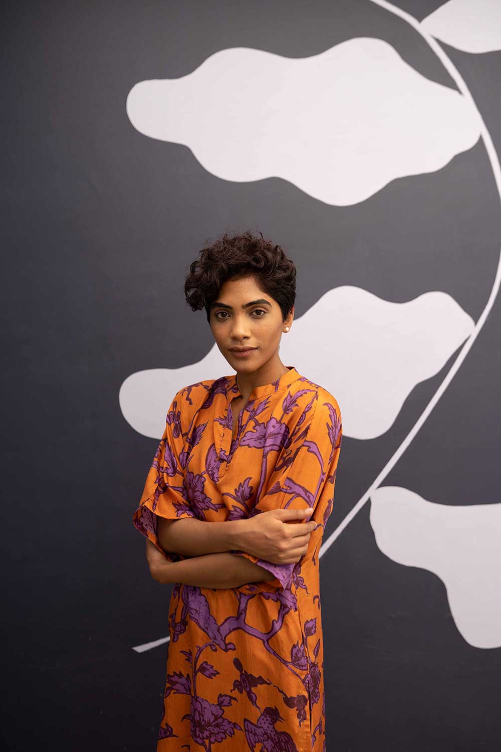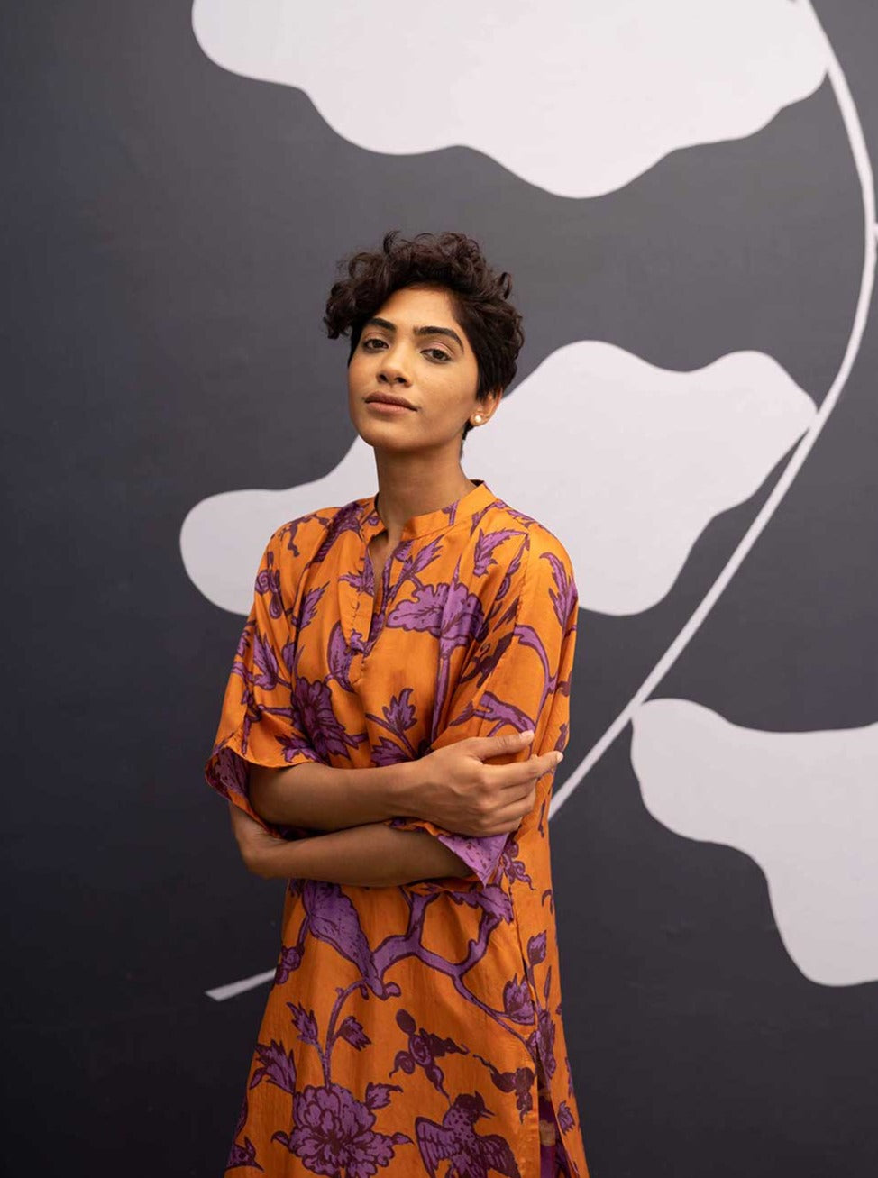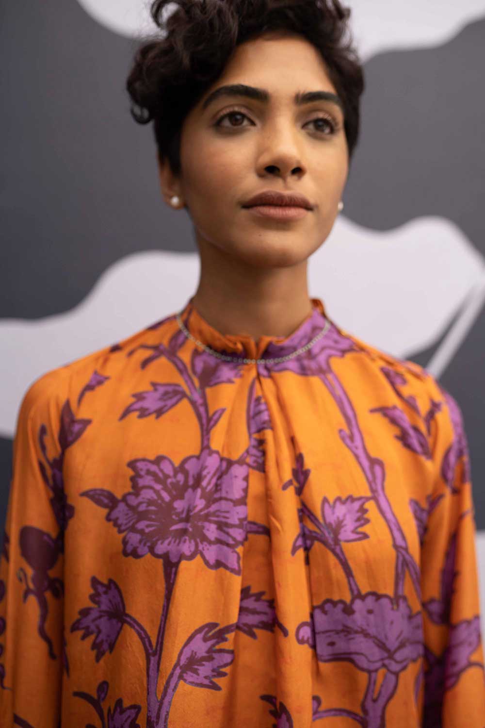 The maui kurta and pant co-ord set is printed in pure silk in an orange base .