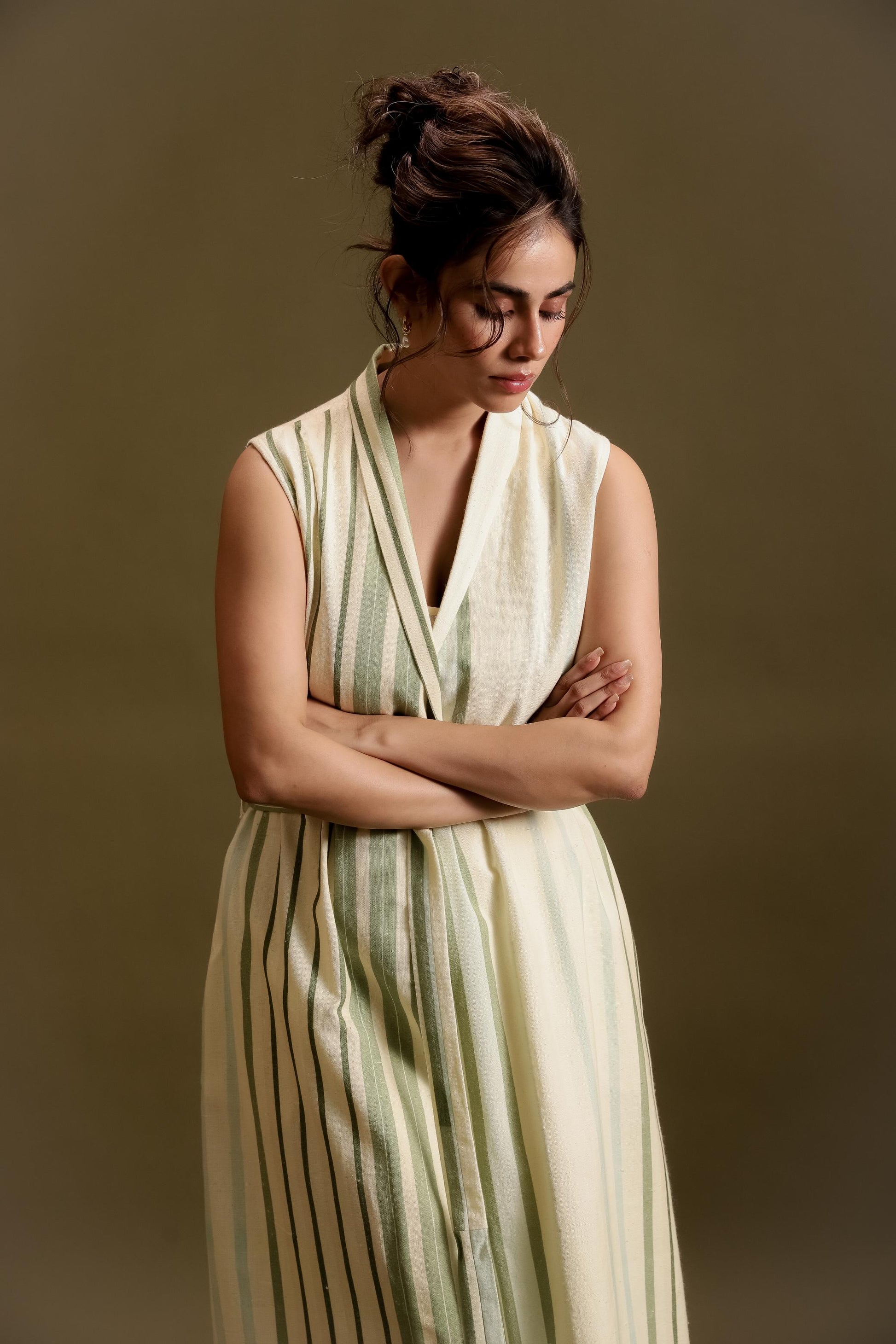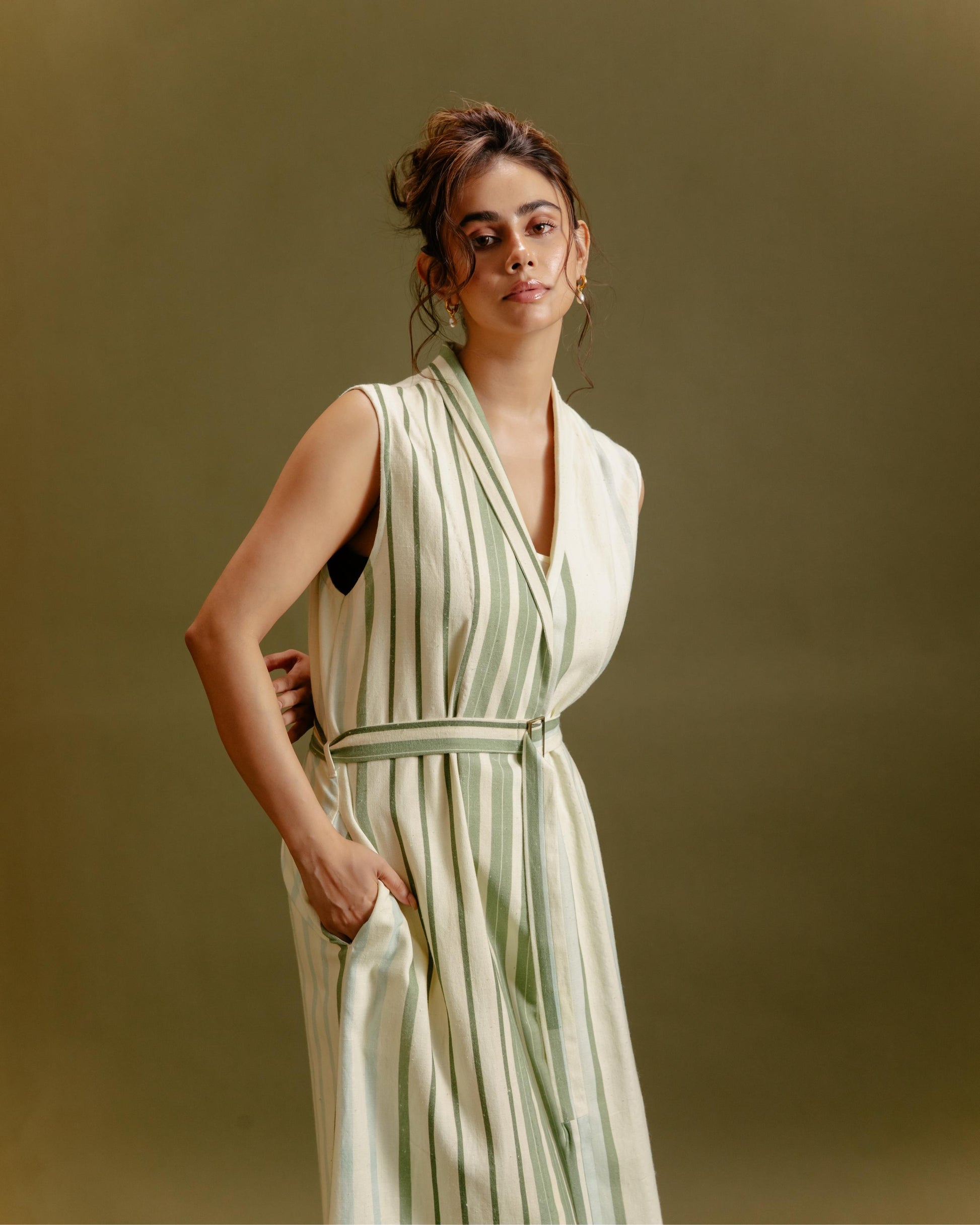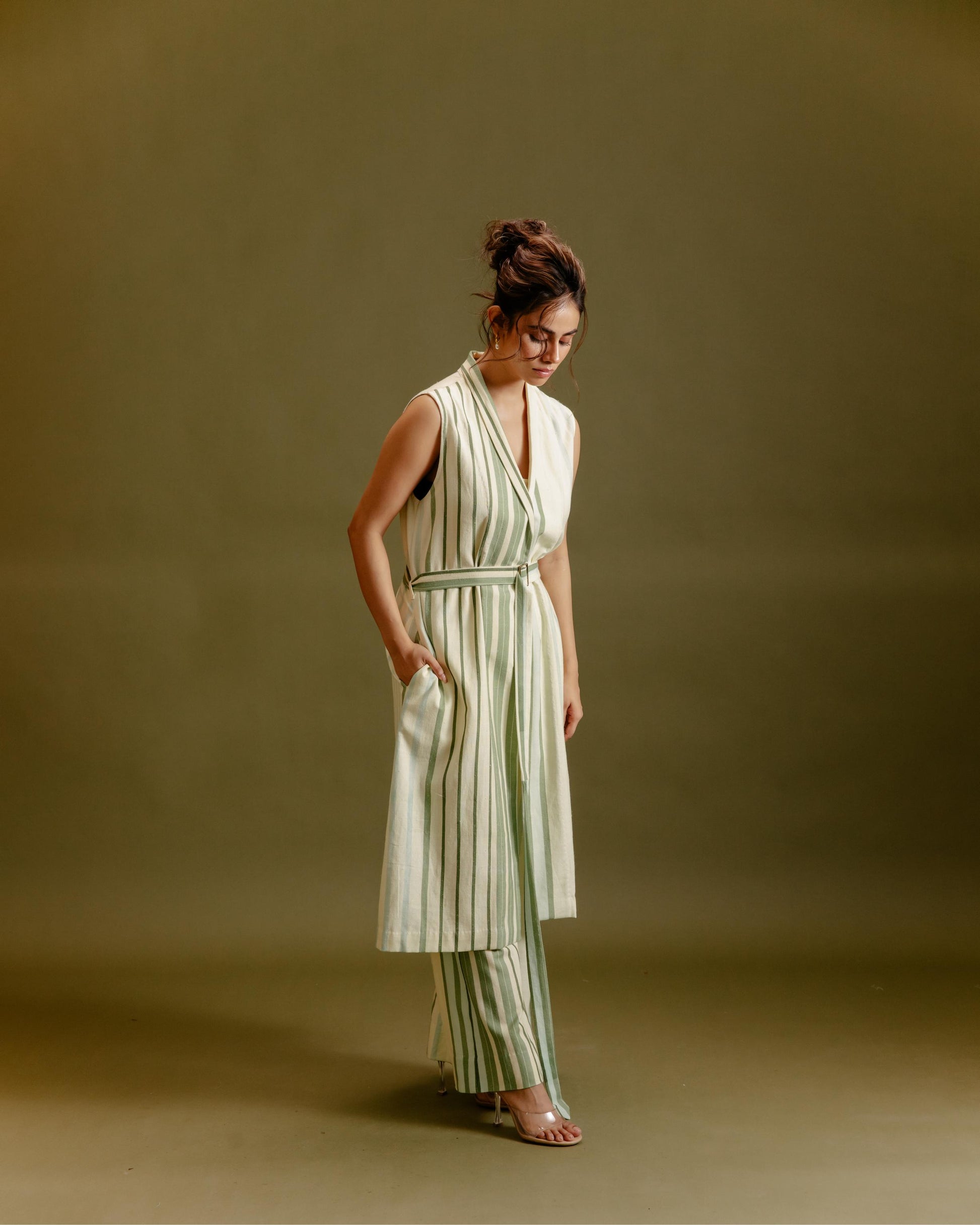 Pure khadi printed shawl collar sleeveless jacket with pockets and flared pants(can be sold as seperates)