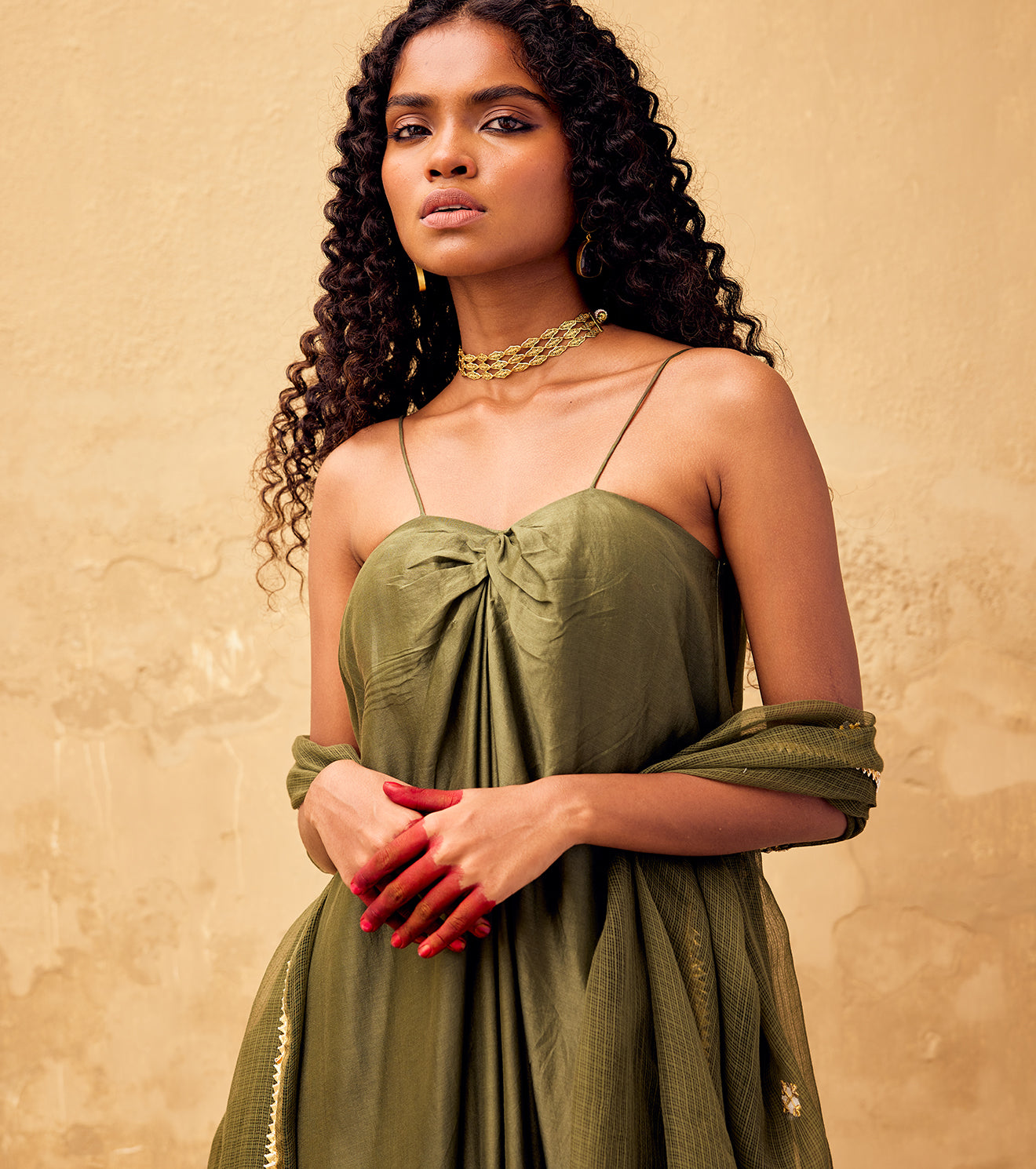 An embroidered Kota doria dupatta composed in cotton and embellished with gota lace.