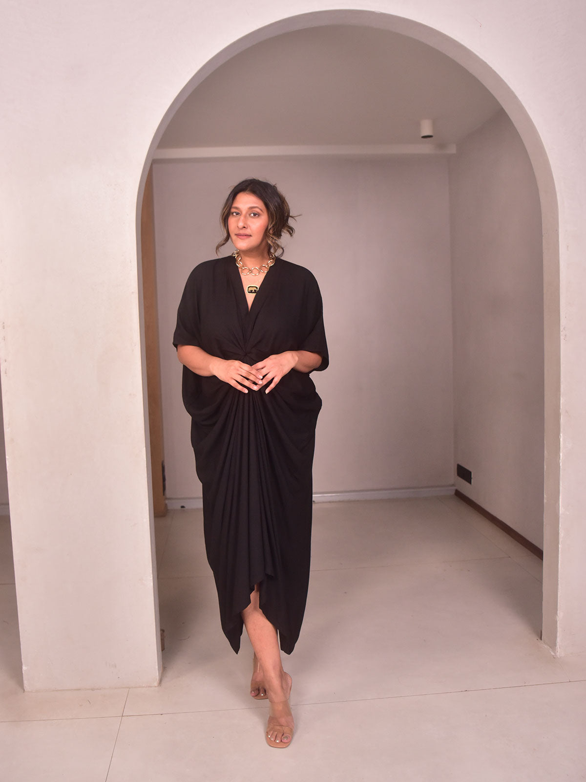 Embrace easy sophistication in this flowy black rayon kaftan featuring a front knot detail. Its graceful silhouette makes it ideal for resort evenings or relaxed dinner outings. Style it with statement earrings and metallic flats for an effortlessly elegant appearance.