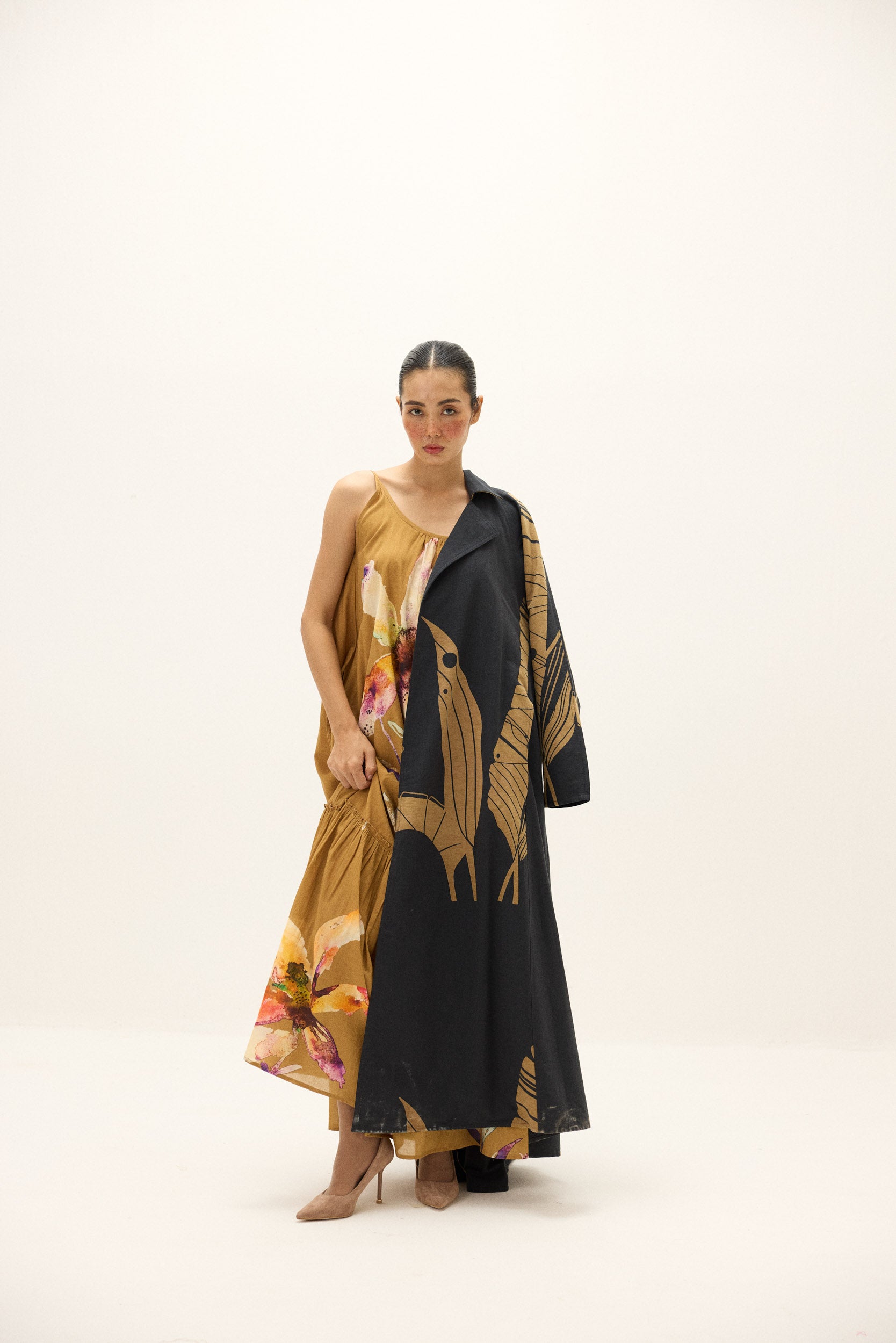 A dramatic full-length coat in Oxford cotton, featuring bold oversized leaf motifs in earthy ochre tones on a deep charcoal base. Designed with a relaxed drape, wide lapels, and concealed pockets, it flows with ease while adding a striking graphic edge to any look.
