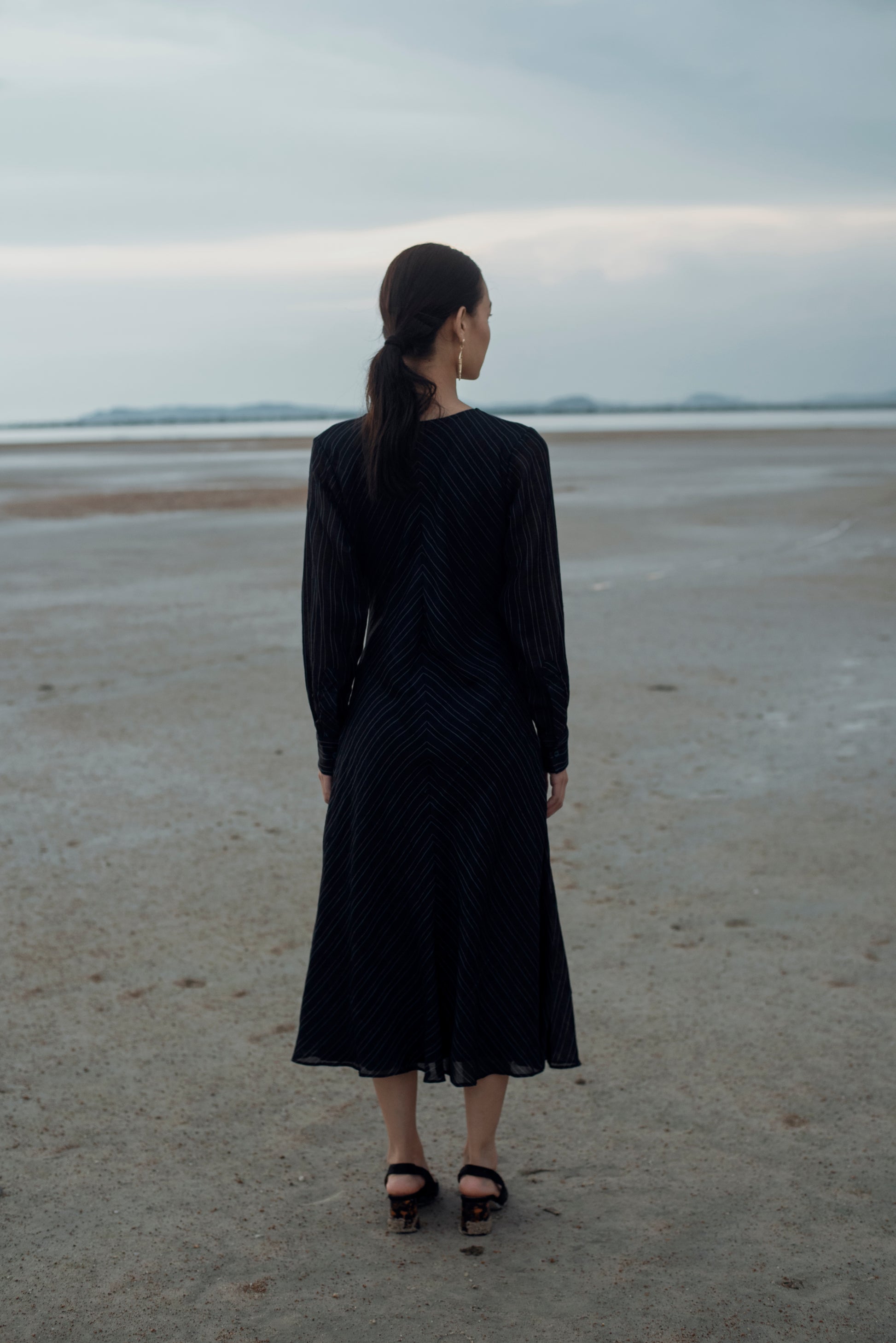 This is a classic wrap silhouette dress made in pure silk fabric handwoven in Banaras. It has striped details all over in the weave. It’s an overlap dress with deep v neck and basic sleeves with a cuff. It has intricately handcrafted applique and hand embroidery all over the dress in abstract motifs. This collection is an assorted range of textiles & handspun fabrics sourced from Banaras, Islampur, Murshidabad & quaint villages of India. The inspiration for the embellishments & embroideries has been derived from the artist Huguette Caland and her work over the years. Intricate crafts like sujani & kantha are the key embroidery techniques been used.