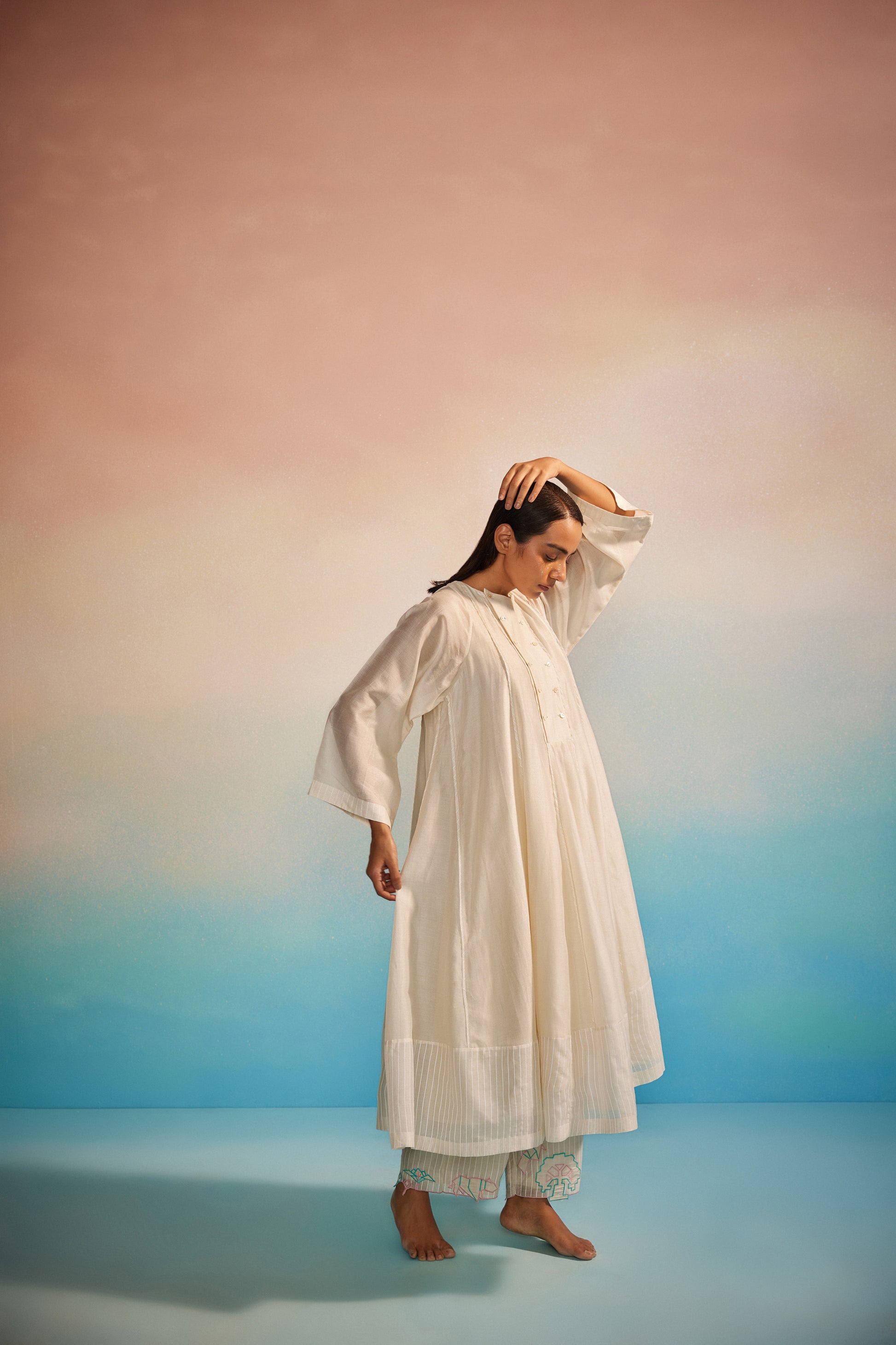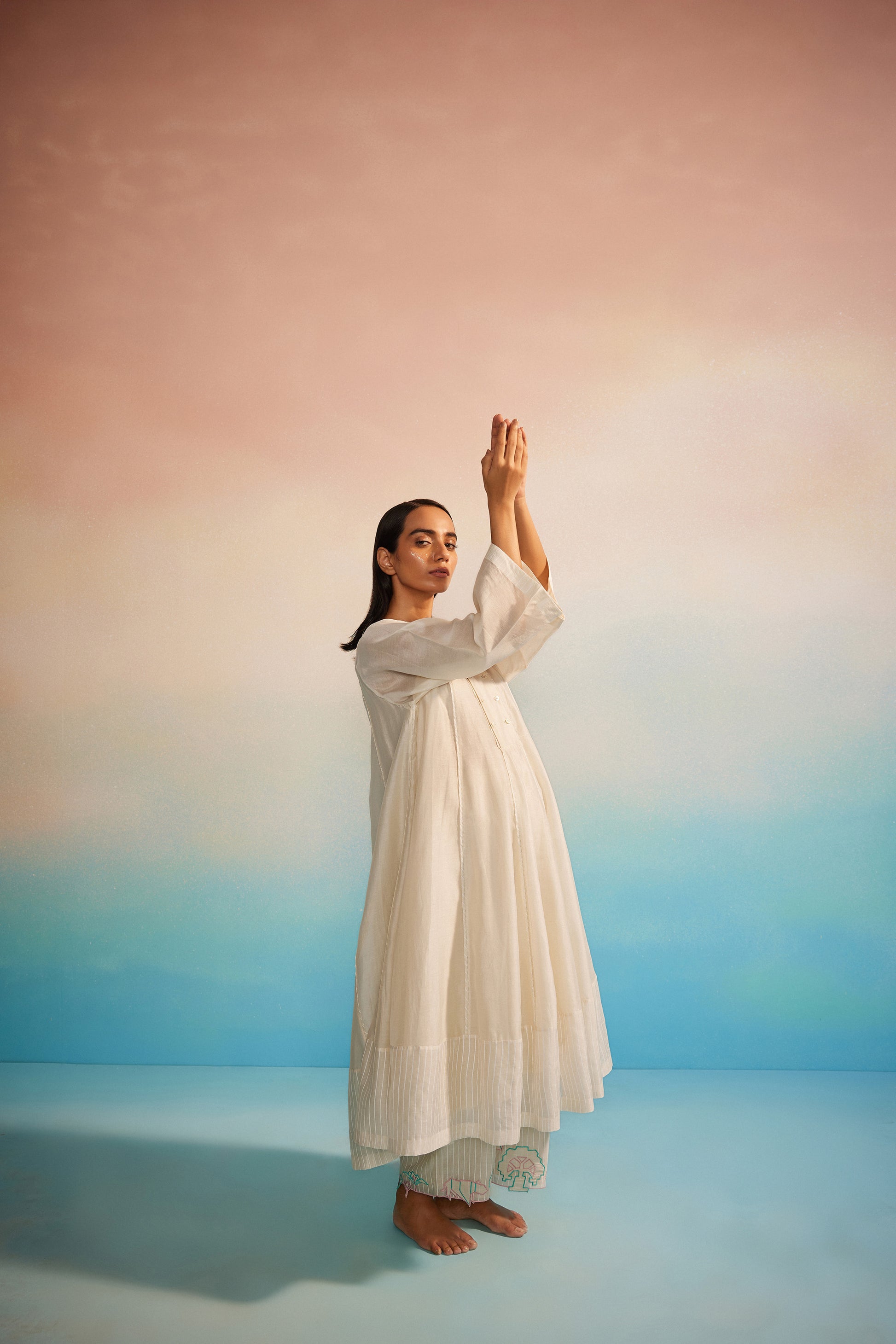 The Midori Dress is a harmonious blend of texture and detail, crafted from a striking mix of smooth plain Chanderi and striped Chanderi panels. Its long silhouette flows effortlessly. Delicate buttons adorn the yoke, while subtle striped bindings trace the seams, adding a quiet sophistication to the design. Thoughtfully constructed with multiple panels, Midori captures the beauty of contrast and craftsmanship in every fold. A piece designed for those who appreciate understated elegance and versatile style.