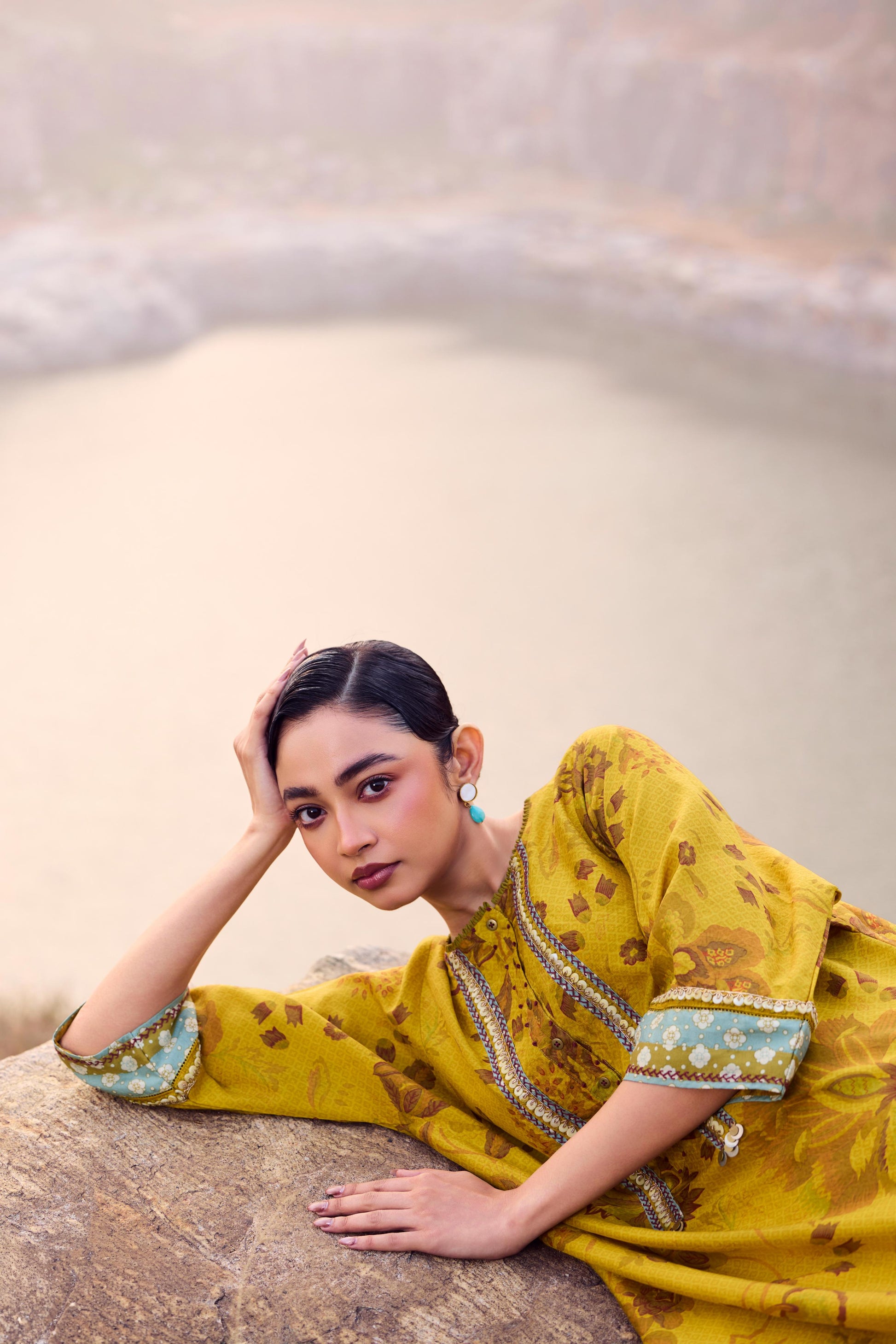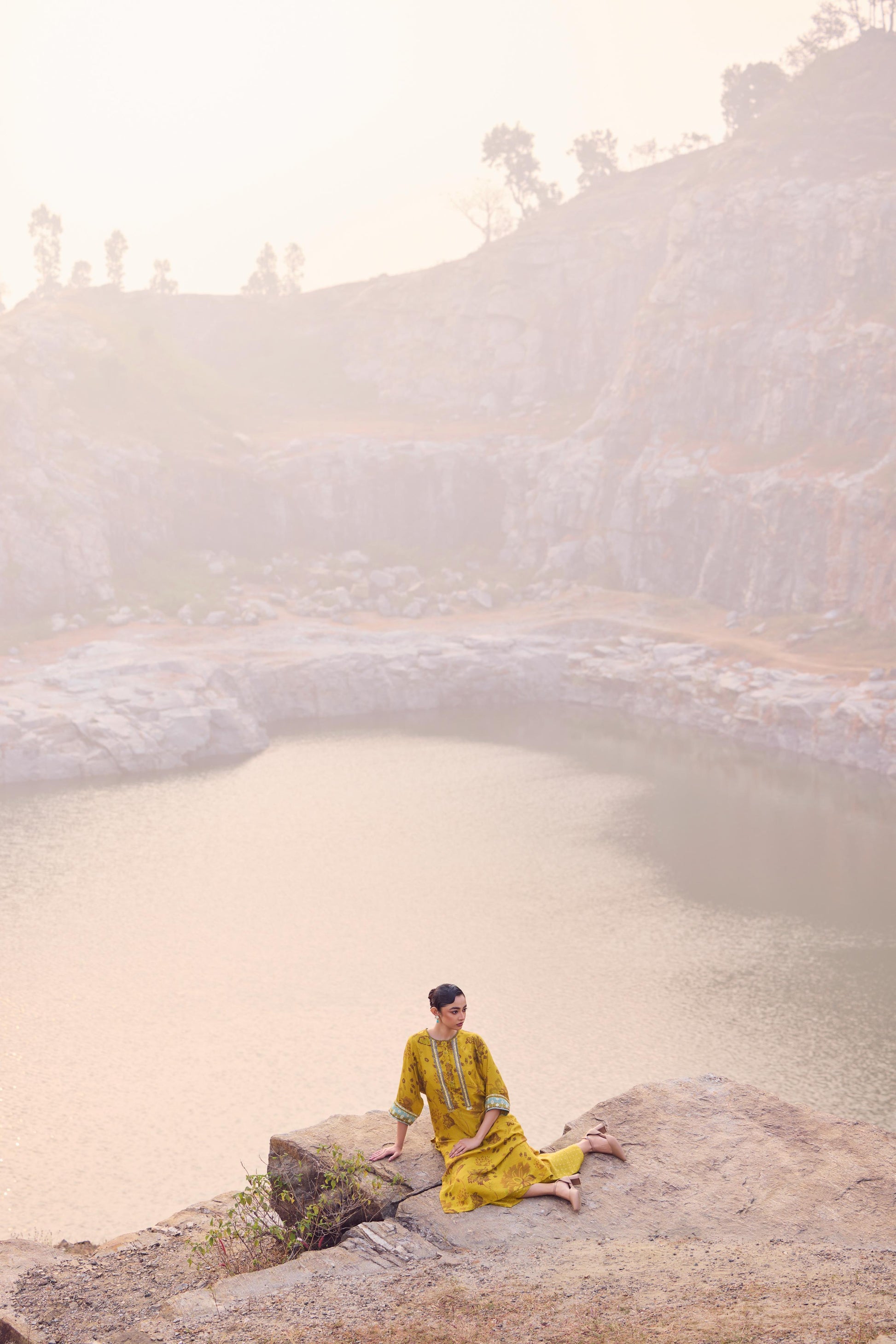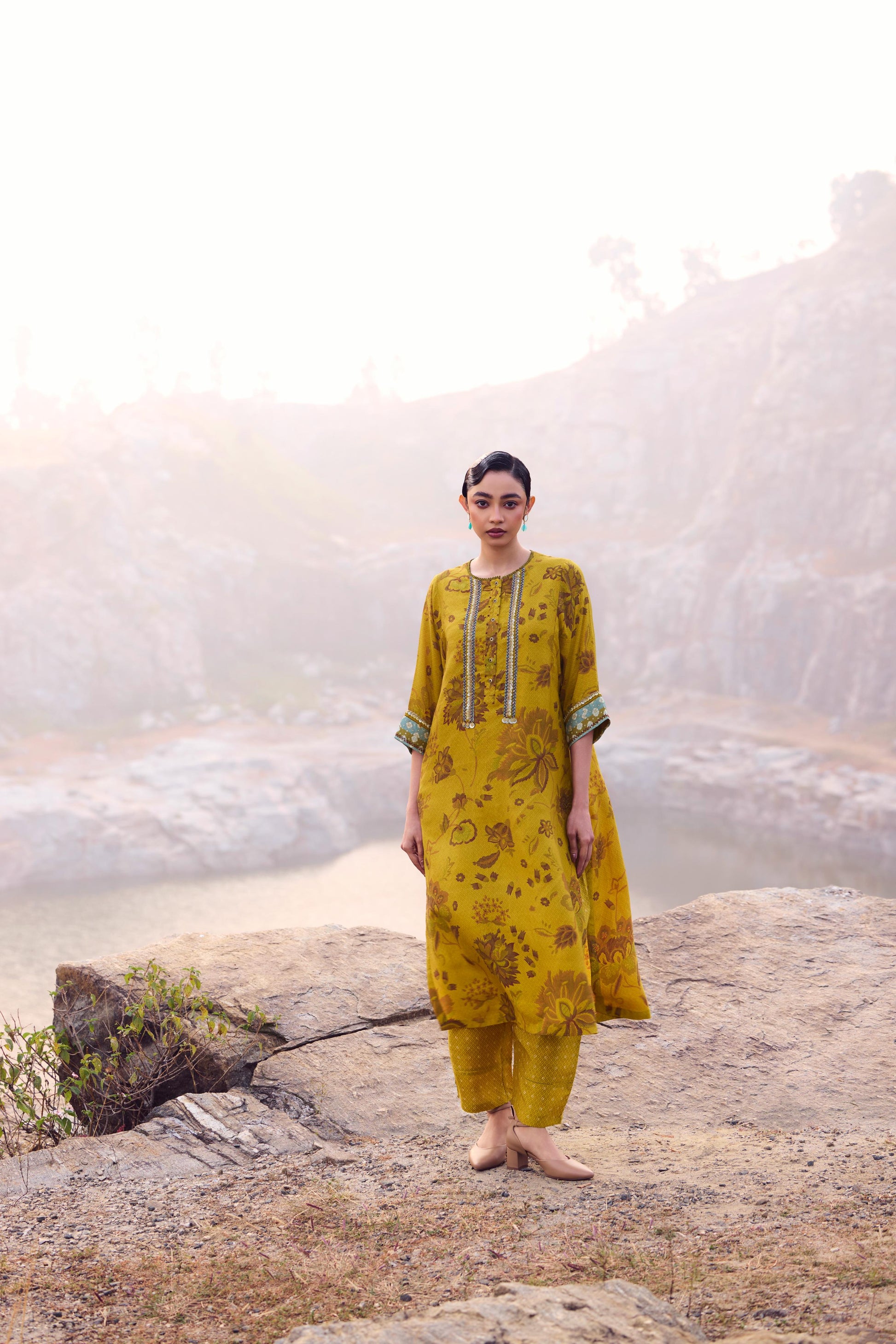 Mustard hand woven, hand printed mulberry silk kurta, with embroidery detail on front, back and sleeves paired with pants.