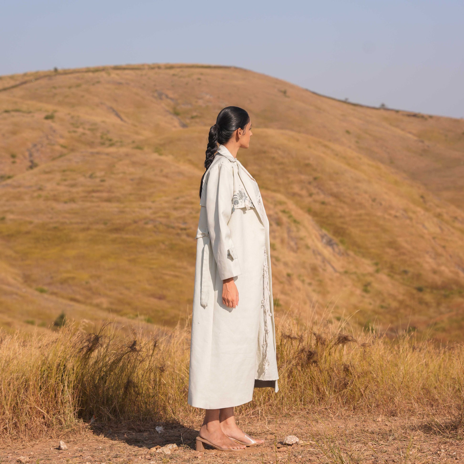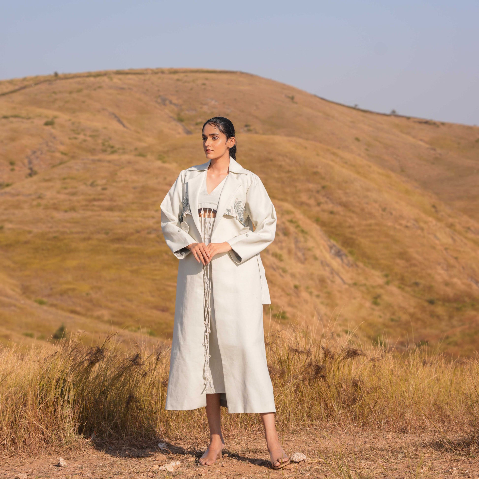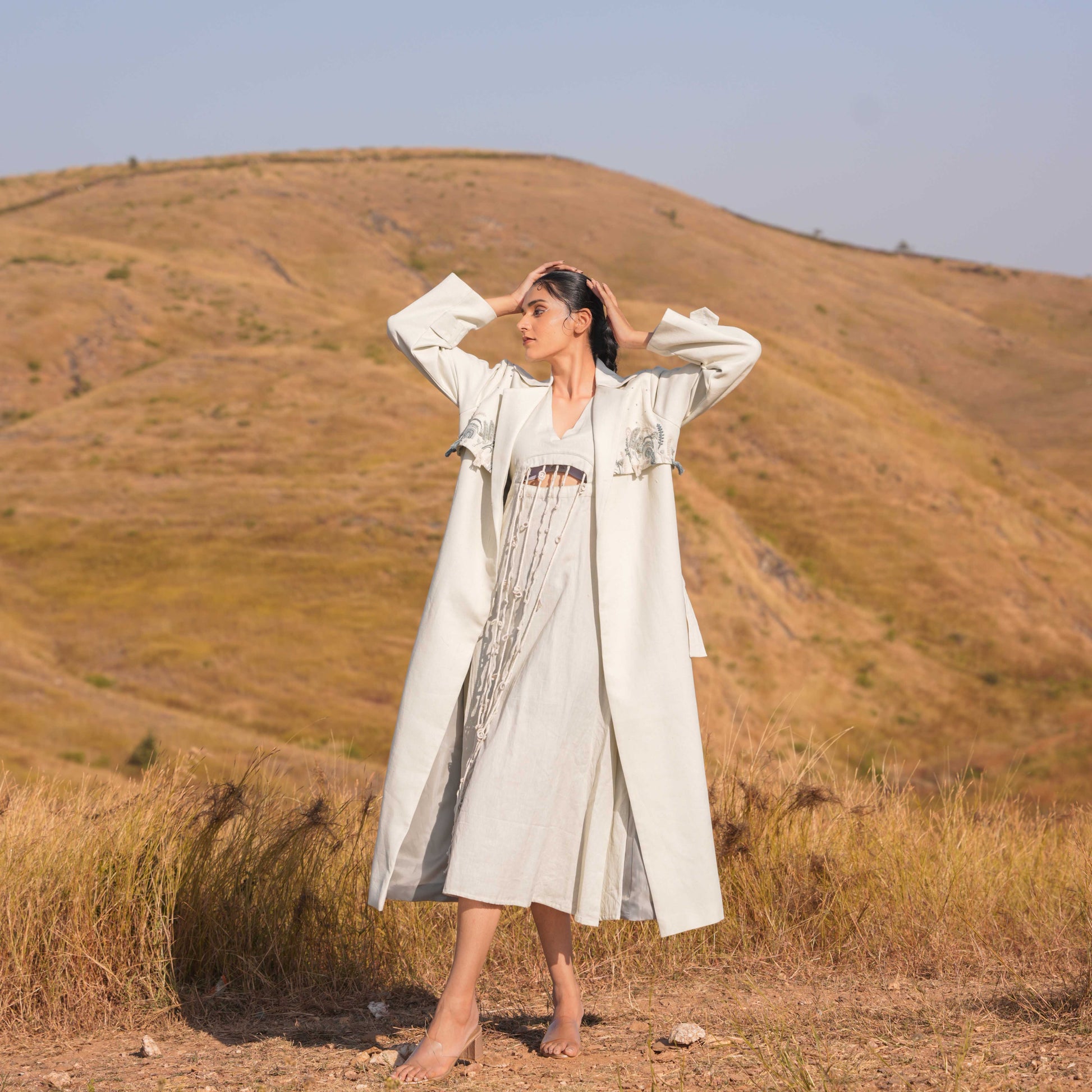 Accompanying the Dress, our Jacket captivates with a smocked back adorned in vibrant multi- color threads, creating a dynamic texture that catches the eye. Delicate floral appliques on the front panel add a charming touch, complemented by applique button details for a sophisticated finish. Pleats, whimsical knots, and printed borders on the sleeves complete the ensemble, showcasing artisanal craftsmanship and sophisticated style.