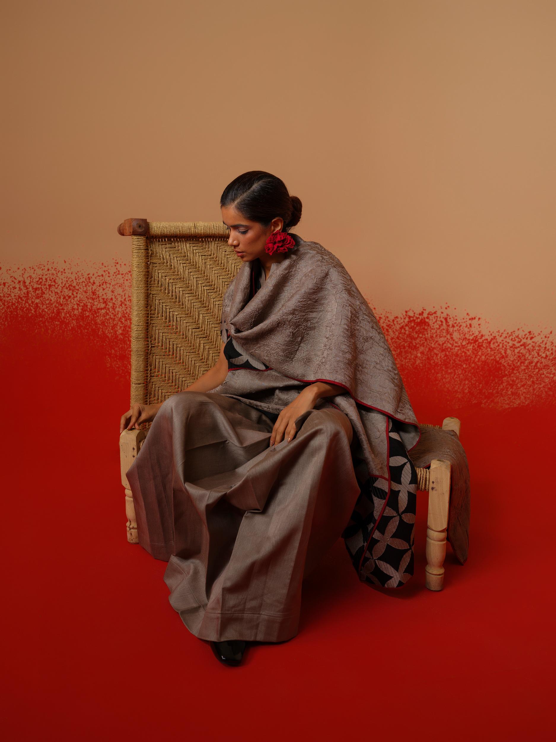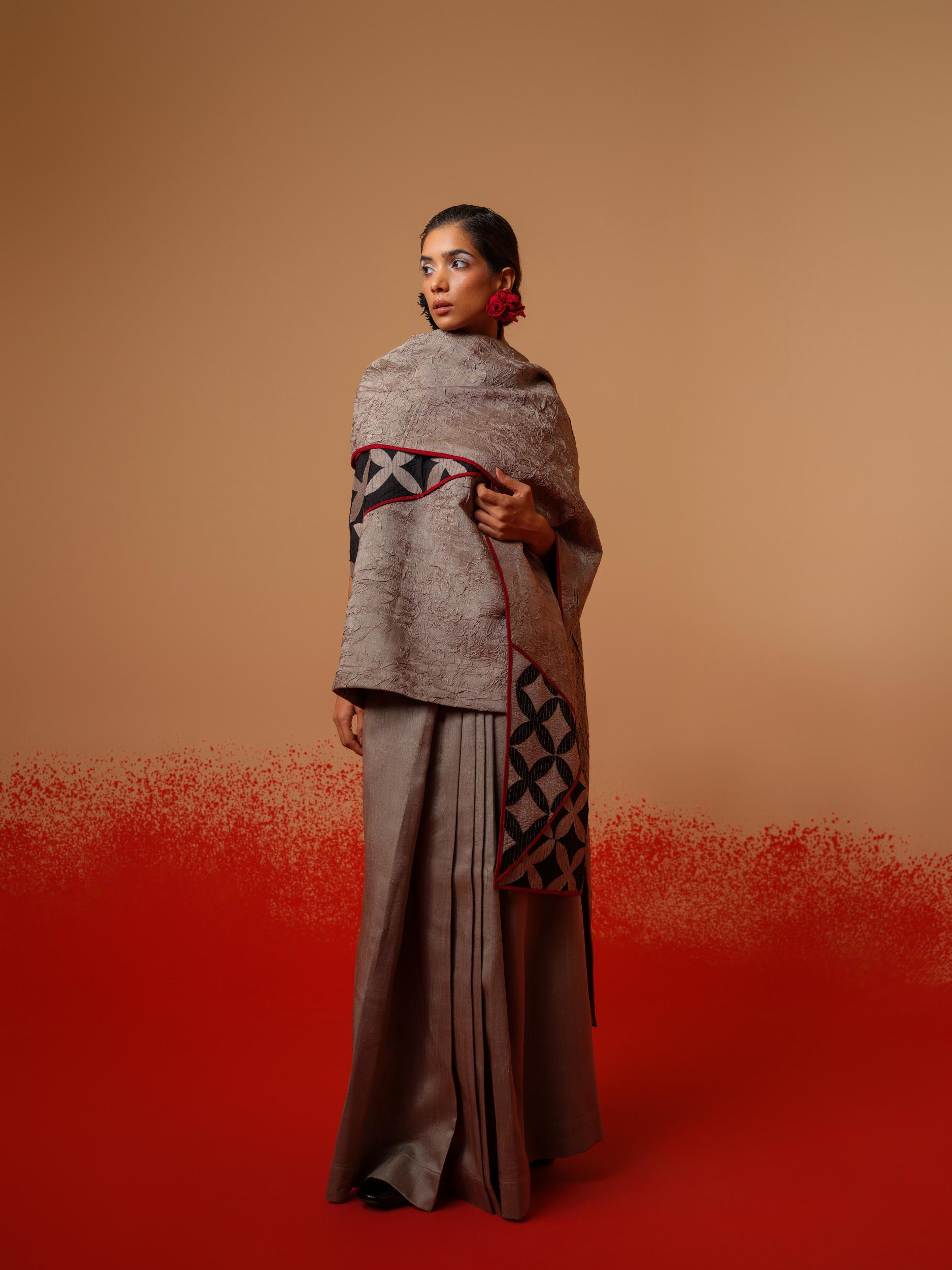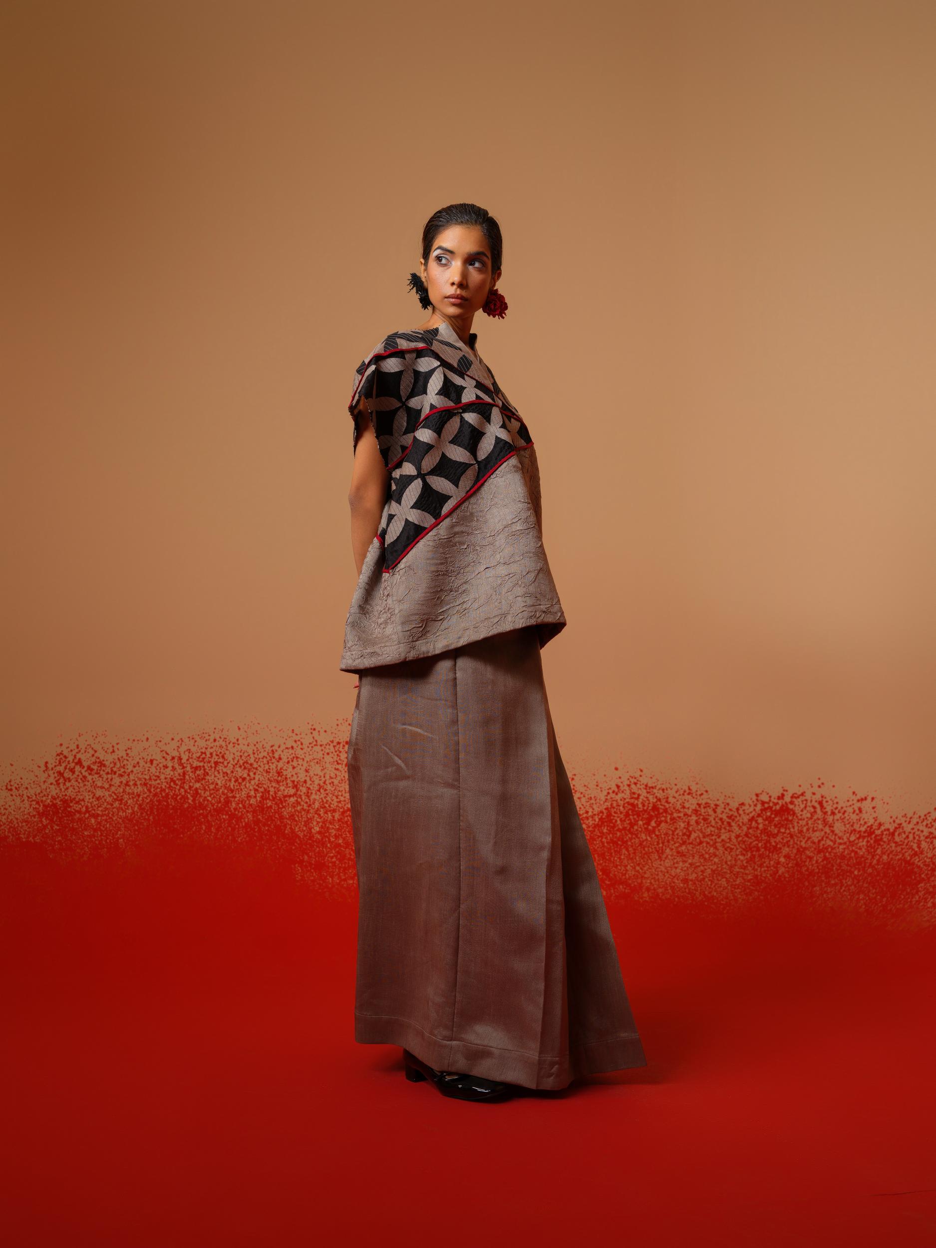 Draped like memory, structured like thought. A sari-inspired pleated skirt crafted in fused silk — sharp, sculptural pleats that hold shape while echoing the fluidity of a traditional drape.