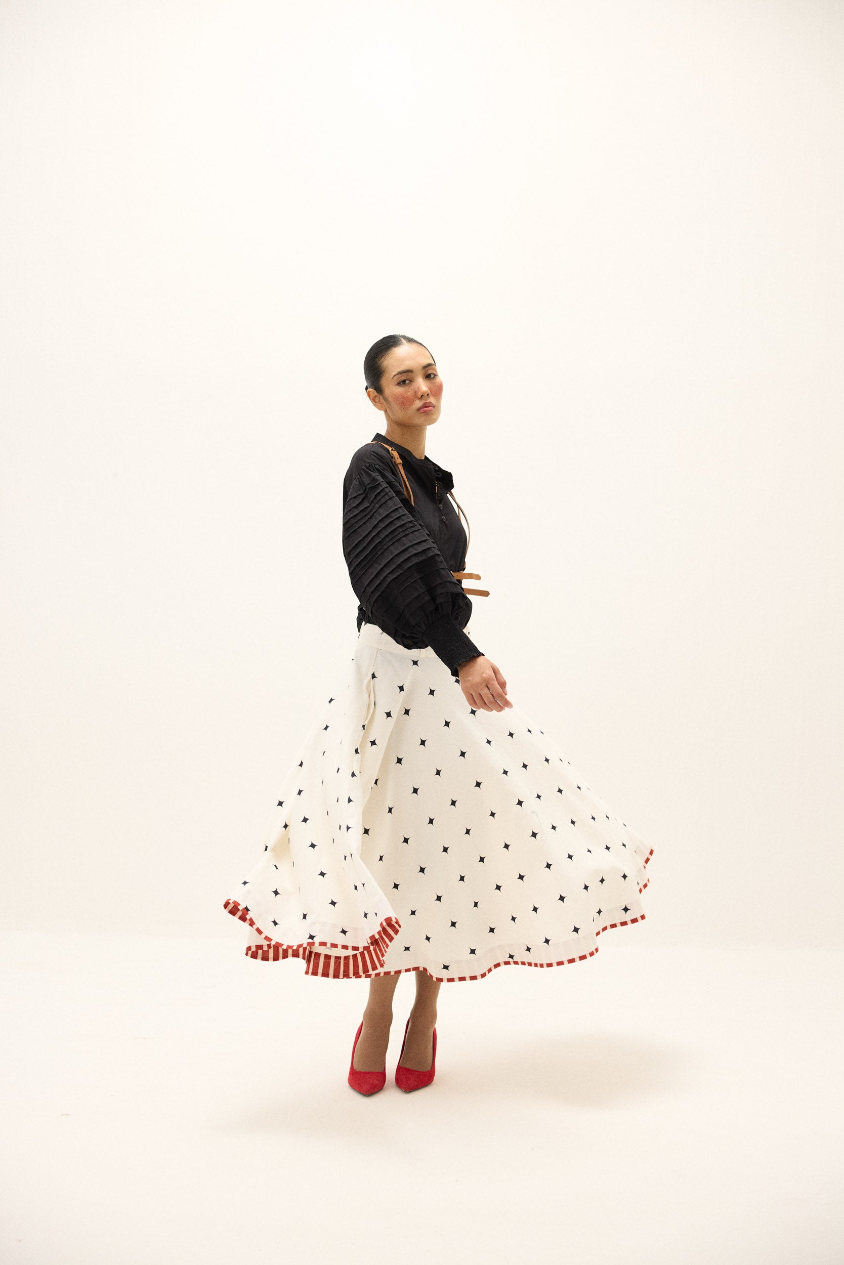 Crafted in sturdy yet fluid cotton canvas duck, featuring a flared silhouette adorned with hand-printed geometric motifs. The contrast check border adds a playful edge to its refined structure. Thoughtfully tailored with side pockets and a mid-waist fit, it transitions seamlessly from statement daywear to contemporary occasion dressing.