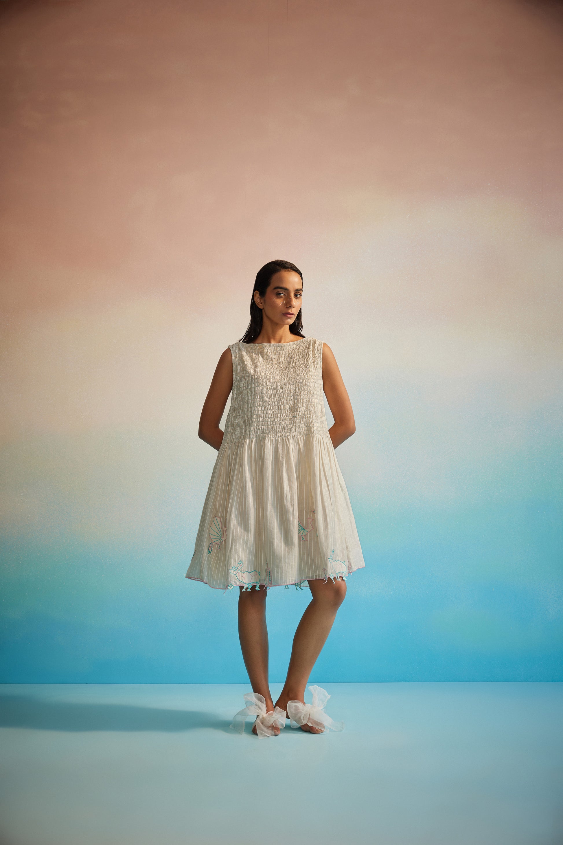 The Miyabi Dress is an ode to detail and delicacy. Crafted in hand screenprinted striped Chanderi, it features intricate ruching along the body that creates soft gathers, allowing the fabric to fall with graceful fluidity. Delicate appliqué work at the hem and scattered across the body adds gentle texture, while a back keyhole closure offers a refined finishing touch. Miyabi is a piece that speaks in soft, sophisticated tones — timeless, elegant, and endlessly versatile.