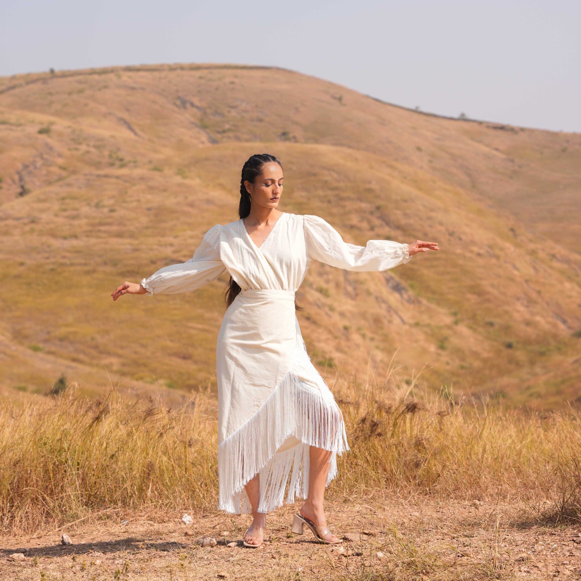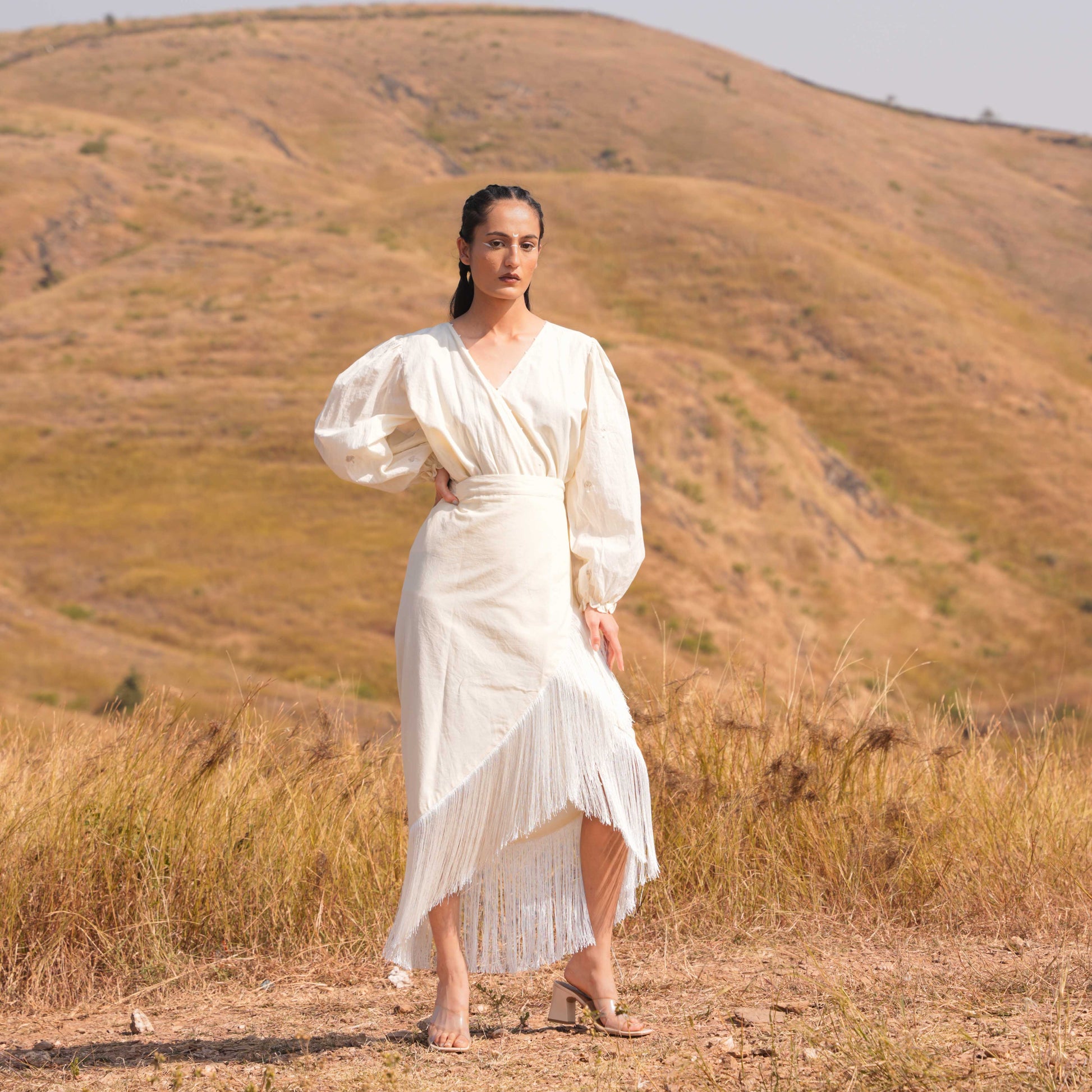 Embrace effortless elegance with our designed to captivate with every detail. Featuring a flattering V neckline adorned with tone-on-tone embroidery, this dress exudes understated sophistication. Organza flower details delicately enhance the neckline, adding a touch of texture and charm. The sleeves are adorned with intricate lace detail, further enhancing its feminine allure.
