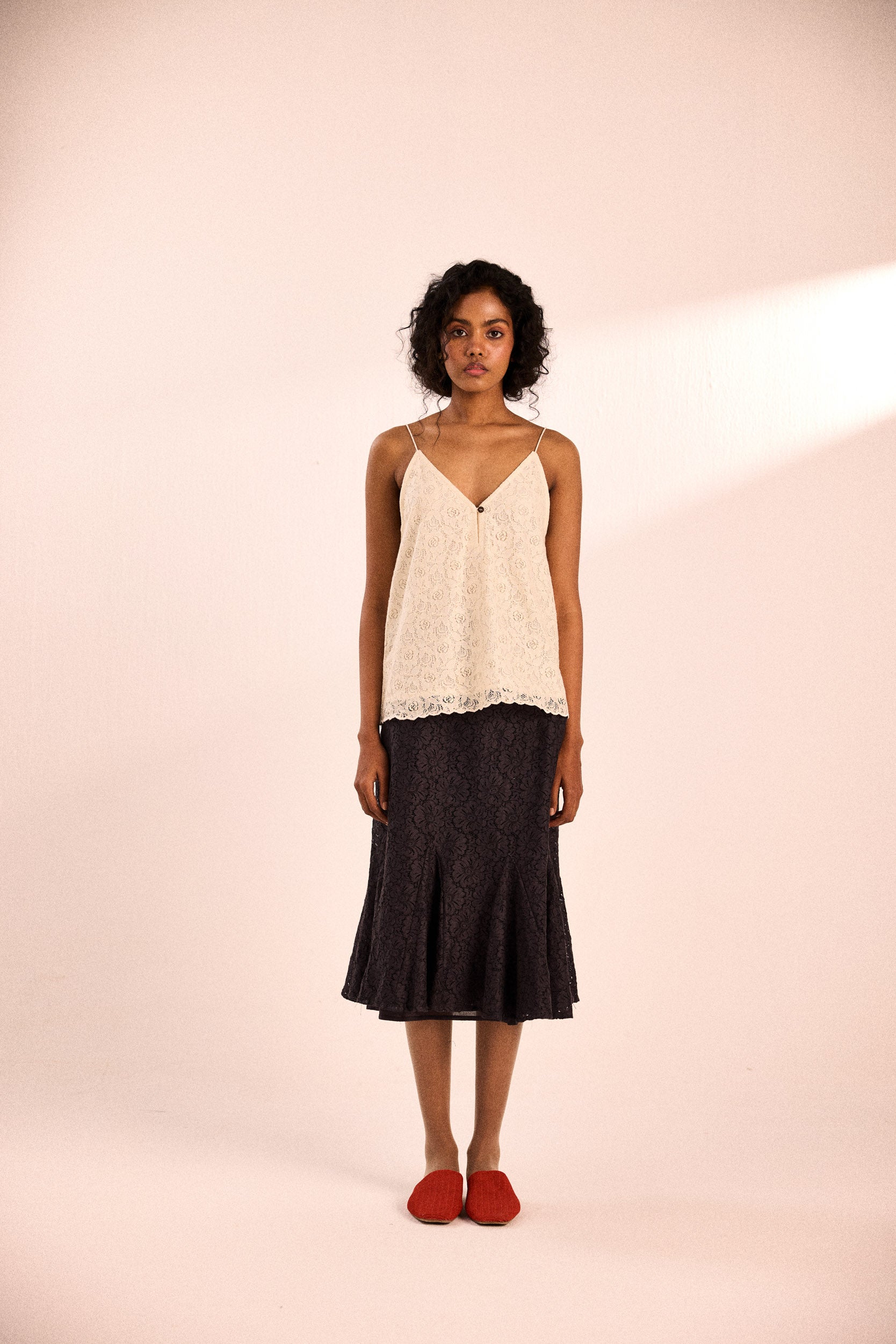 A delicate cotton lace top with a breezy silhouette, thin straps, and a subtle front button detail. Finished with a scalloped lace hem for an effortlessly romantic touch.