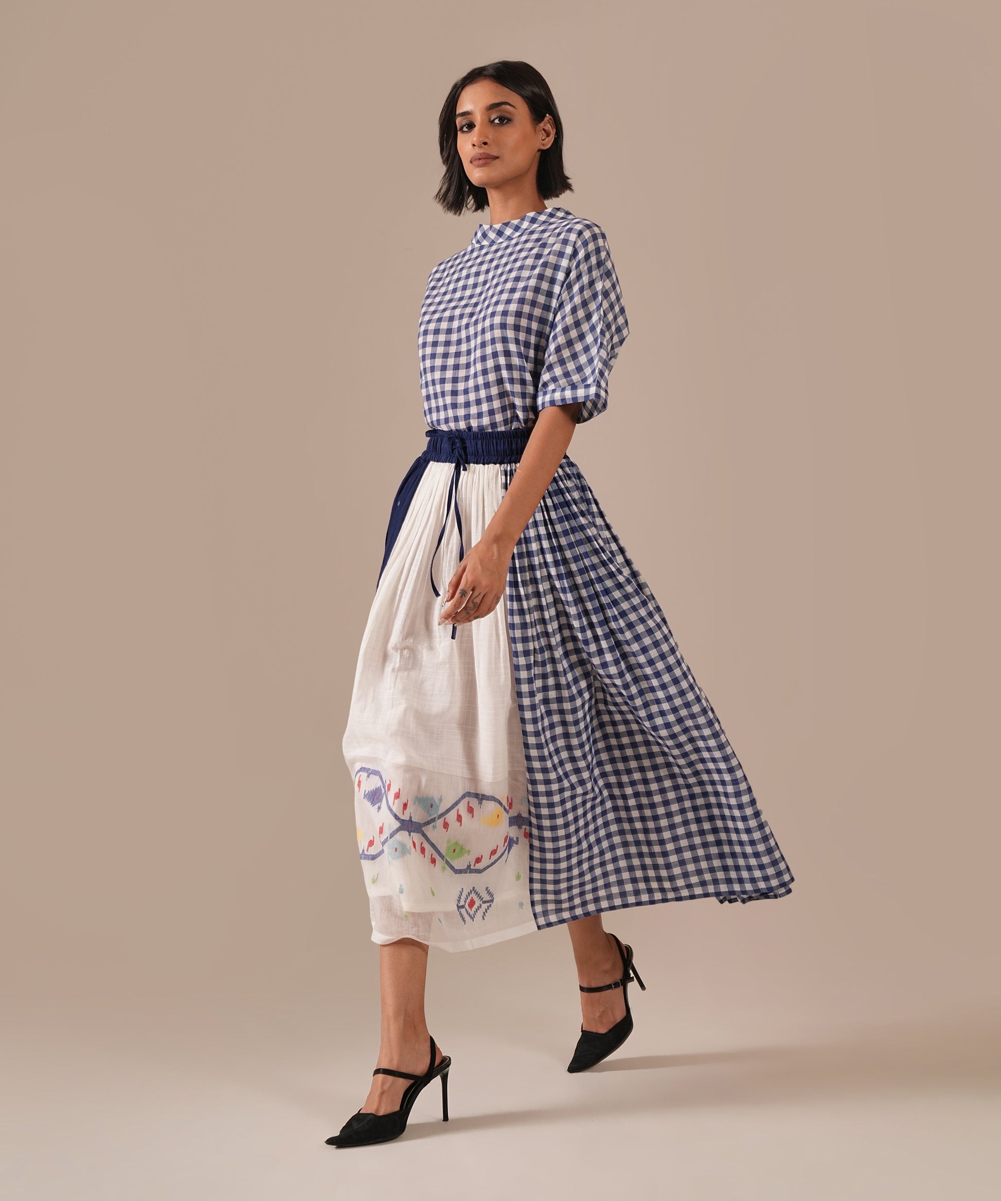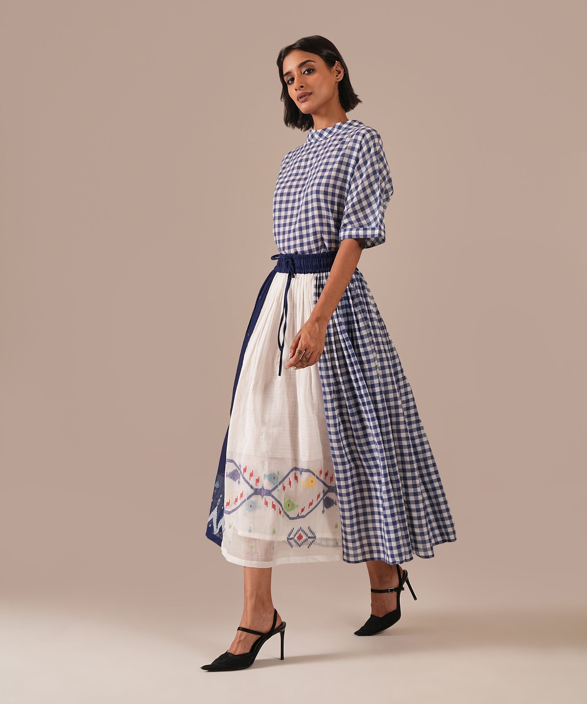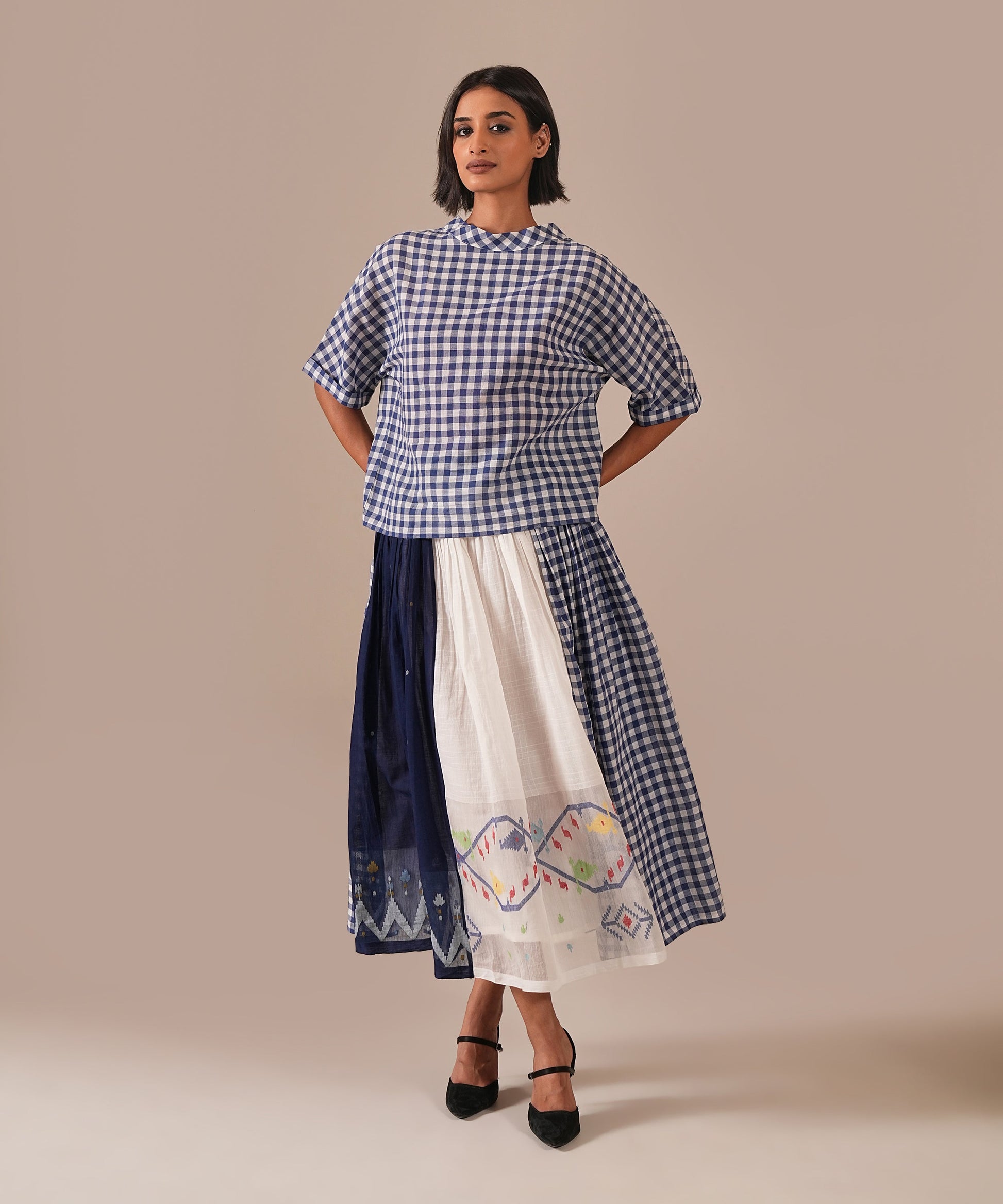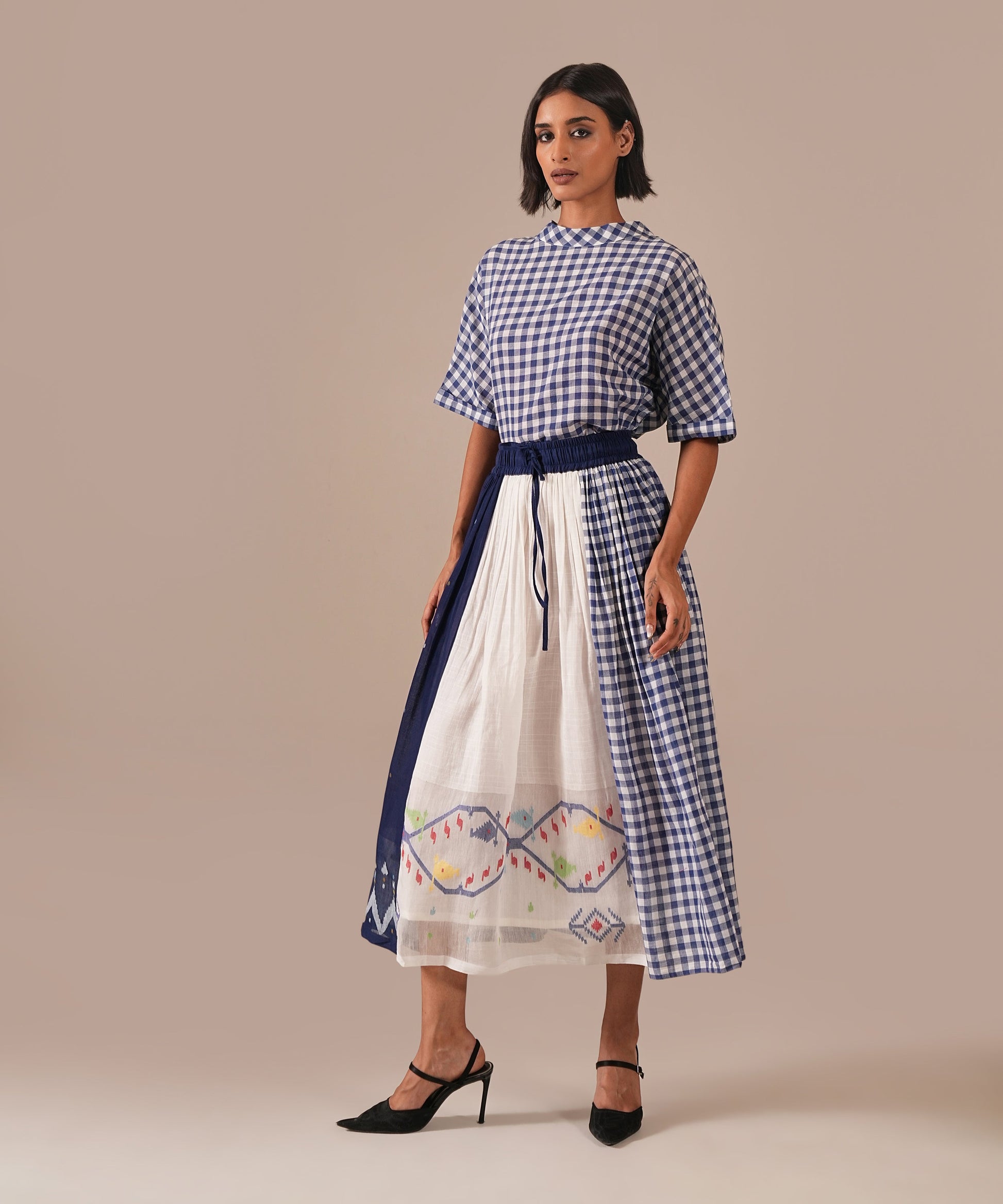 A classic Jamdani ensemble with a boxy top and a gathered skirt, accented with contrast Jamdani panel details, an elasticated waist for effortless comfort, and convenient side pockets where timeless craftsmanship meets everyday ease.