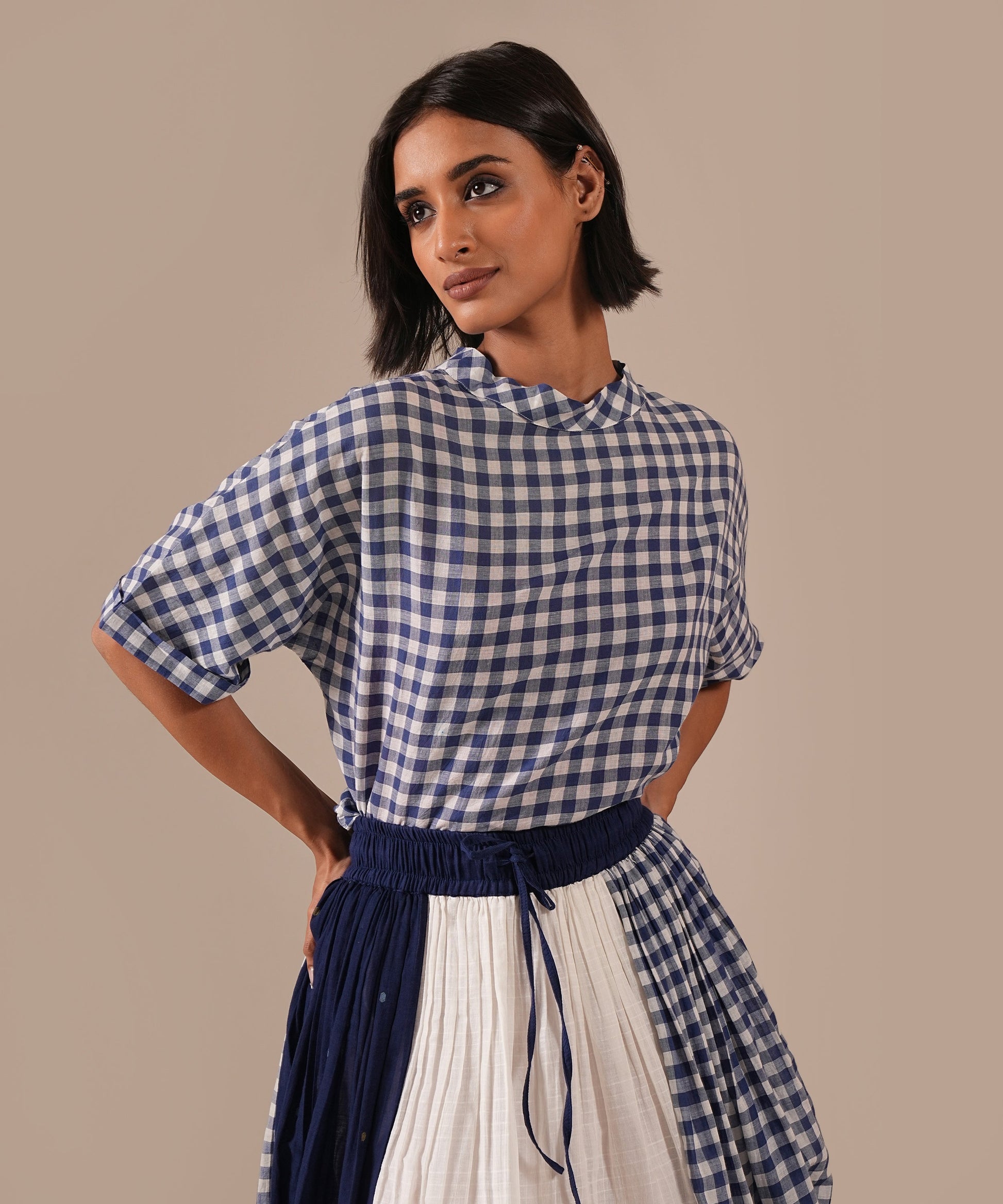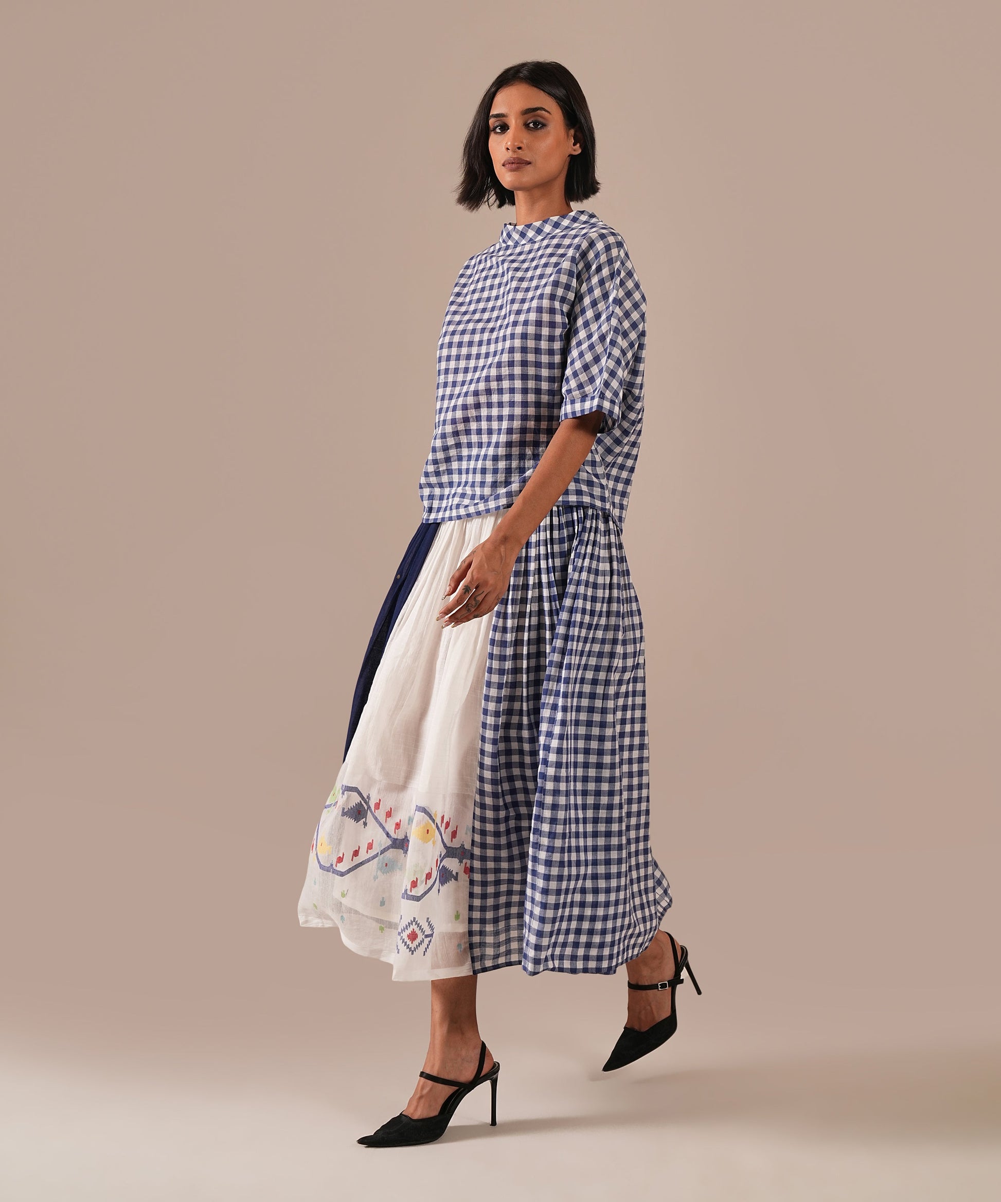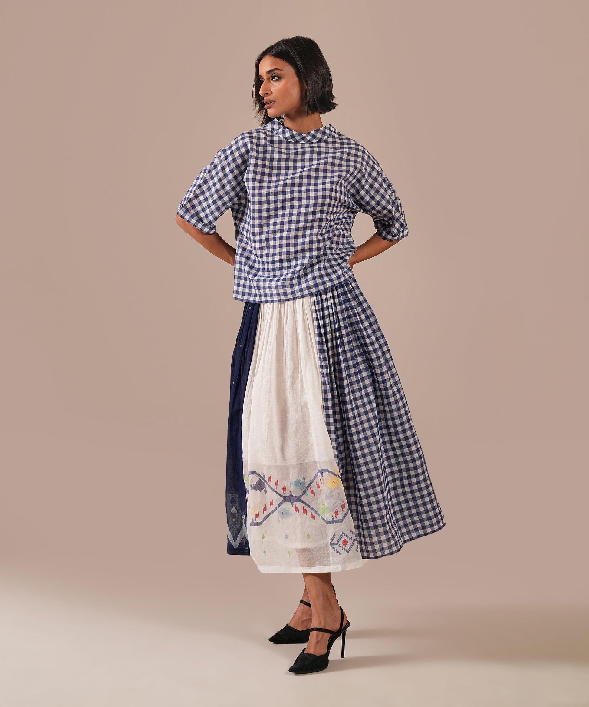 A classic Jamdani ensemble with a boxy top and a gathered skirt, accented with contrast Jamdani panel details, an elasticated waist for effortless comfort, and convenient side pockets where timeless craftsmanship meets everyday ease.
