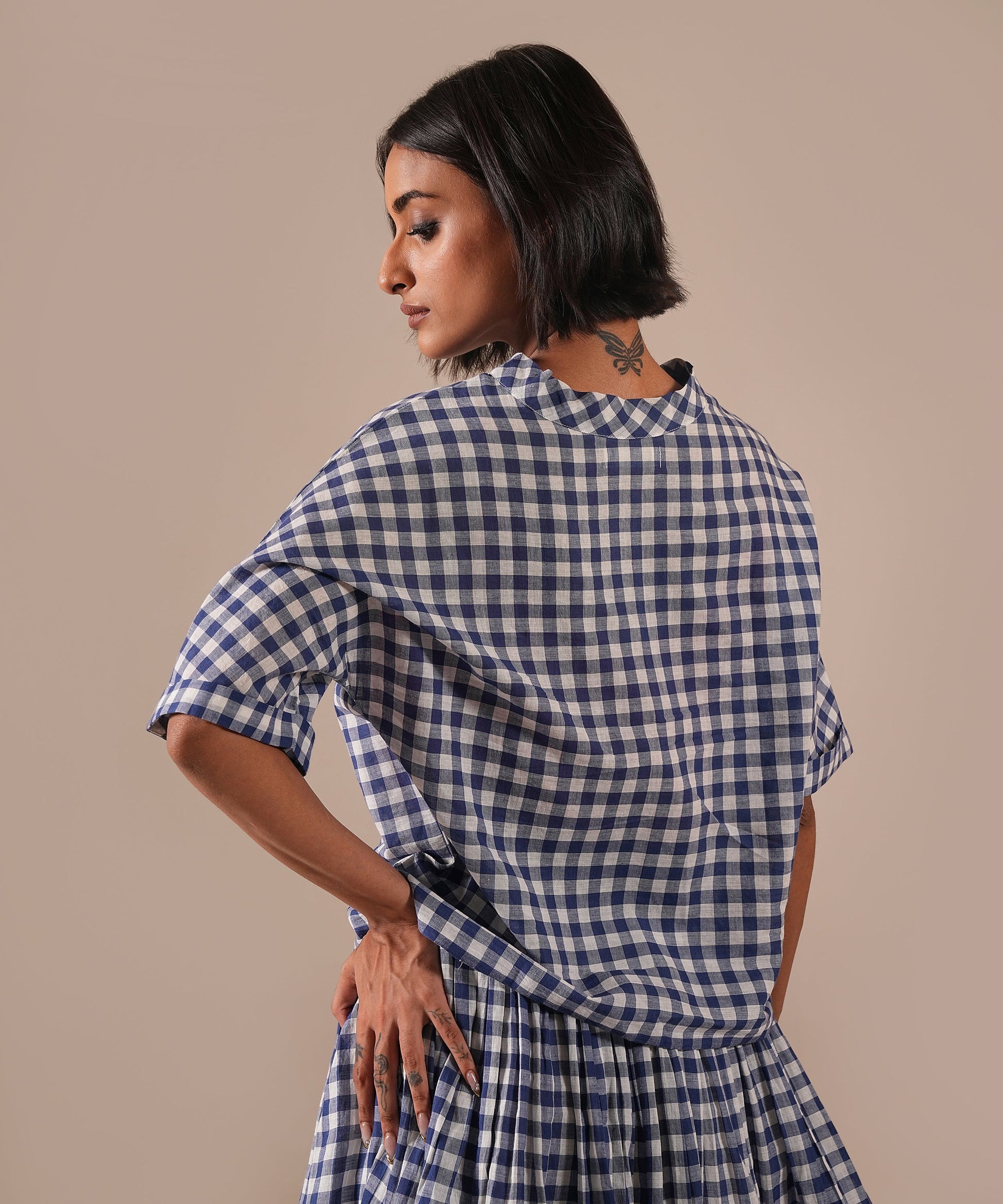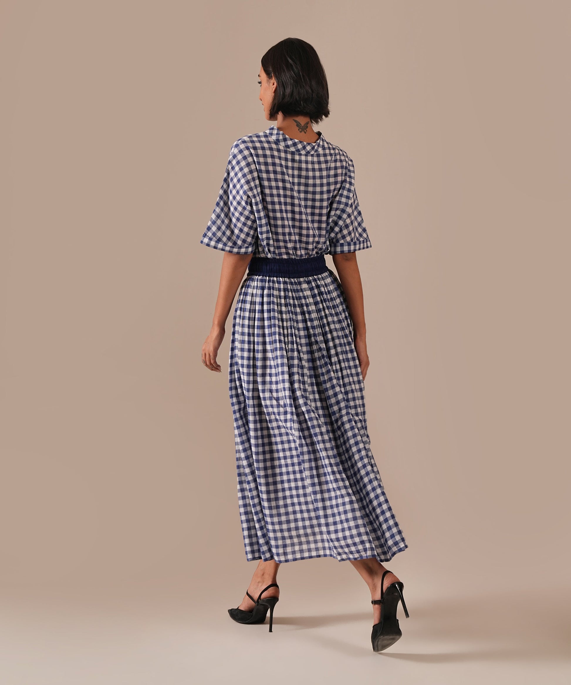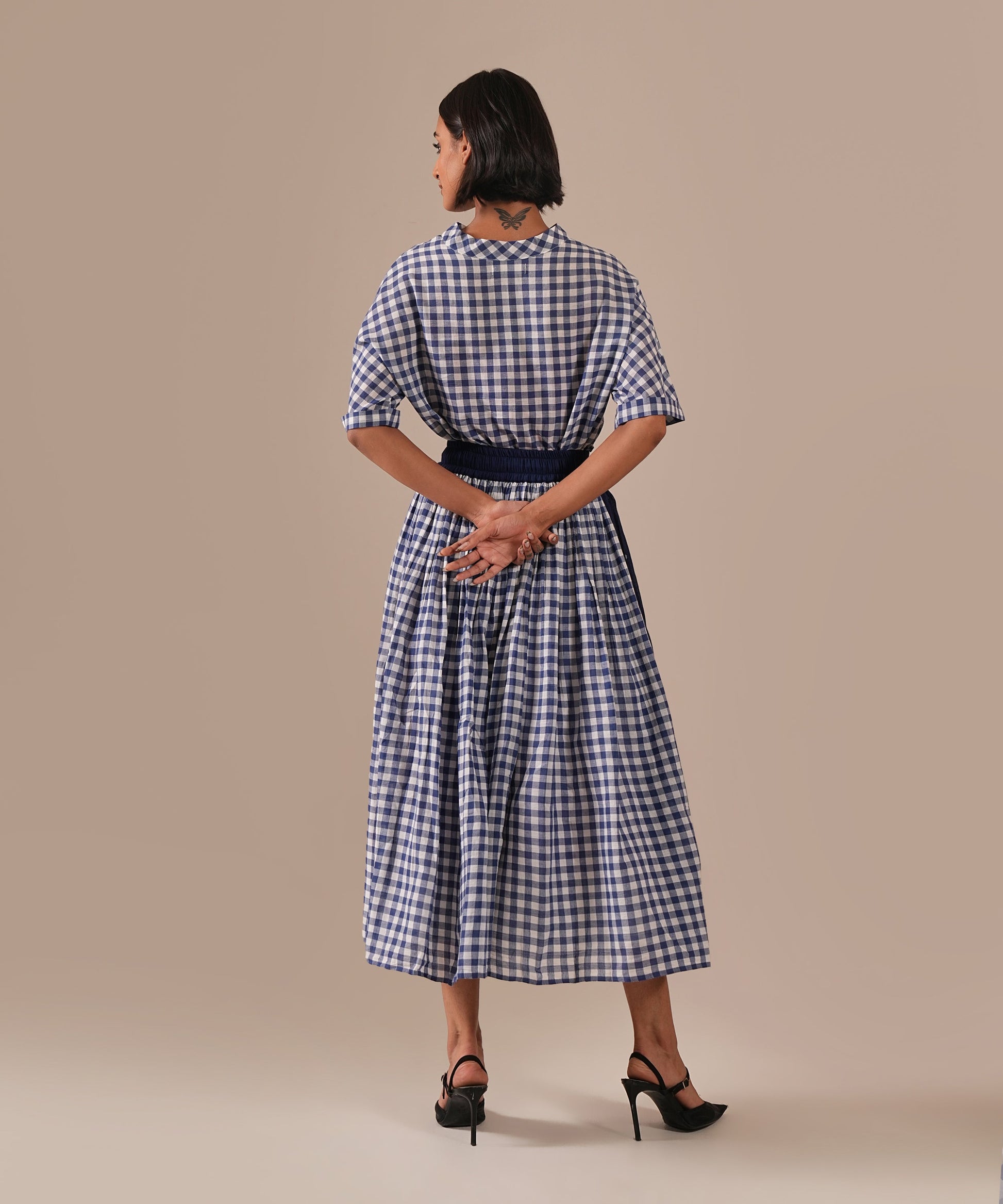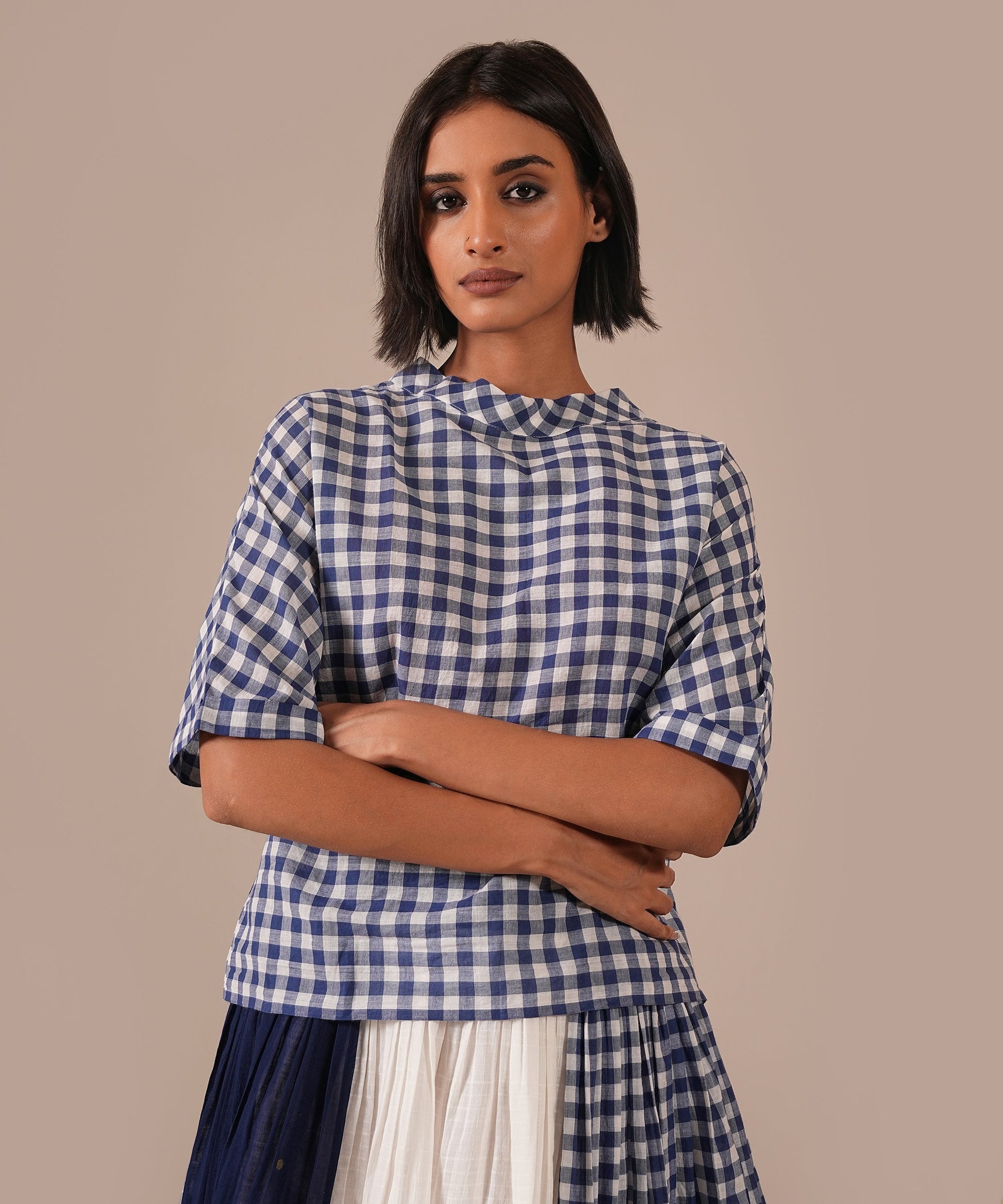 A classic Jamdani ensemble with a boxy top and a gathered skirt, accented with contrast Jamdani panel details, an elasticated waist for effortless comfort, and convenient side pockets where timeless craftsmanship meets everyday ease.