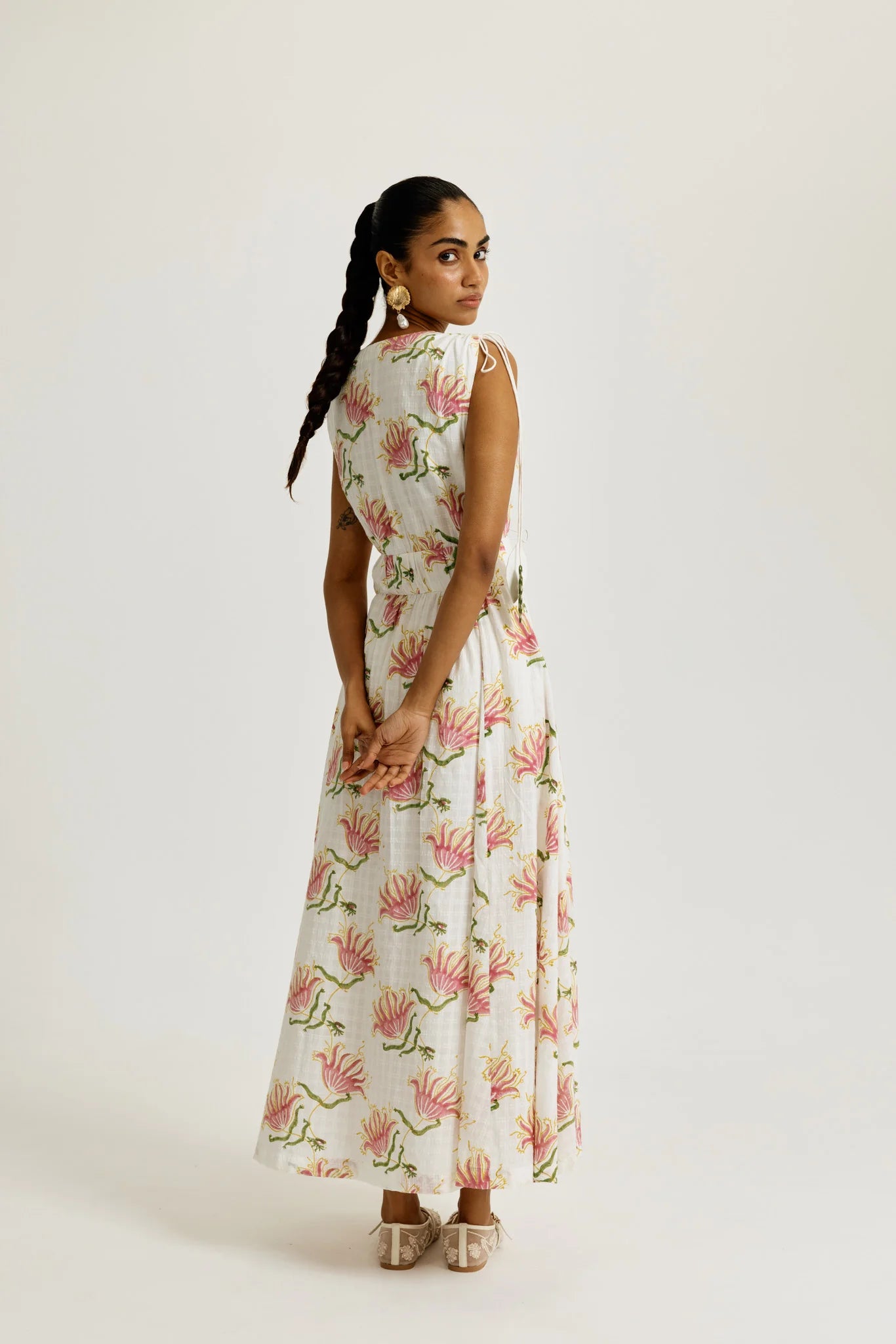 Breezy, playful, and made for sunlit days. This dress showcases our block-printed pink floral motifs, on handwoven cotton. This sleeveless silhouette is detailed with delicate shoulder ties that you can adjust for the perfect fit. The softly gathered empire waist flatters the body, flowing into a full, ankle-grazing skirt.