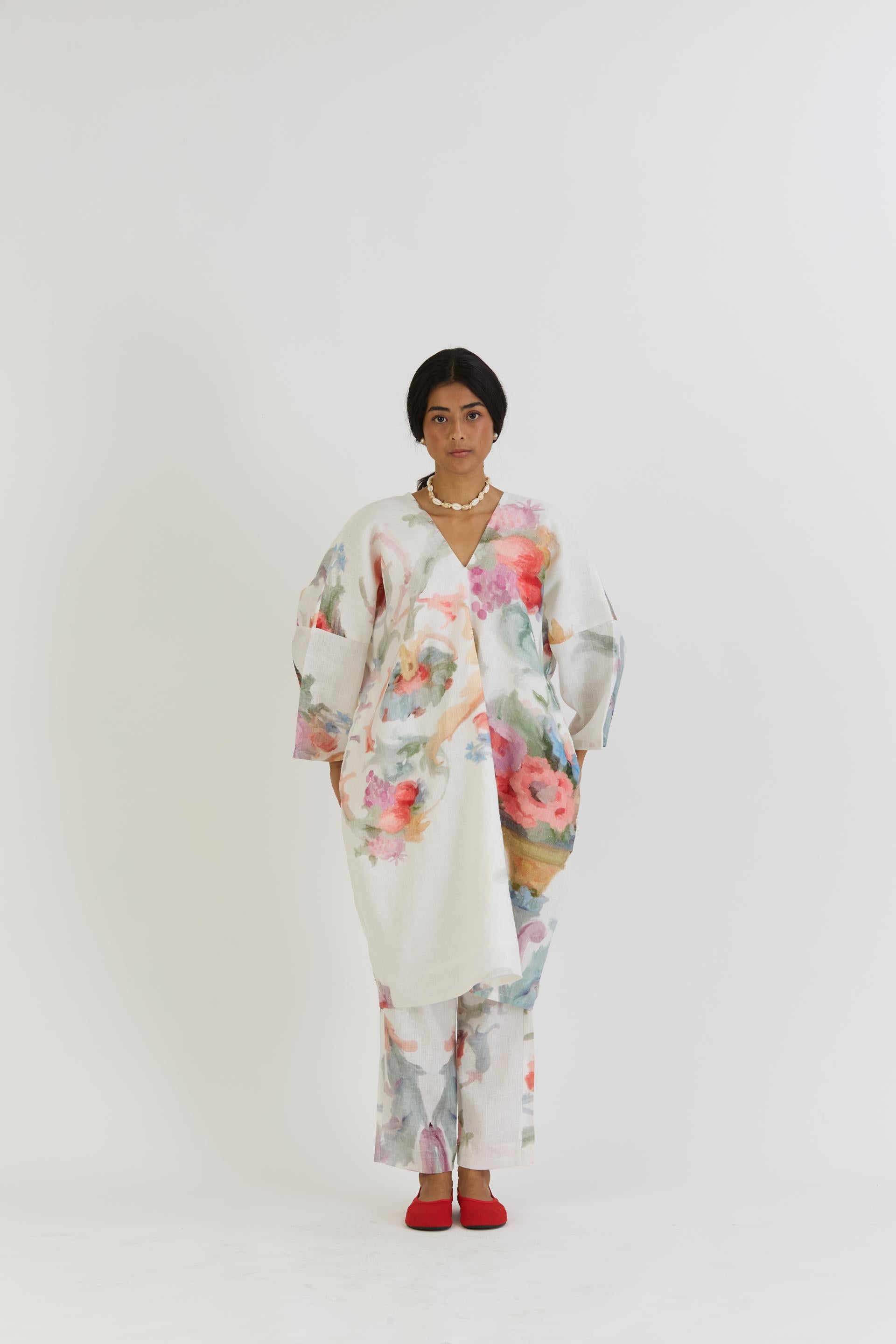 The kaftan-style kurta features a V neckline on both the front and back,