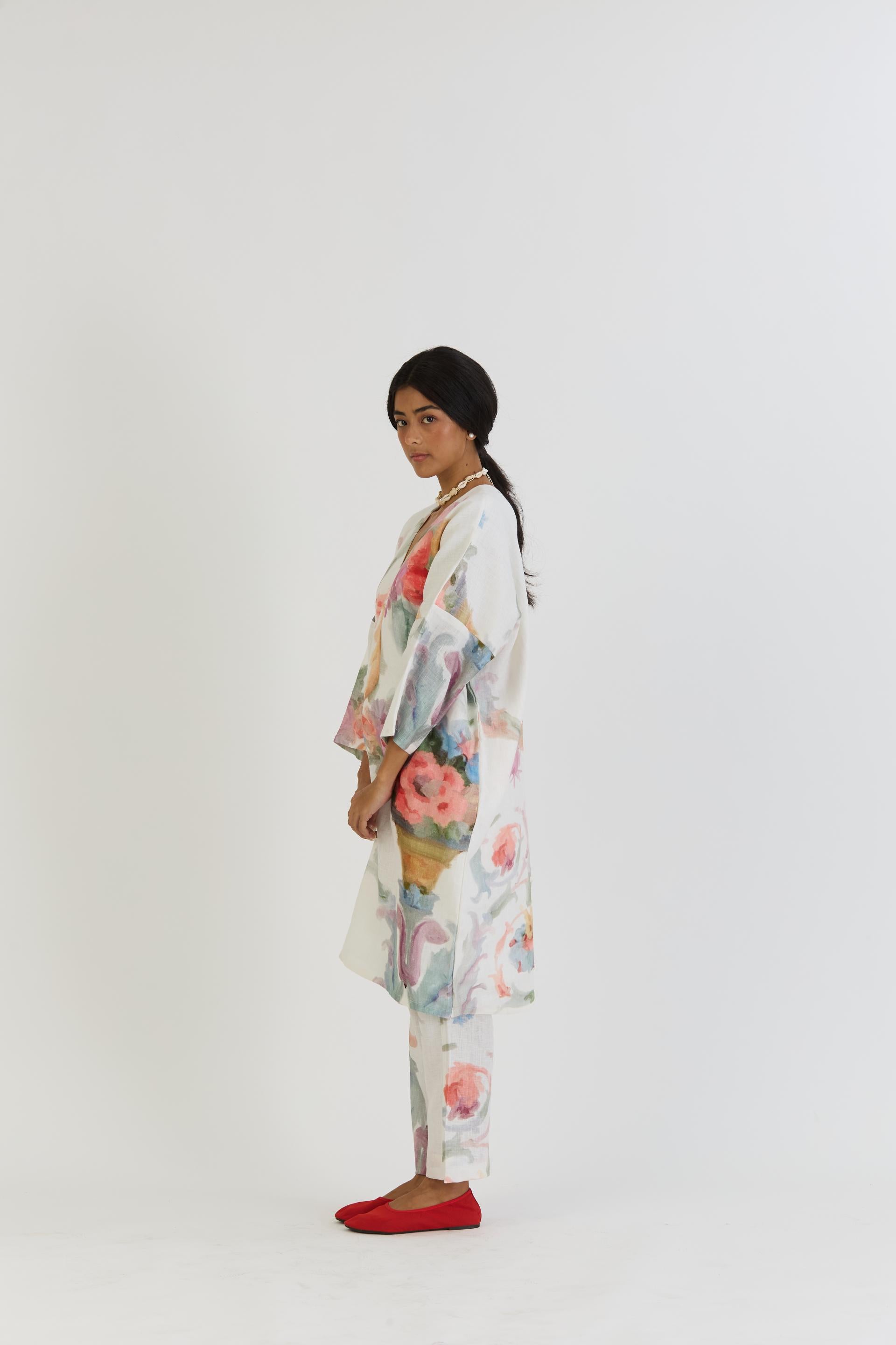 This set is beautifully adorned with a floral basket print on a pristine white base, making it a versatile and elegant addition to any wardrobe.