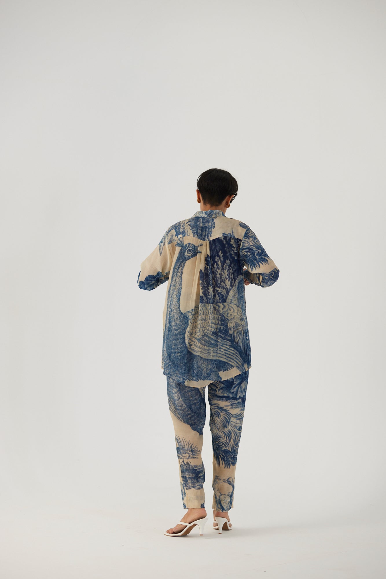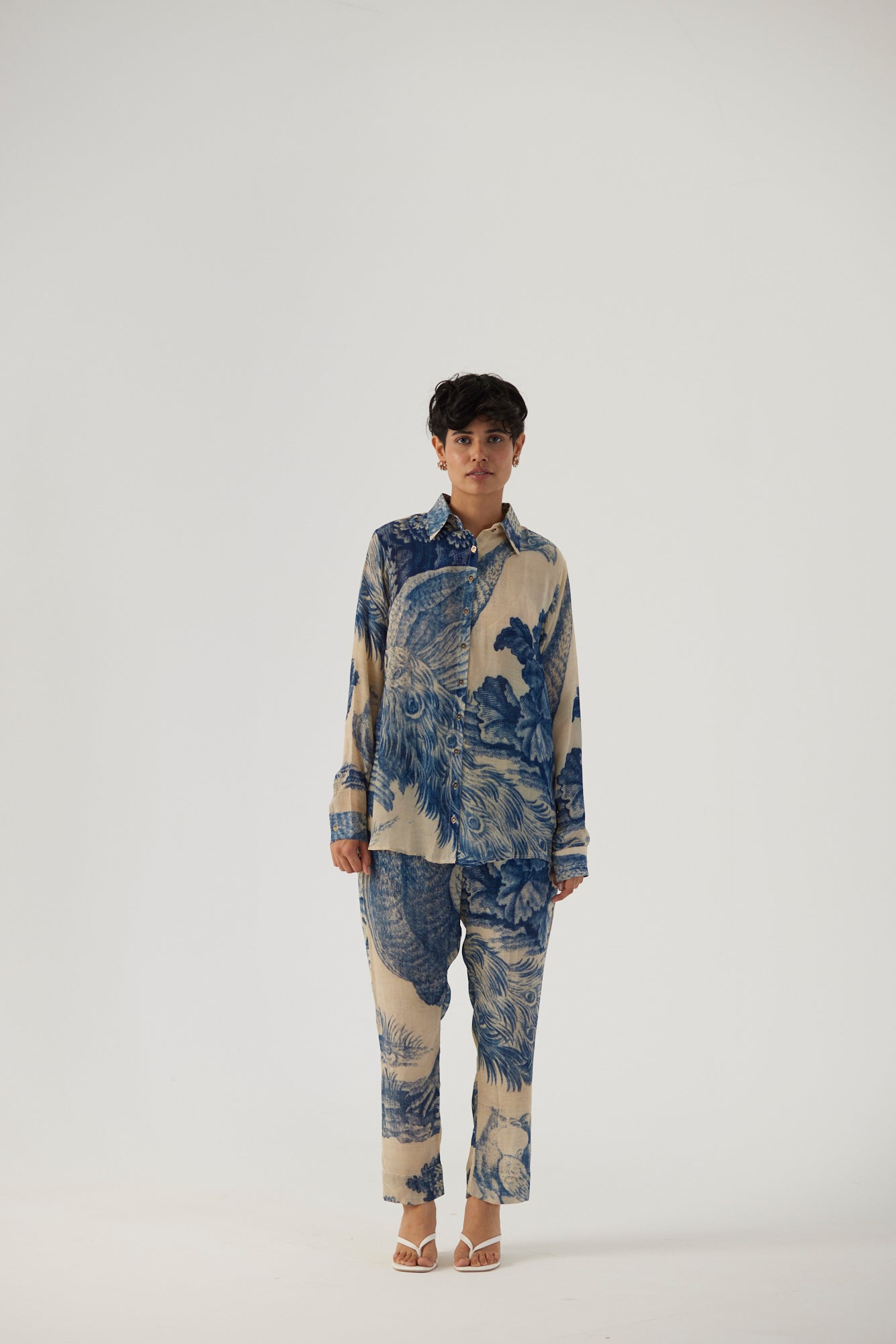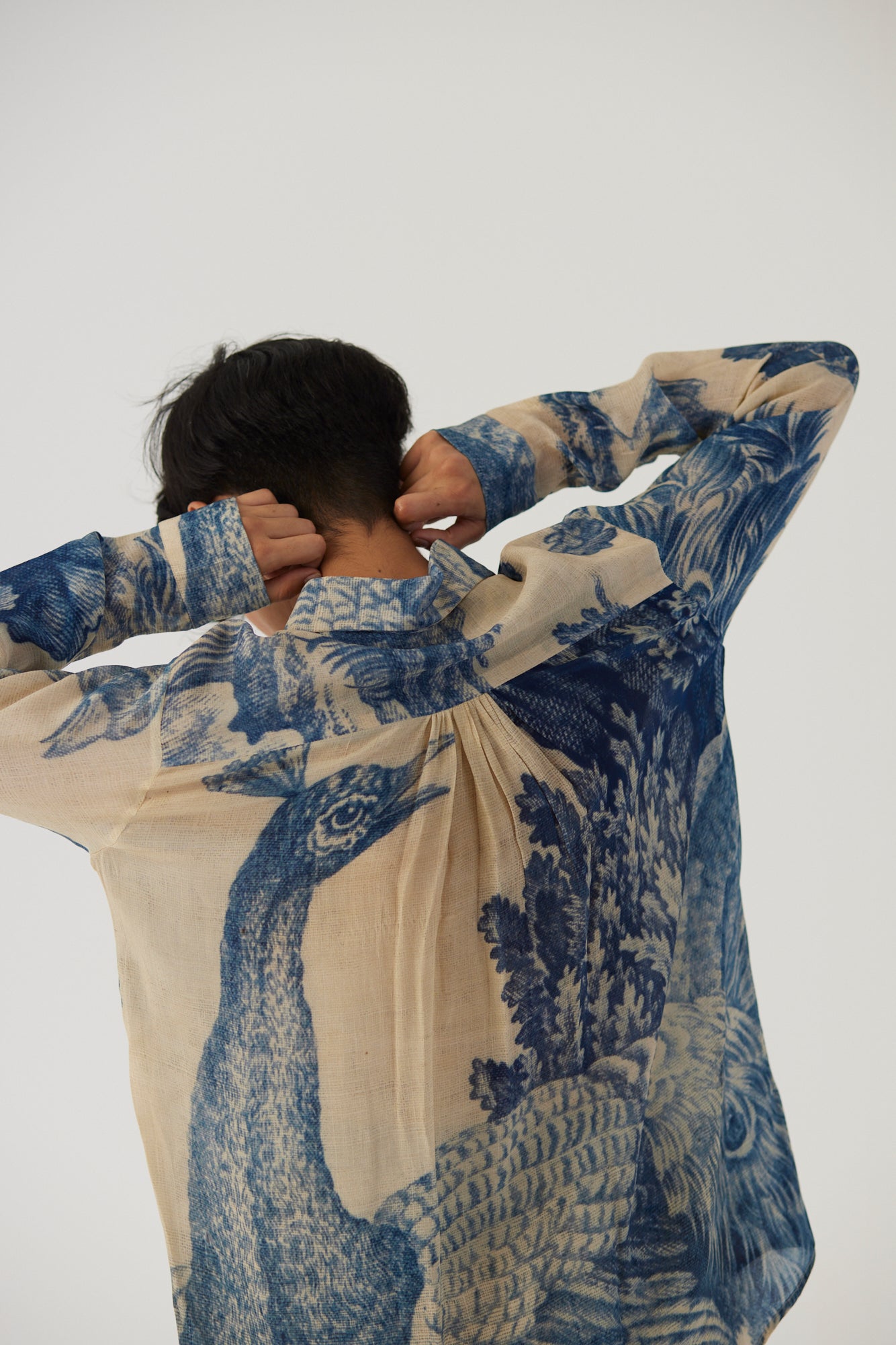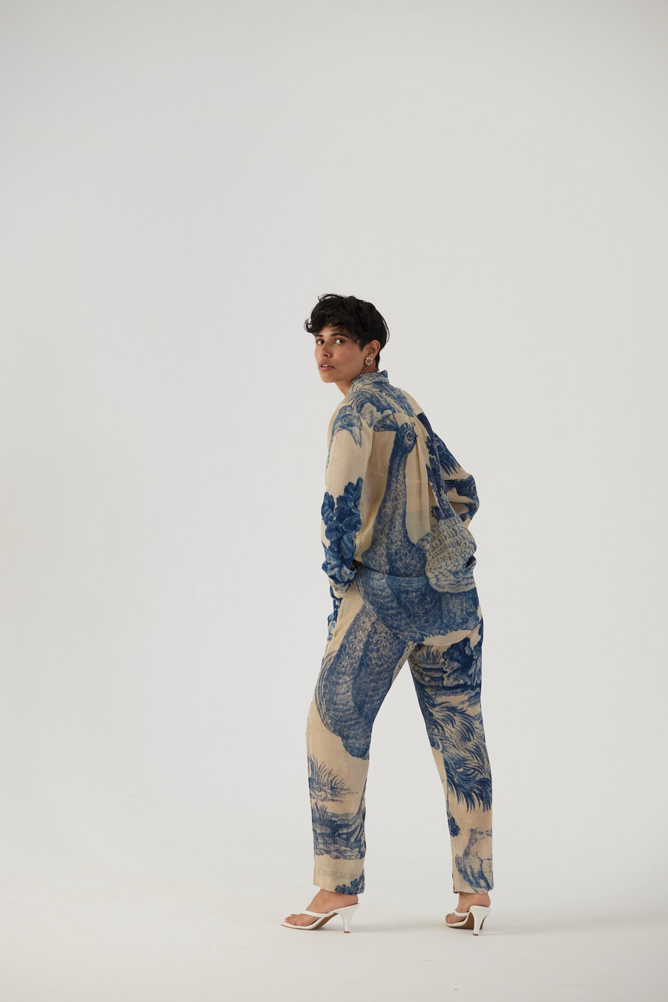 This print features a MOR(peacock) with intricate details and bold lines in the indigo colour.