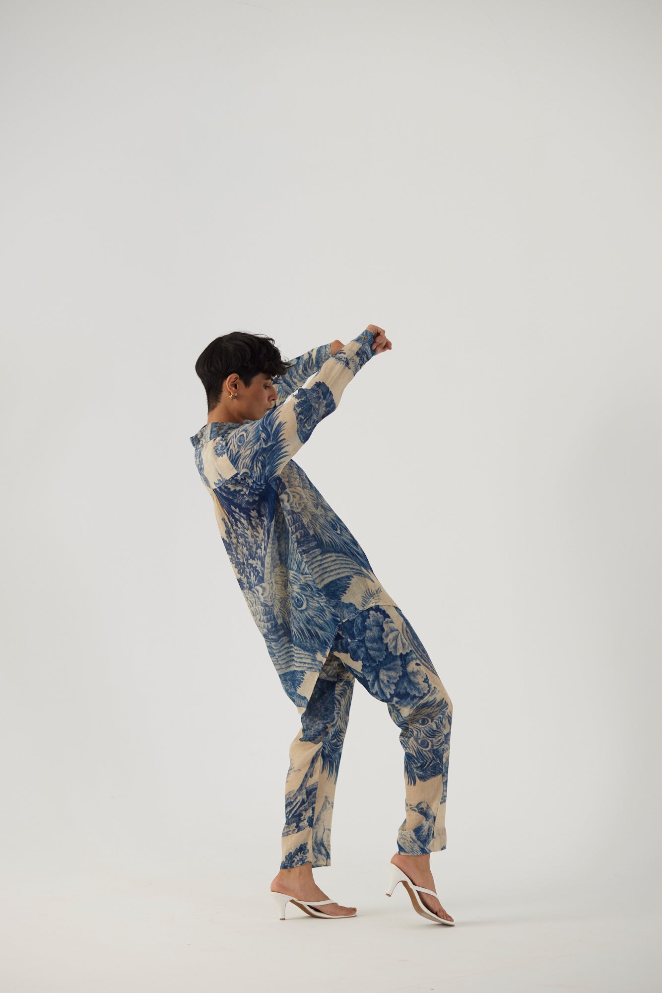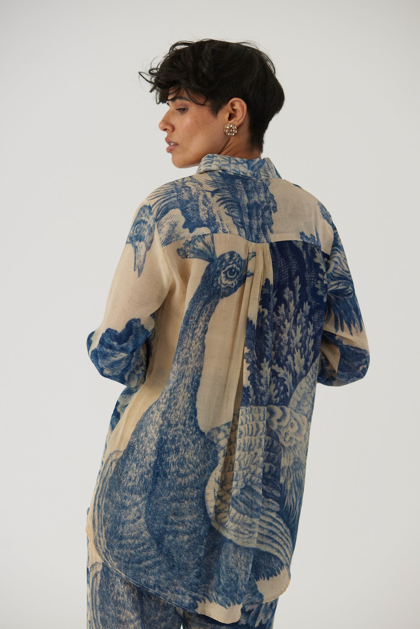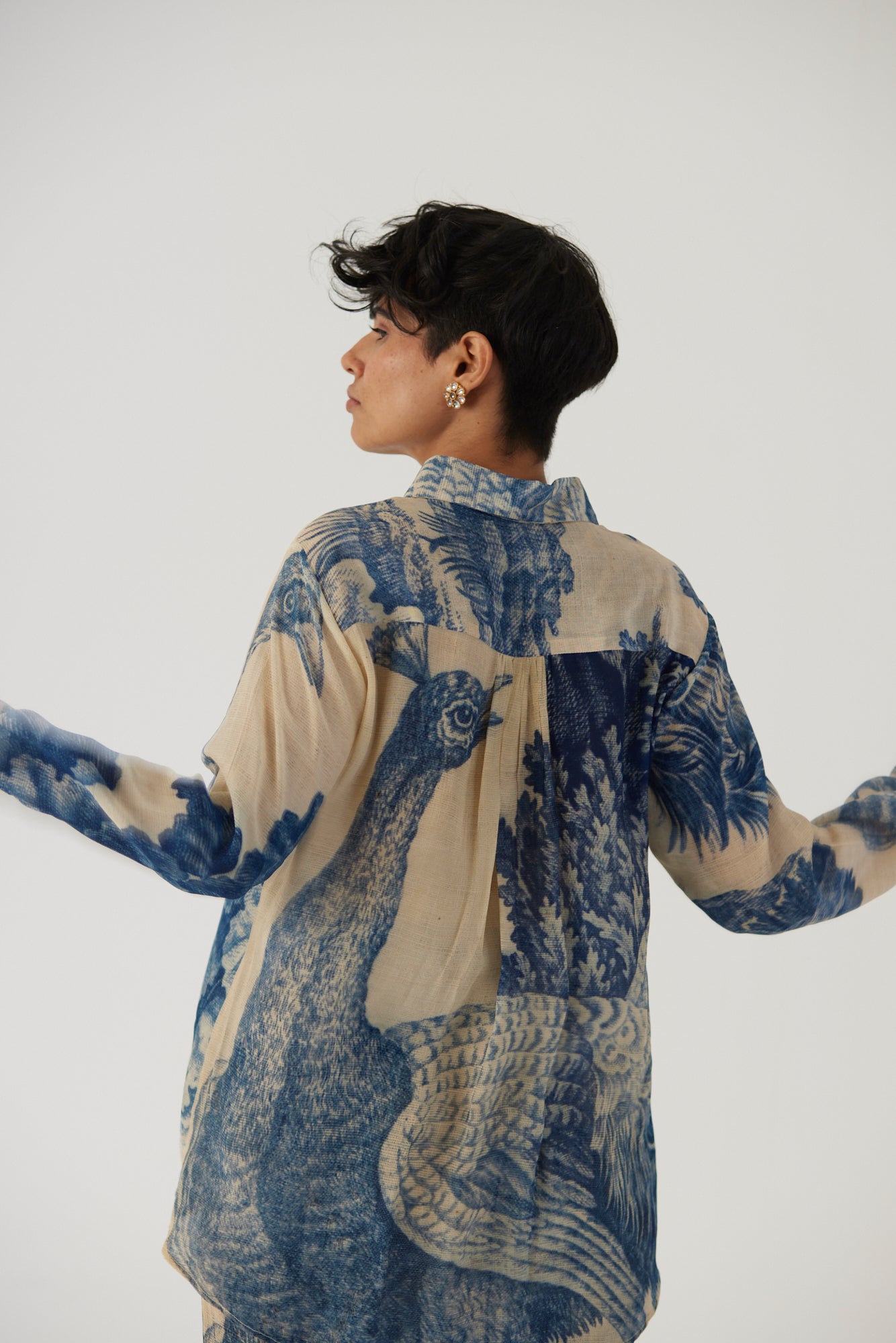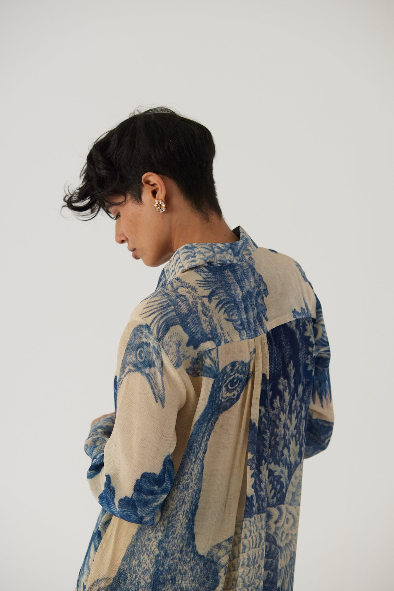 This print features a MOR(peacock) with intricate details and bold lines in the indigo colour.