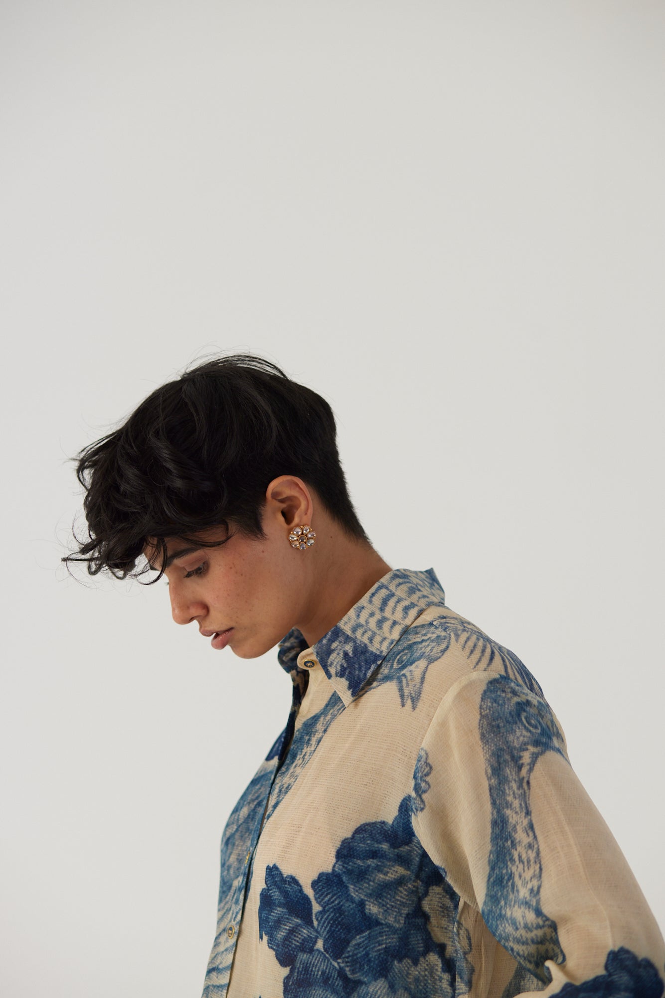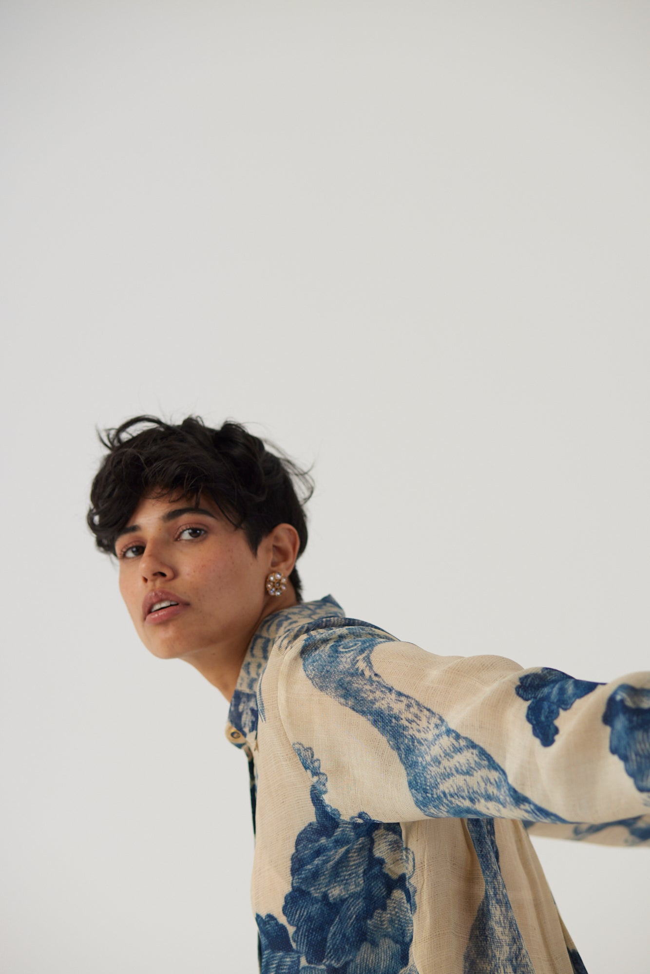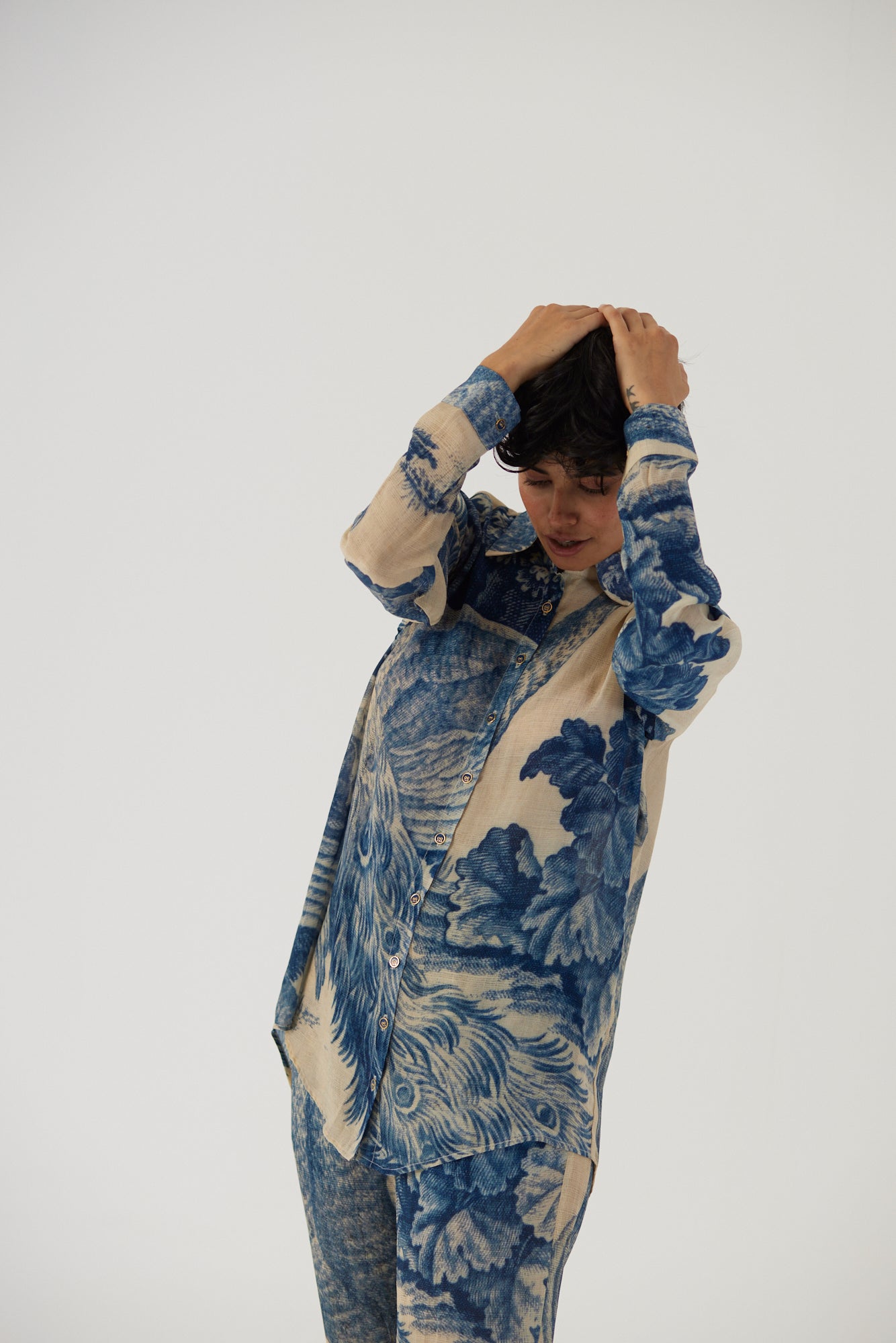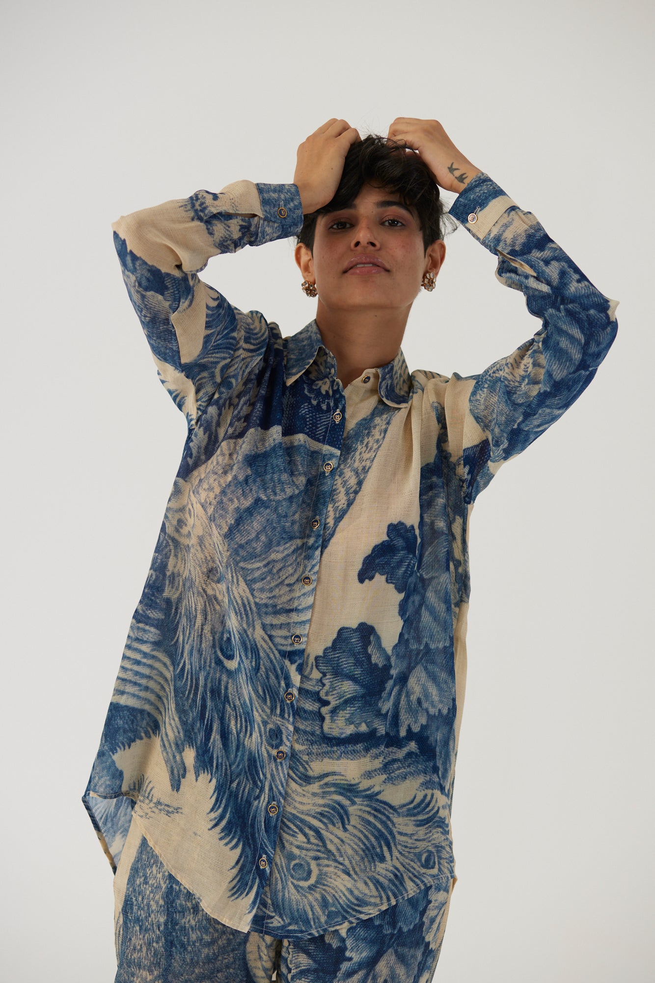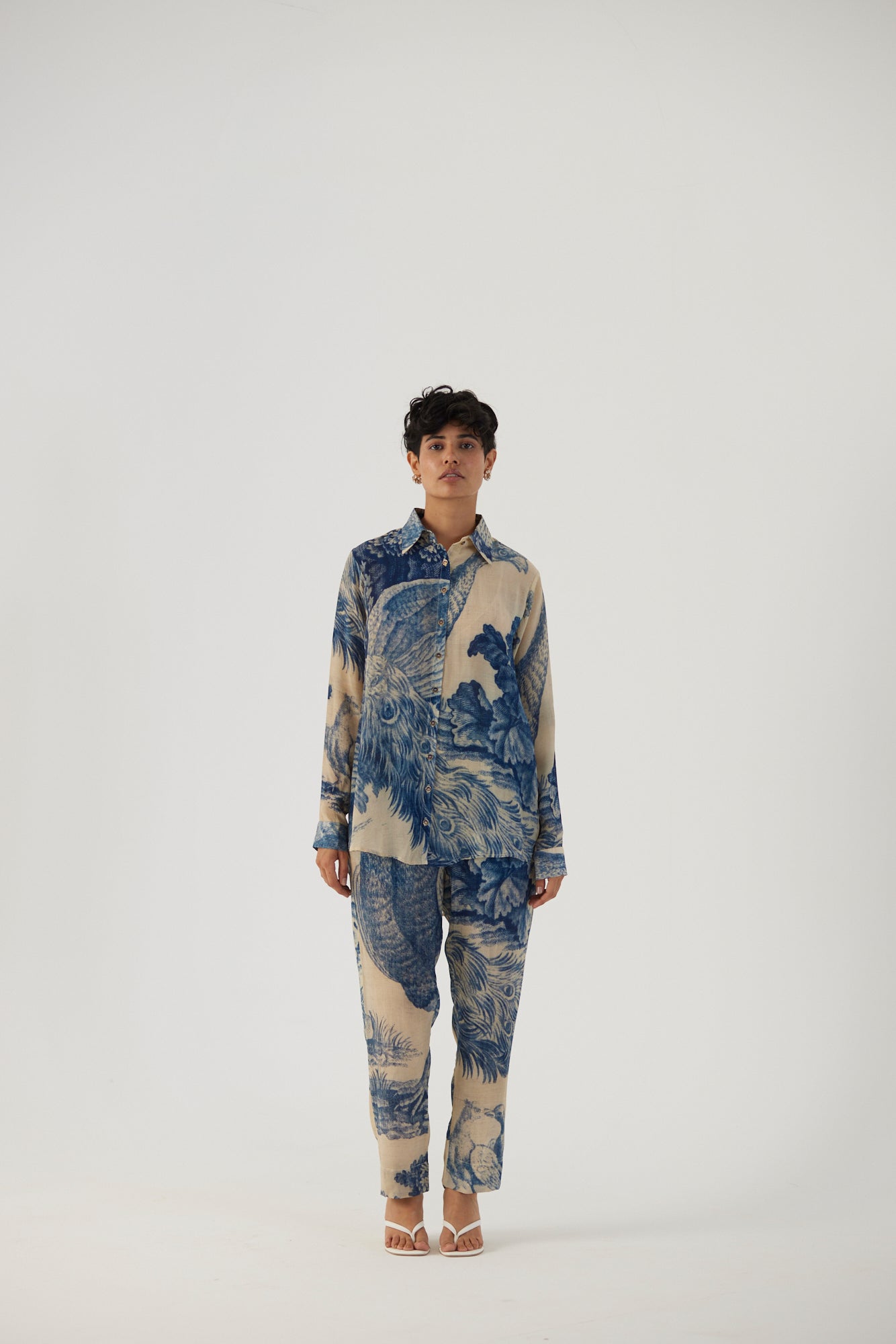 This print features a MOR(peacock) with intricate details and bold lines in the indigo colour.