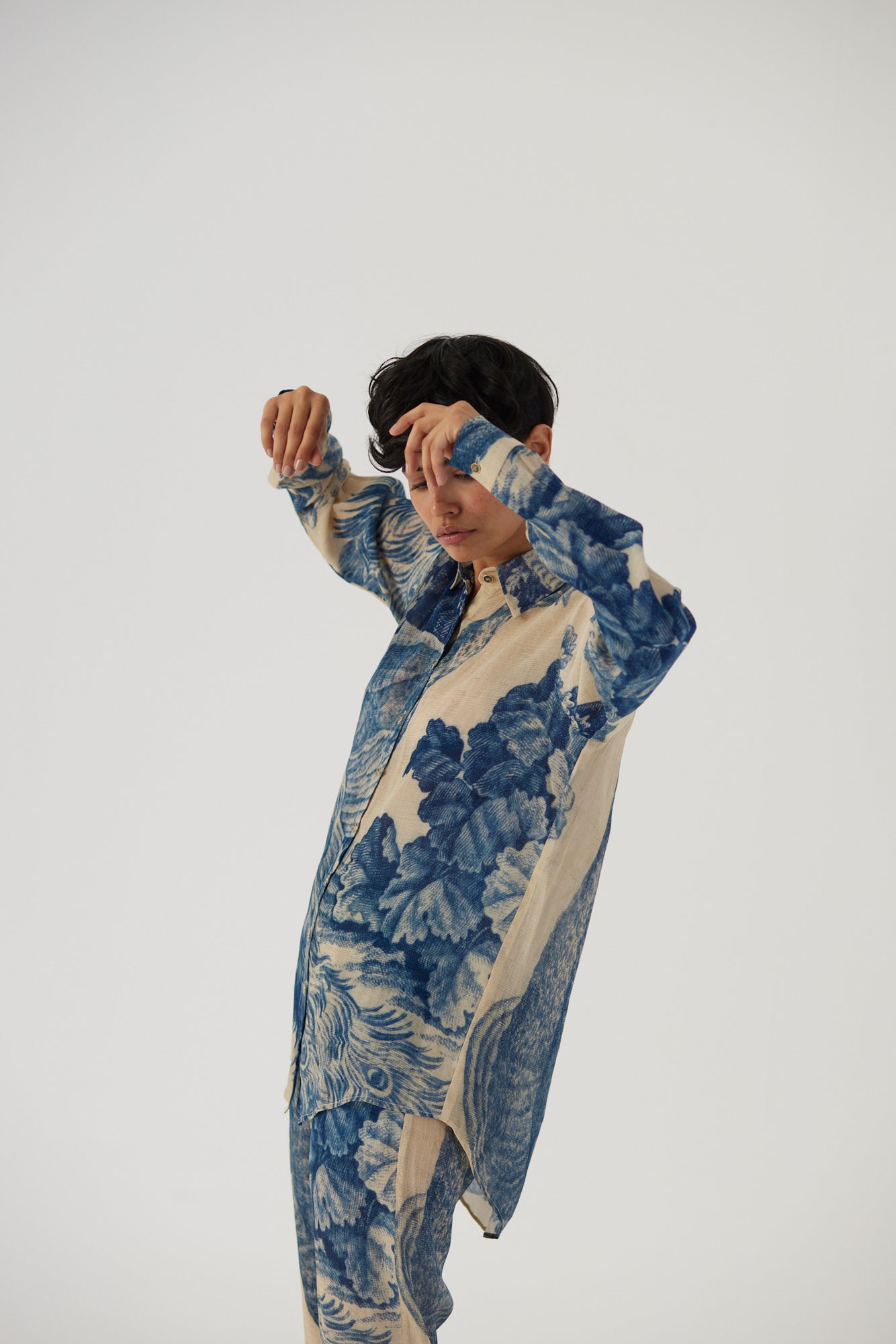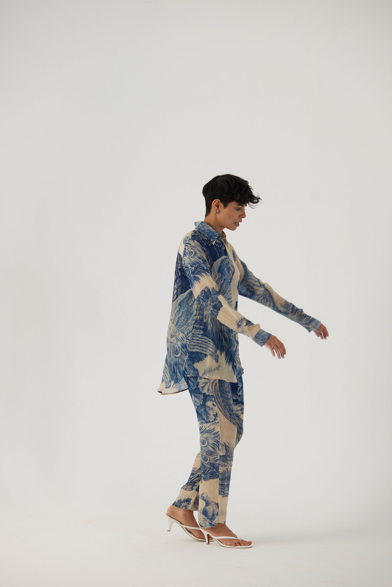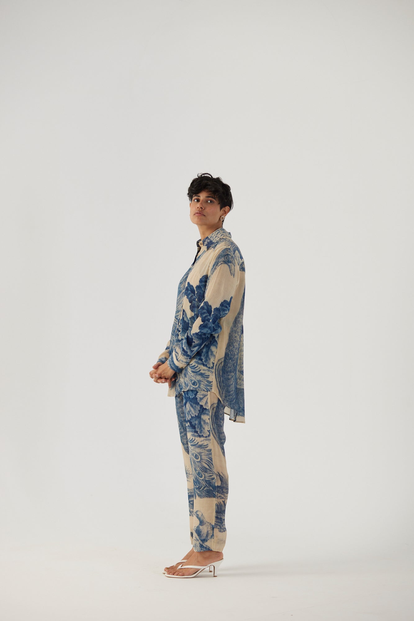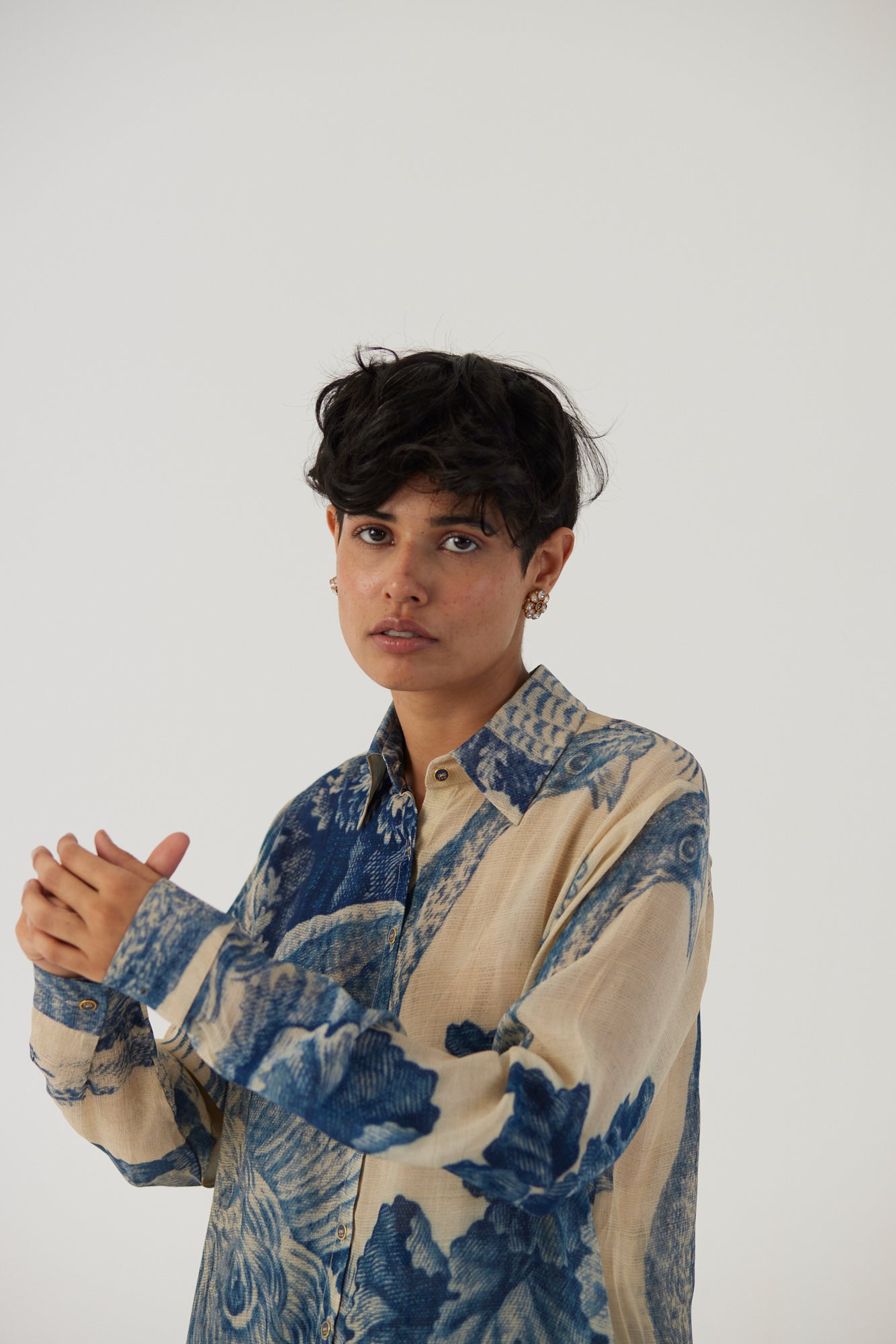 This print features a MOR(peacock) with intricate details and bold lines in the indigo colour.