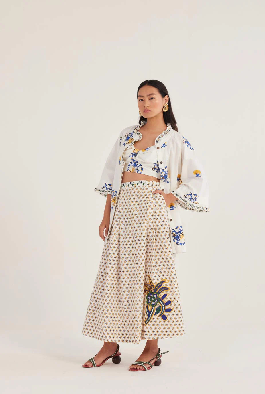 Our draped bralette features delicate embroidery on the straps. Pair it with our Tora skirt to complete the look.